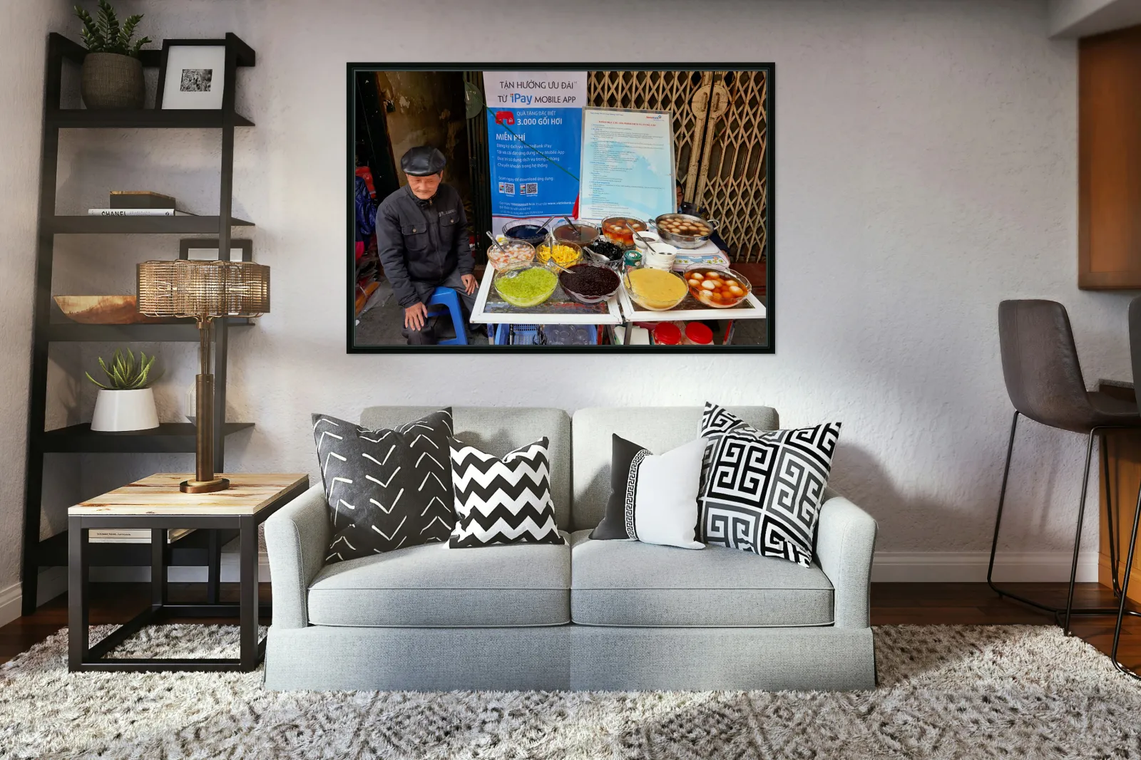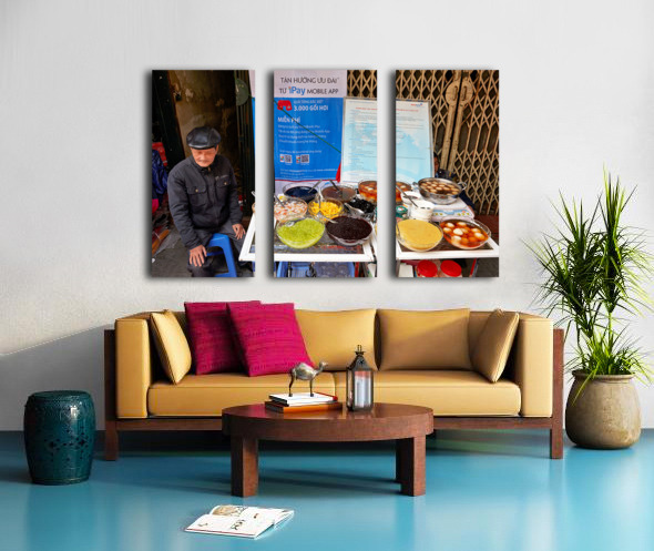 A vendor sits by a table full of colorful desserts in Hanoi Vietnam. Customers gather around to buy treats and enjoy local snacks.