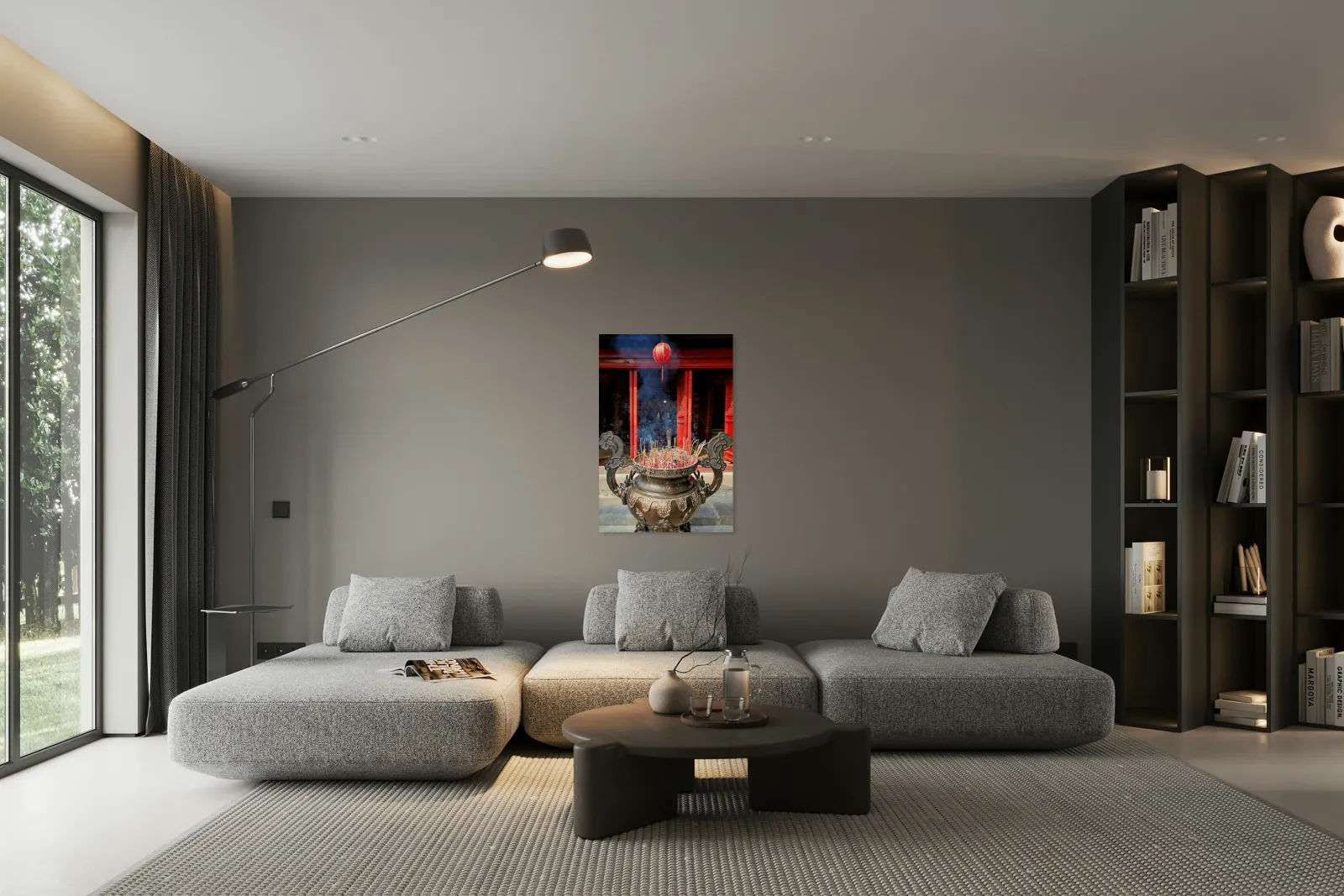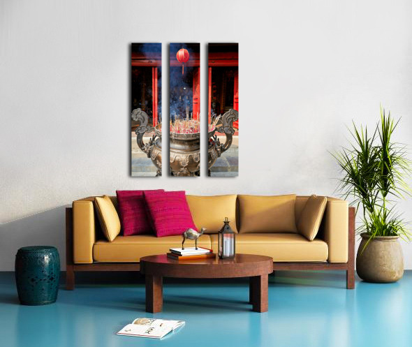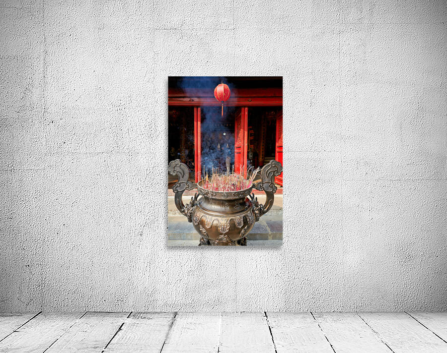 "Hanoi temple features incense burner and lanterns in Vietnam" in a framed print.