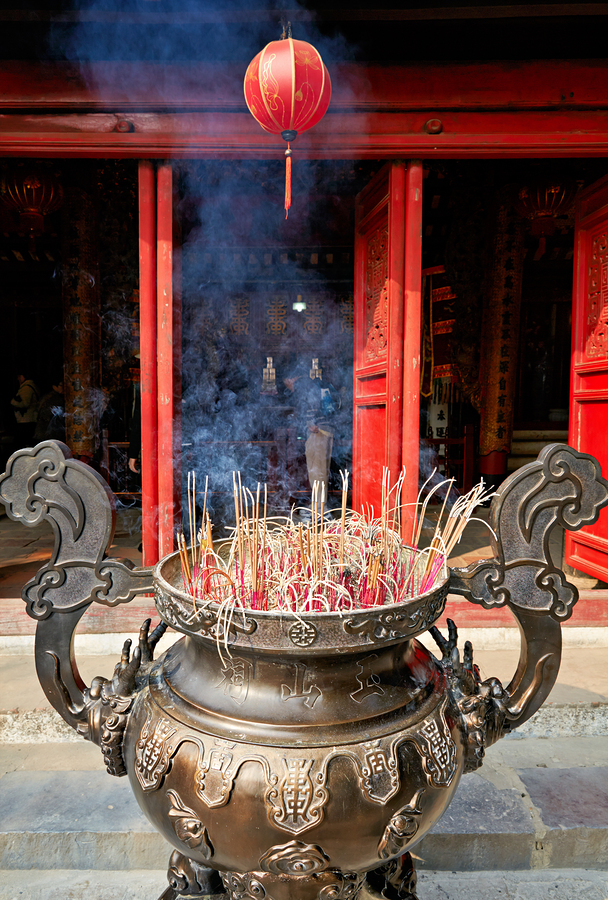 Visitors watch smoke rise from an incense burner outside a temple in Hanoi Vietnam during a busy day filled with cultural activity.
