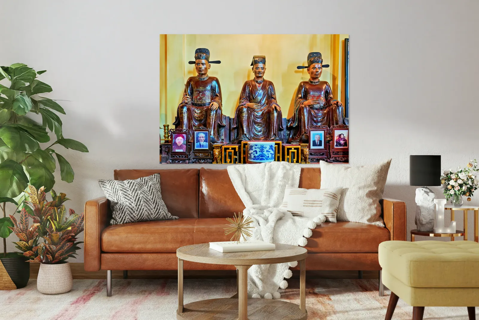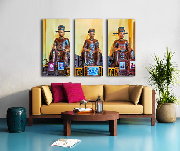 Three wooden statues sit in a shrine in Hanoi. They represent important figures in Vietnamese culture. Pictures are placed in front of them.