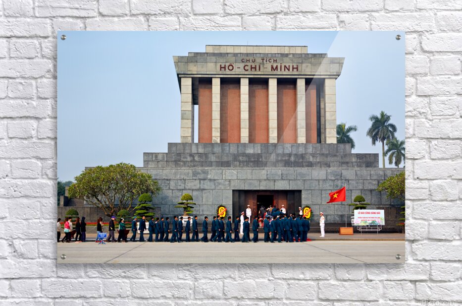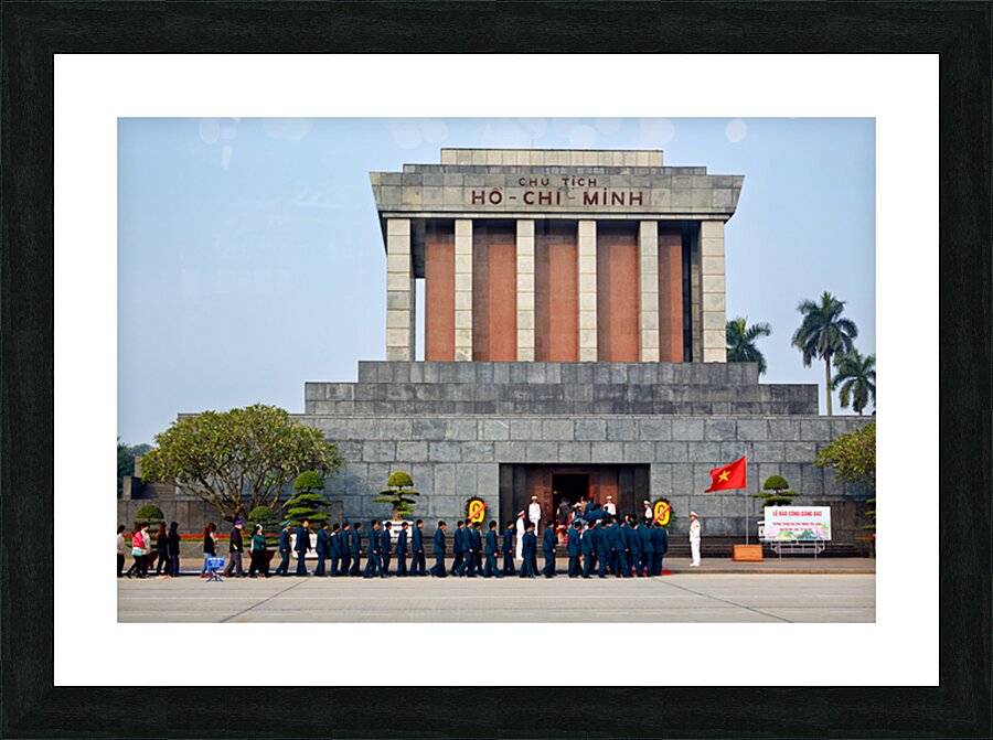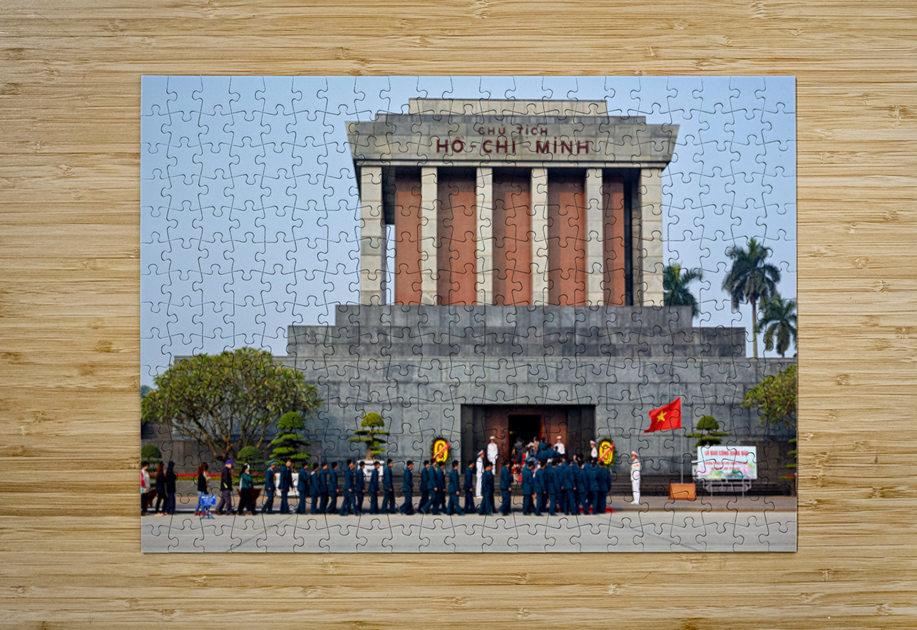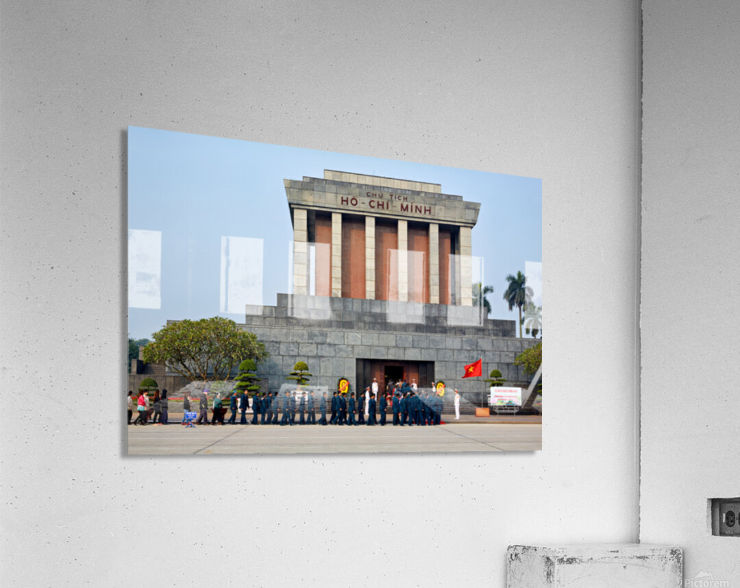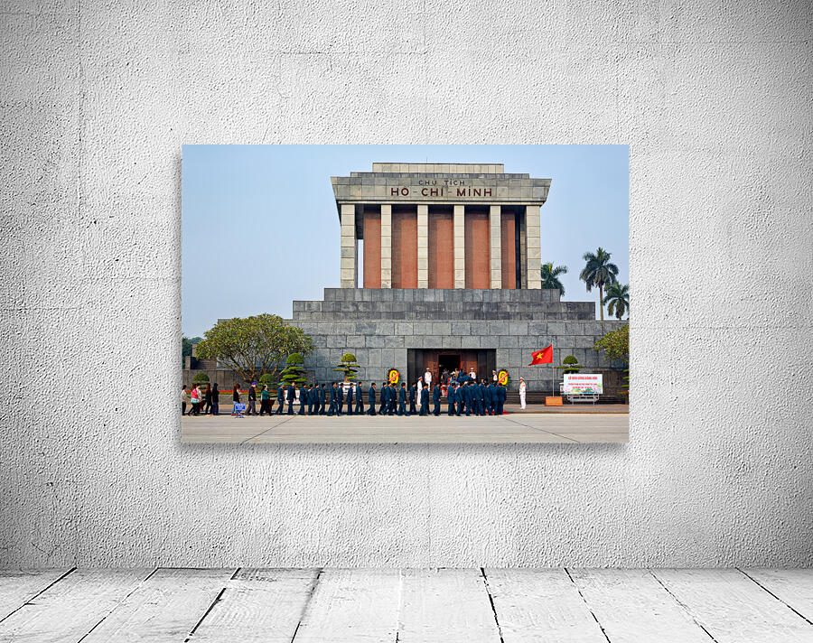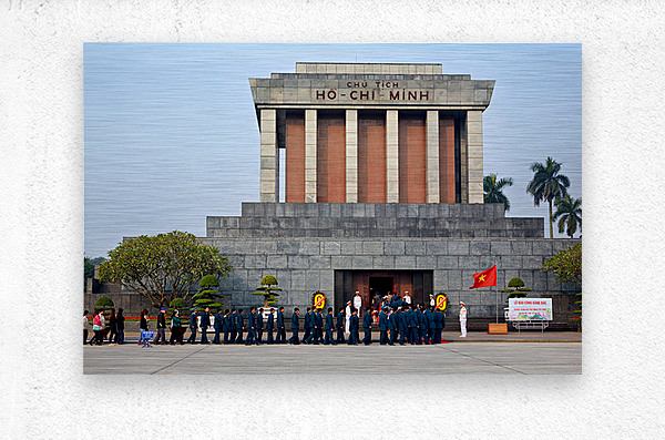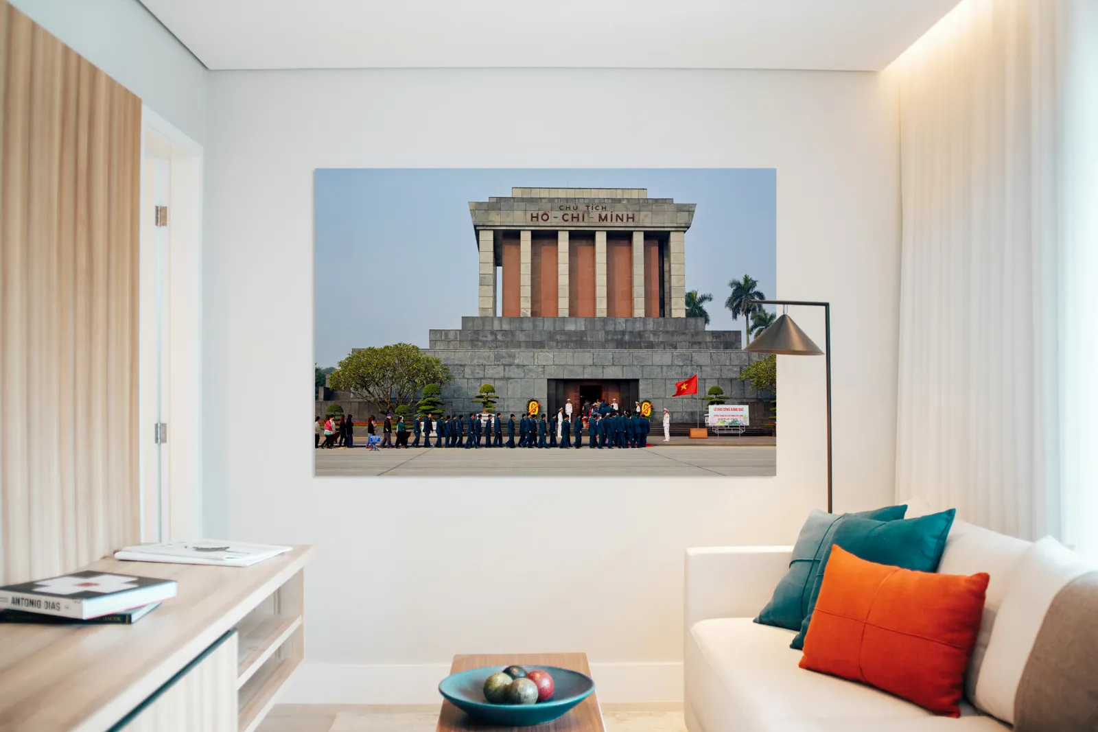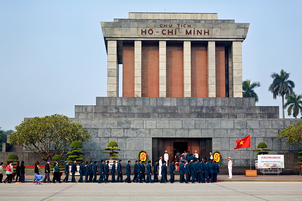 People stand in line to pay respects at Ho Chi Minh Mausoleum in Hanoi during a clear day with trees and guards nearby.