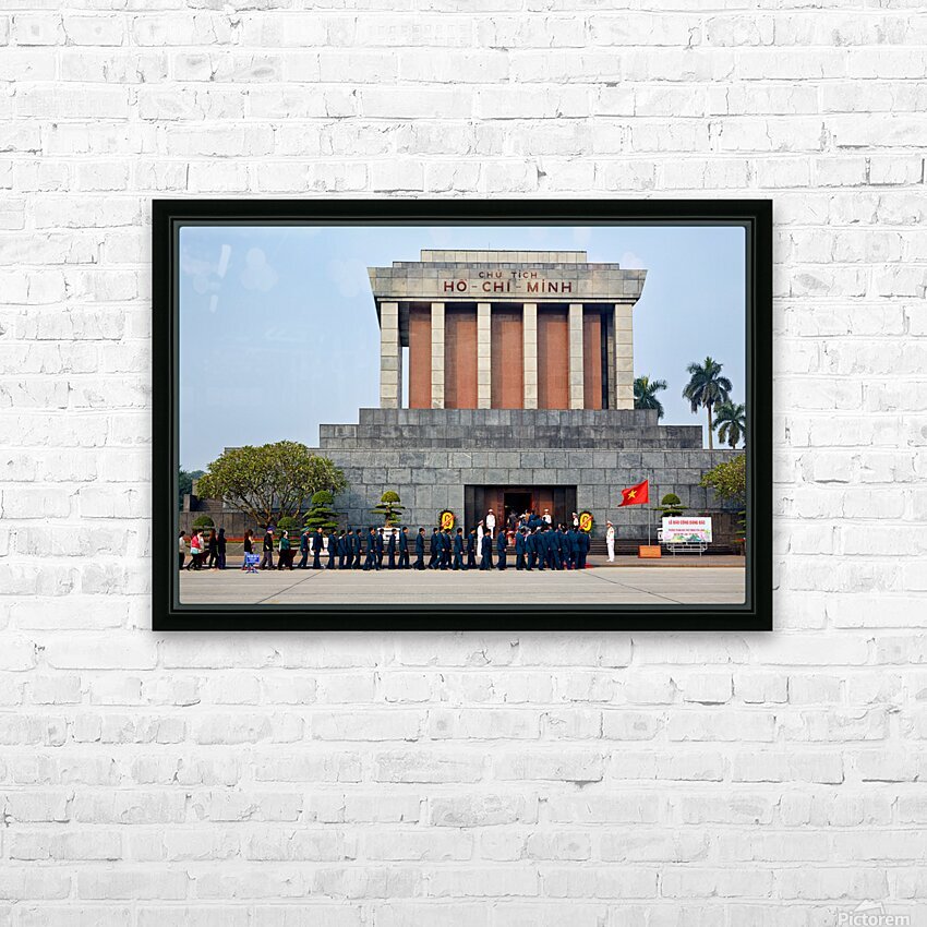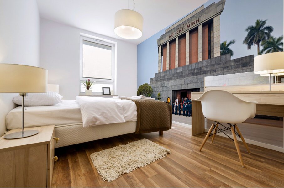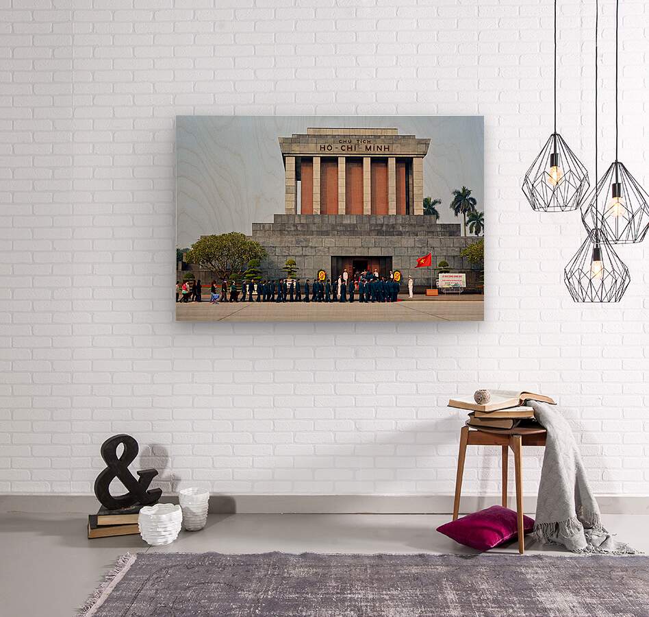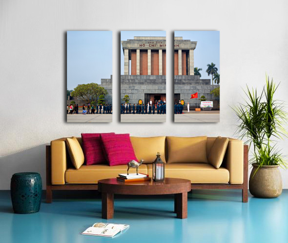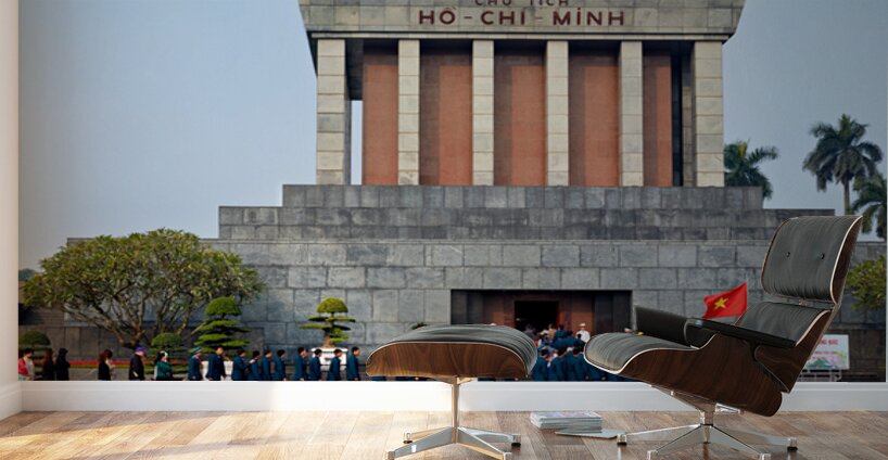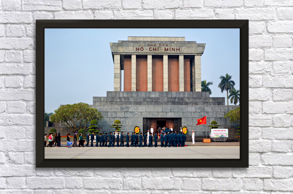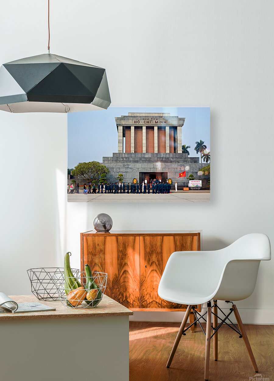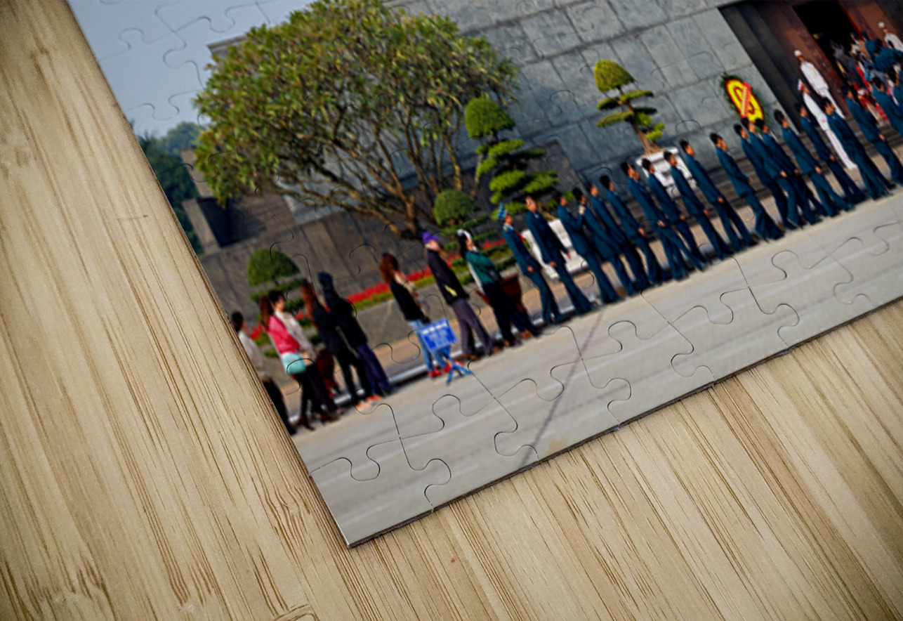 People stand in line to pay respects at Ho Chi Minh Mausoleum in Hanoi during a clear day with trees and guards nearby.