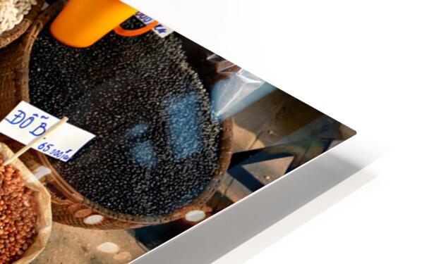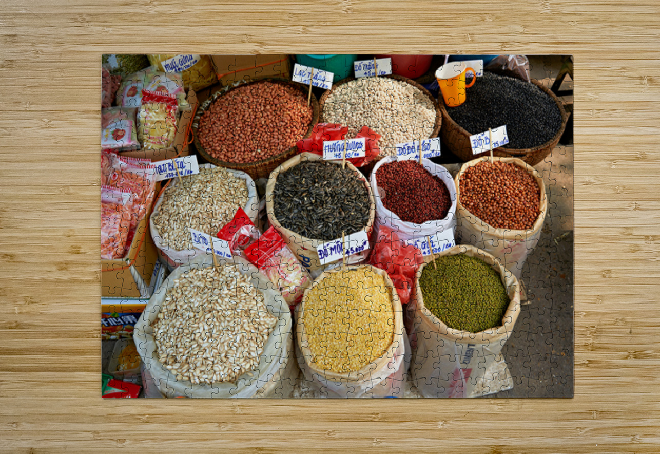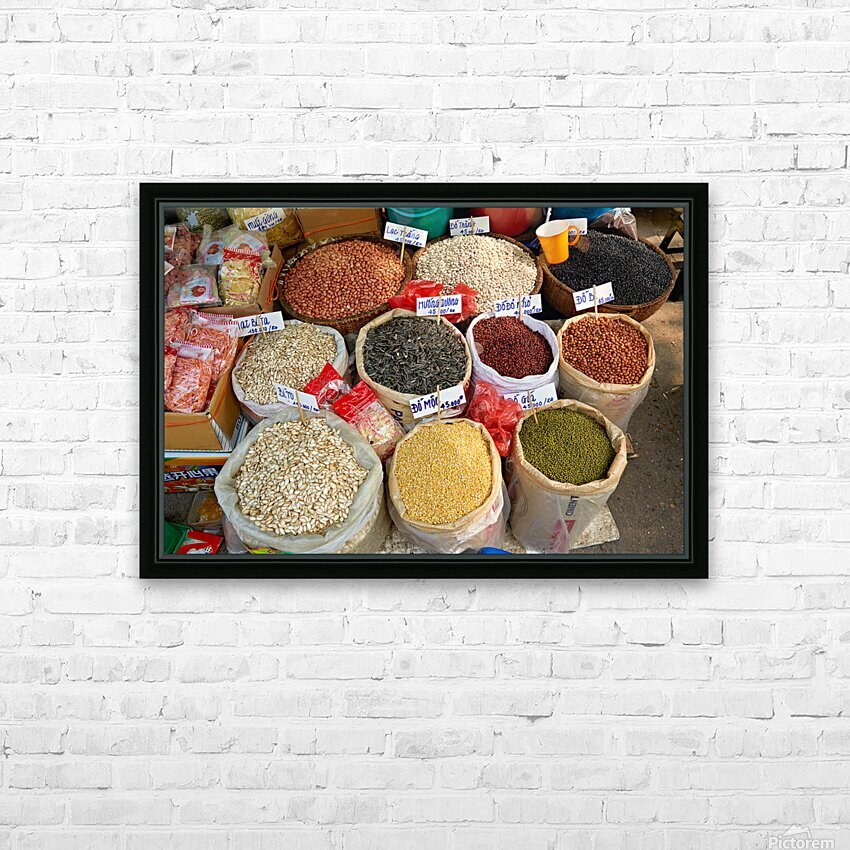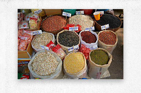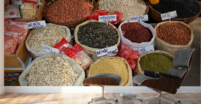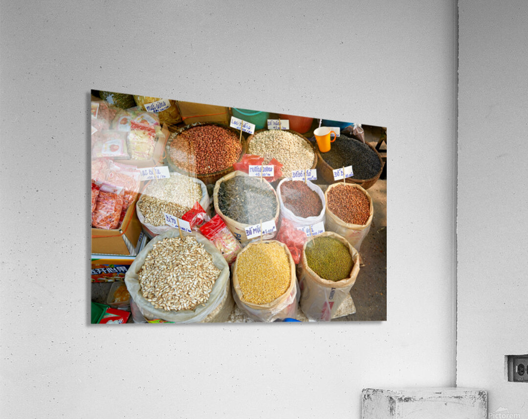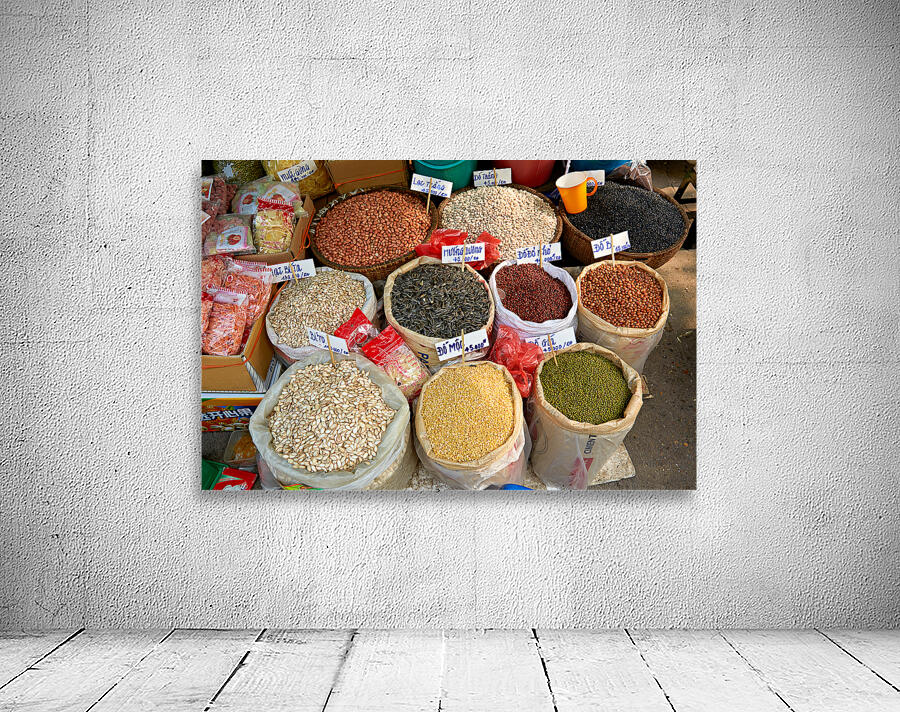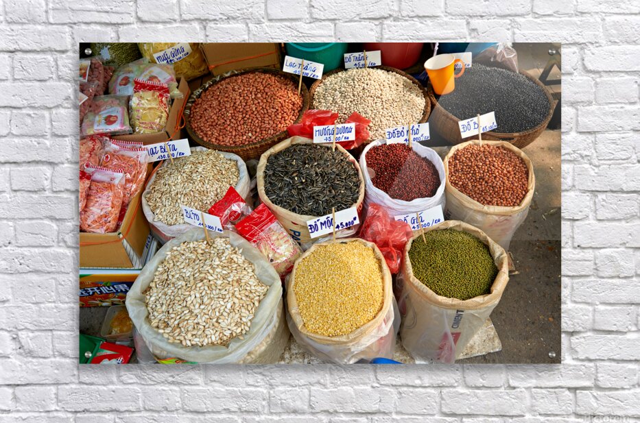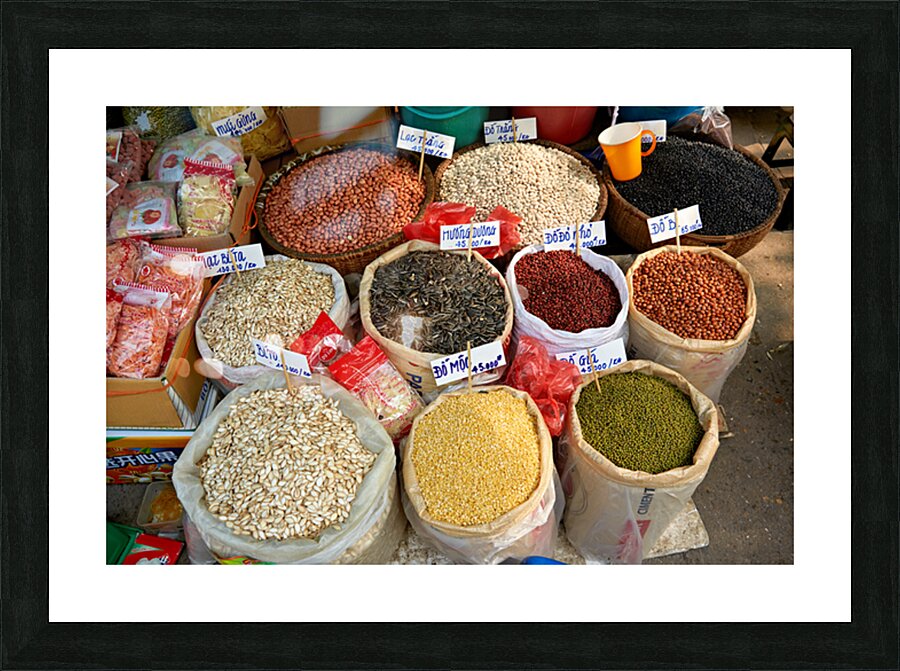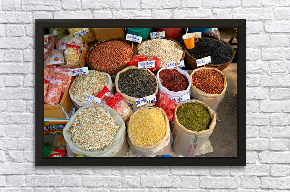 "Market scene with beans and grains in Hanoi" in a framed print.