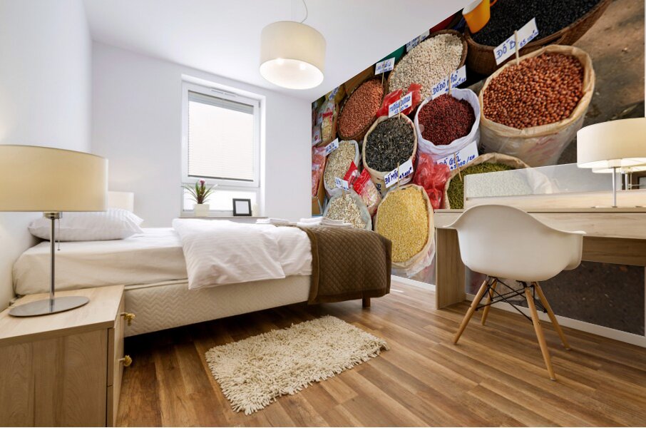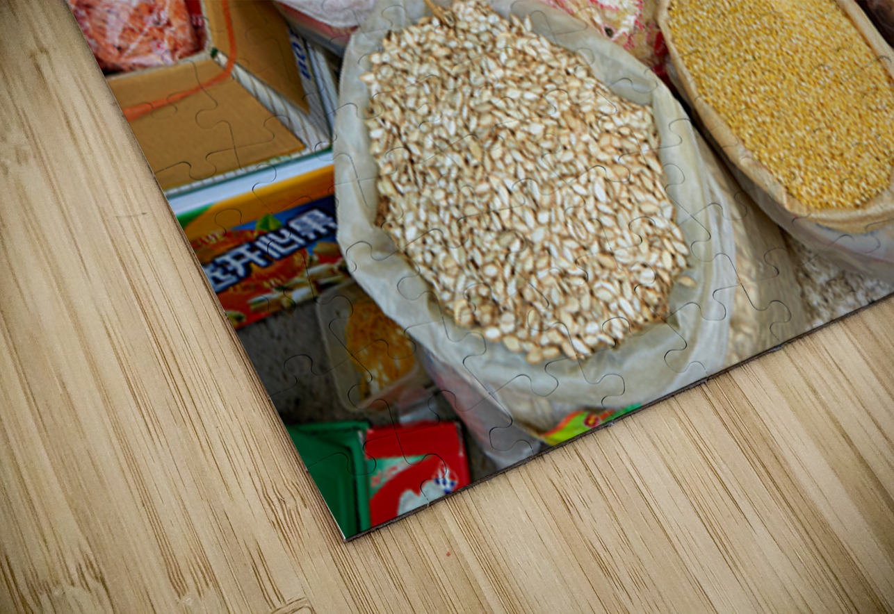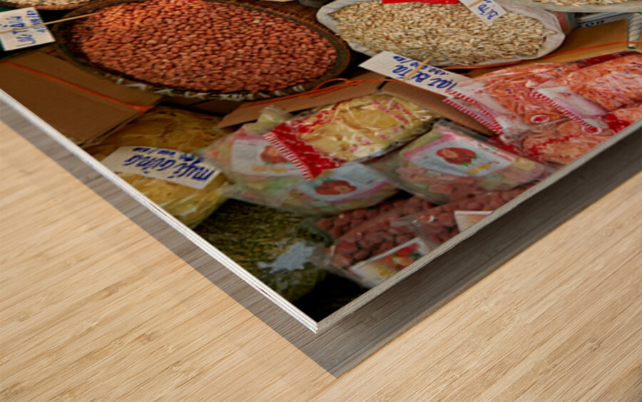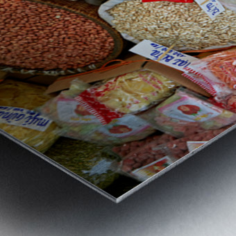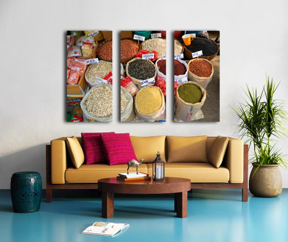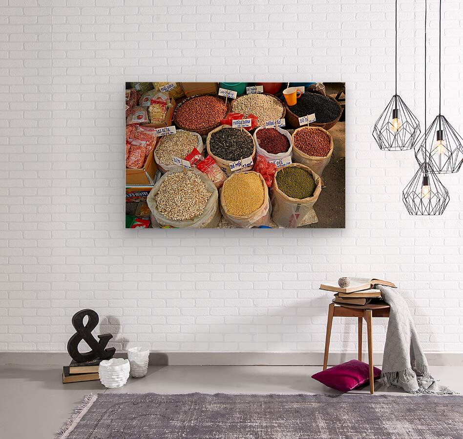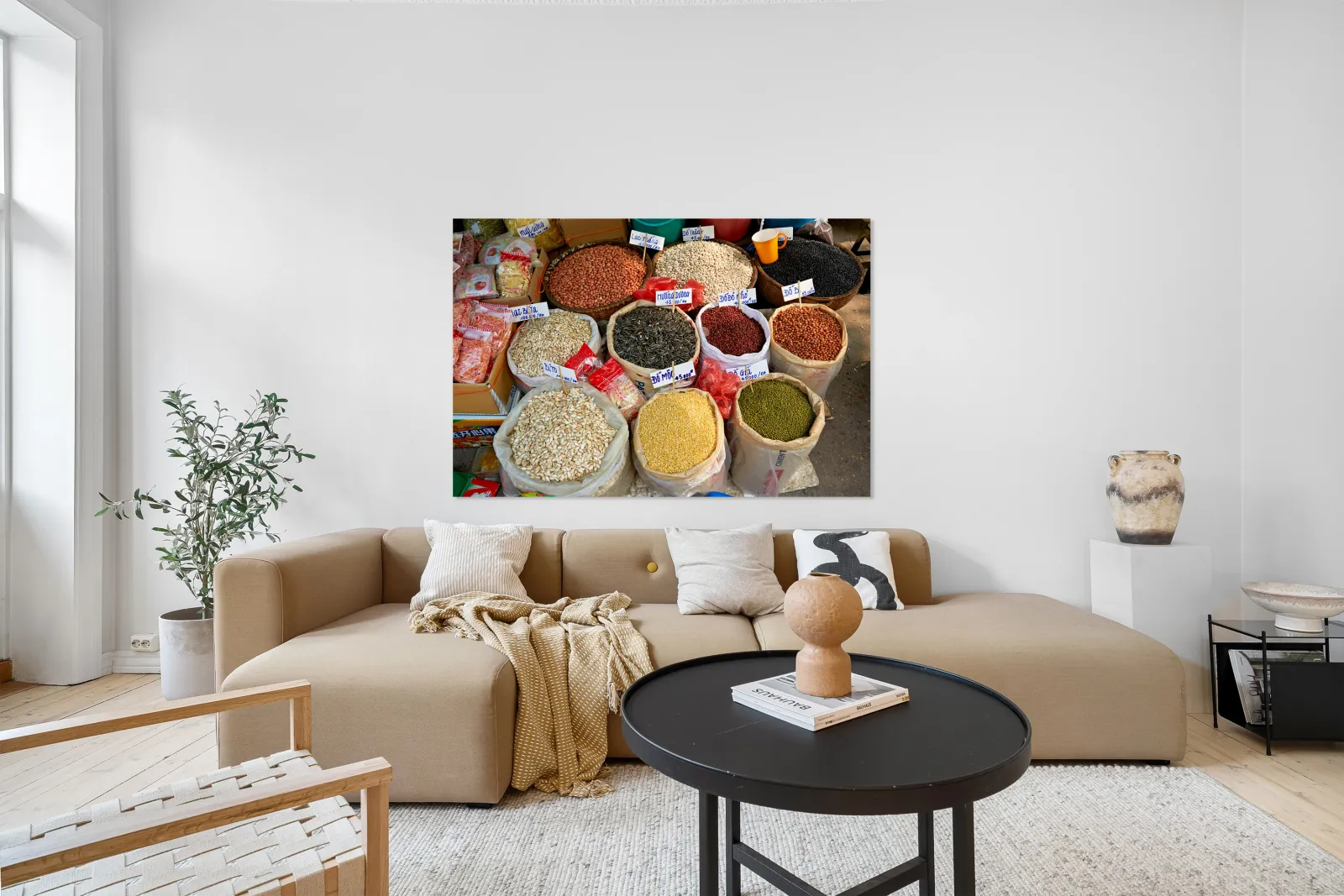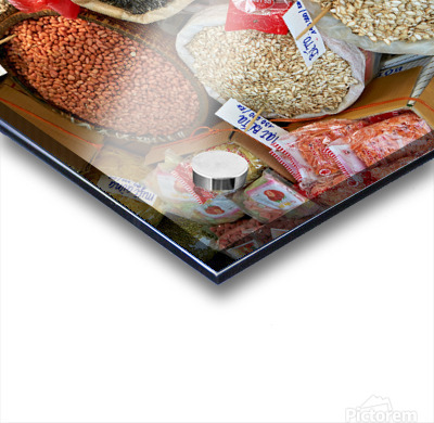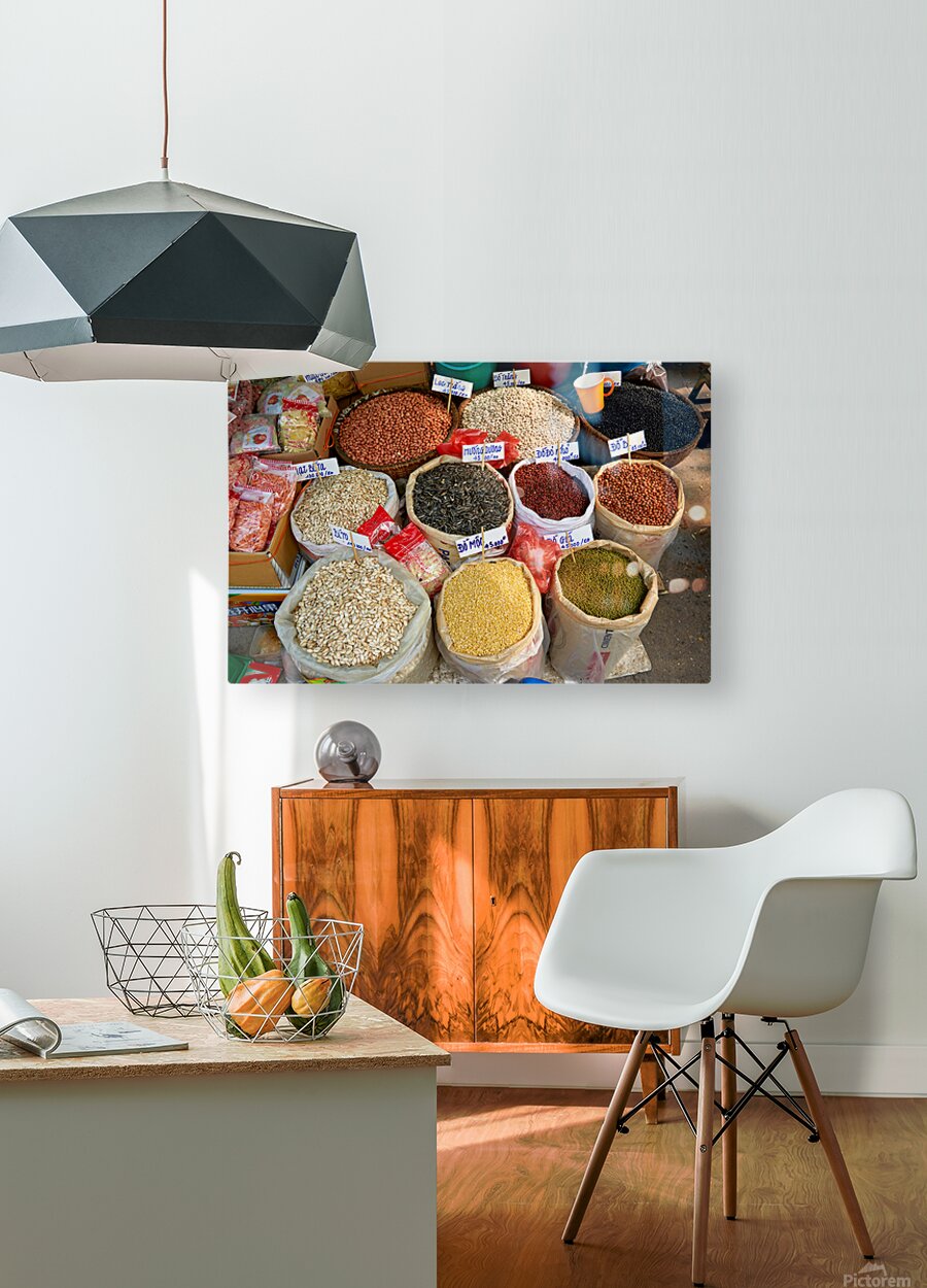 "Market scene with beans and grains in Hanoi" in a framed print.