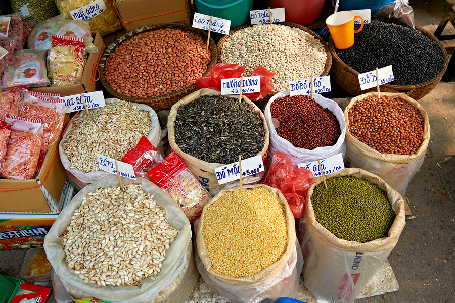 Containers filled with various beans and grains are displayed at a market in Hanoi during the daytime. Vendors sell local produce.