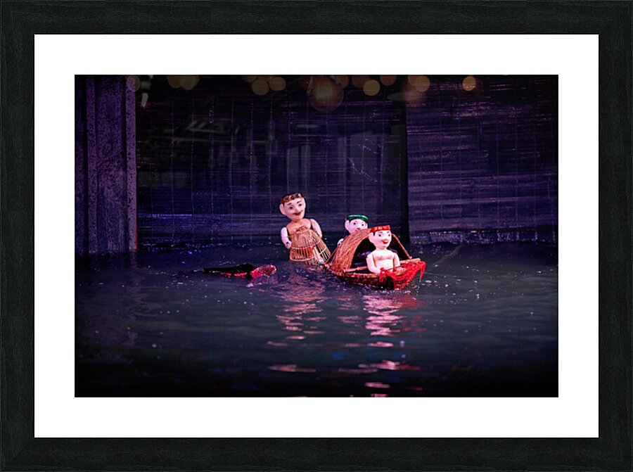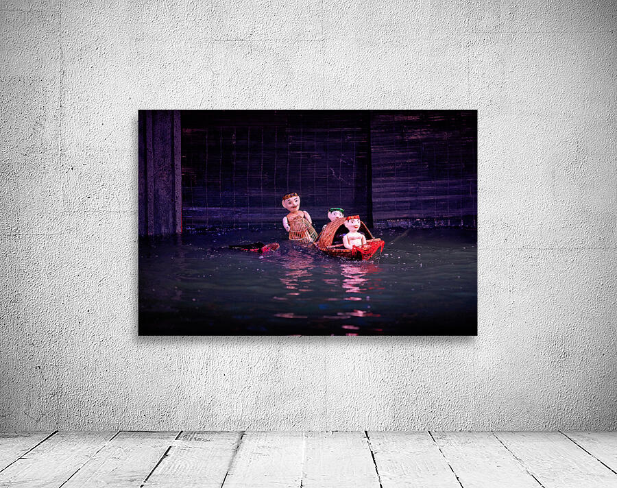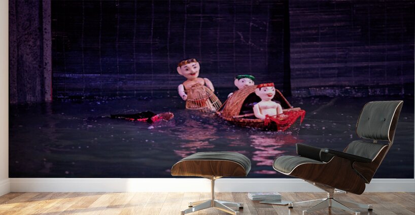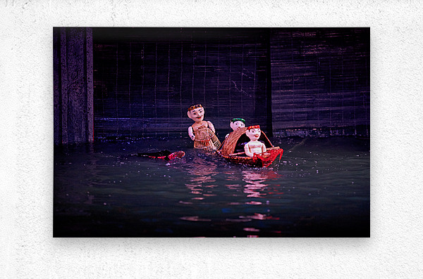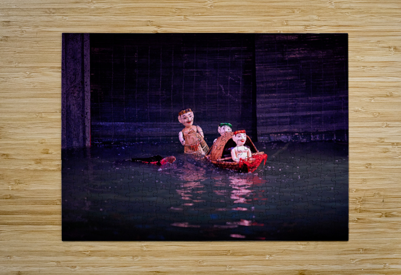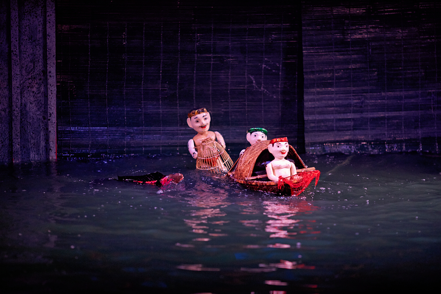 Water puppets perform on a small stage in Hanoi. The setting features traditional music and storytelling showcasing Vietnamese culture.