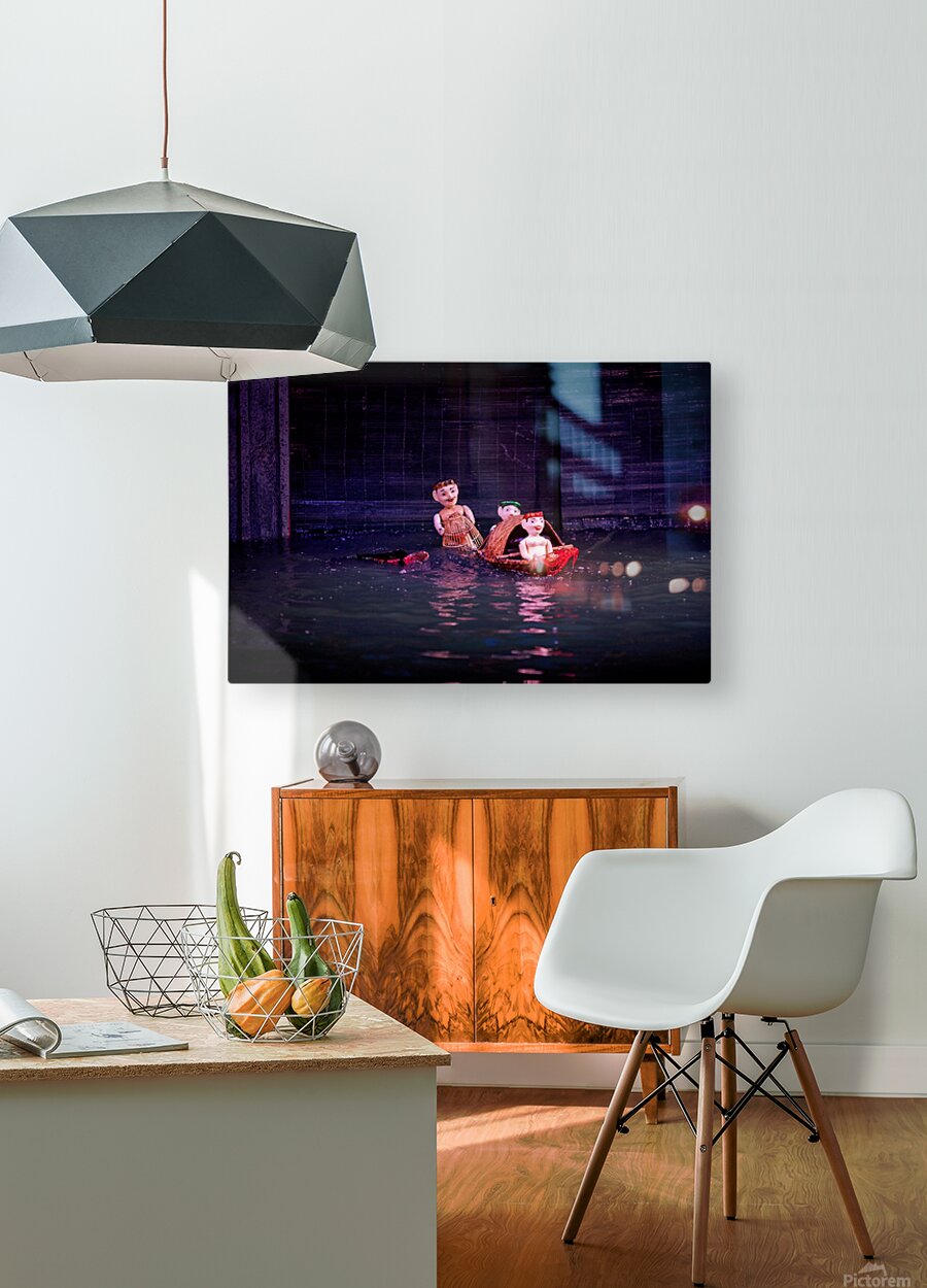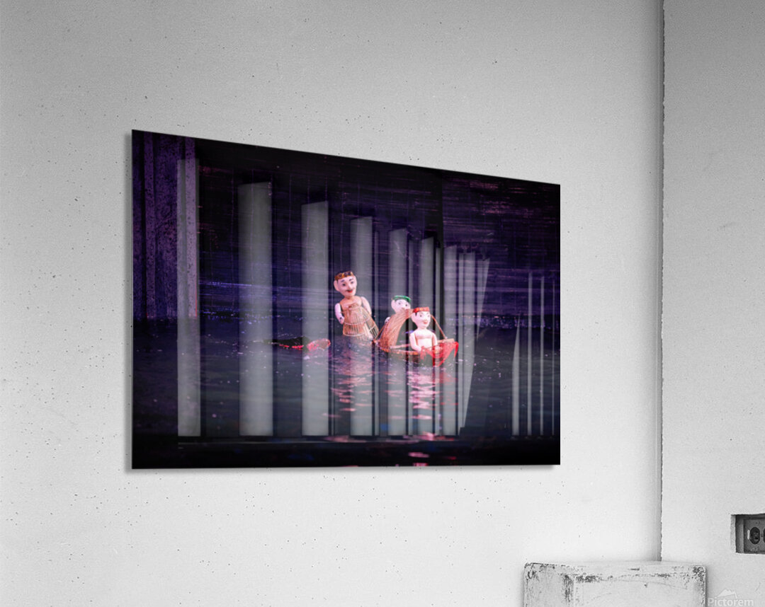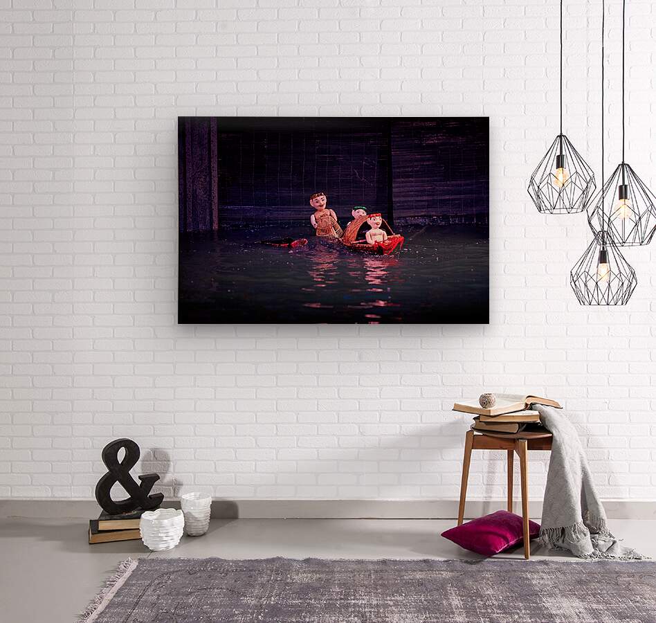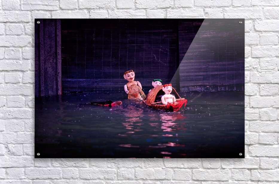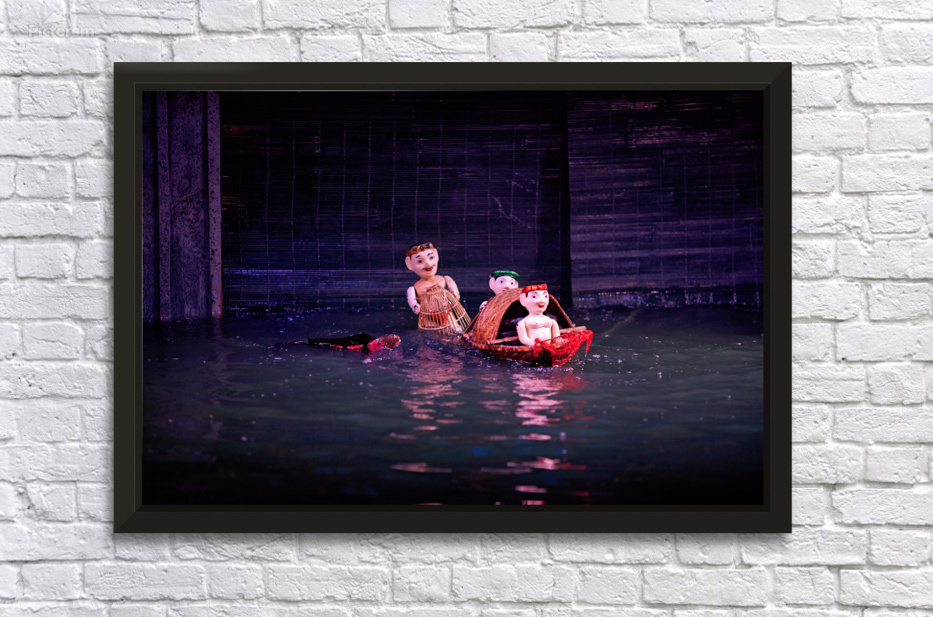 Water puppets perform on a small stage in Hanoi. The setting features traditional music and storytelling showcasing Vietnamese culture.