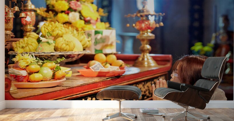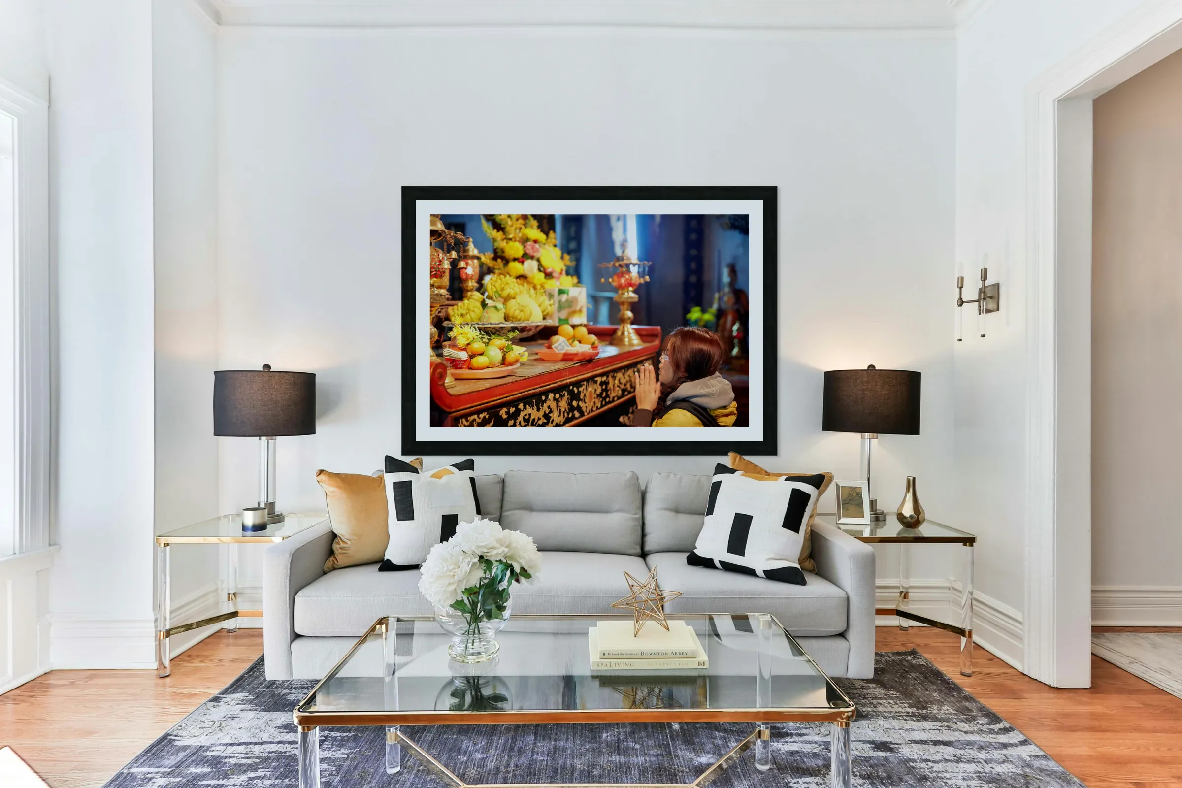 Get this artwork "Person offers prayers at altar with fruits in Ho Chi Minh" in a framed print.