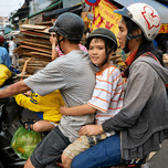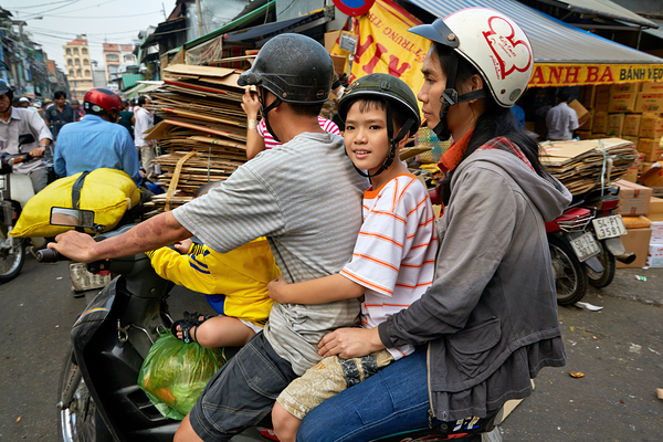 A family rides a motorbike in busy streets of Ho Chi Minh City filled with traffic and vendors. The children sit behind their parents.