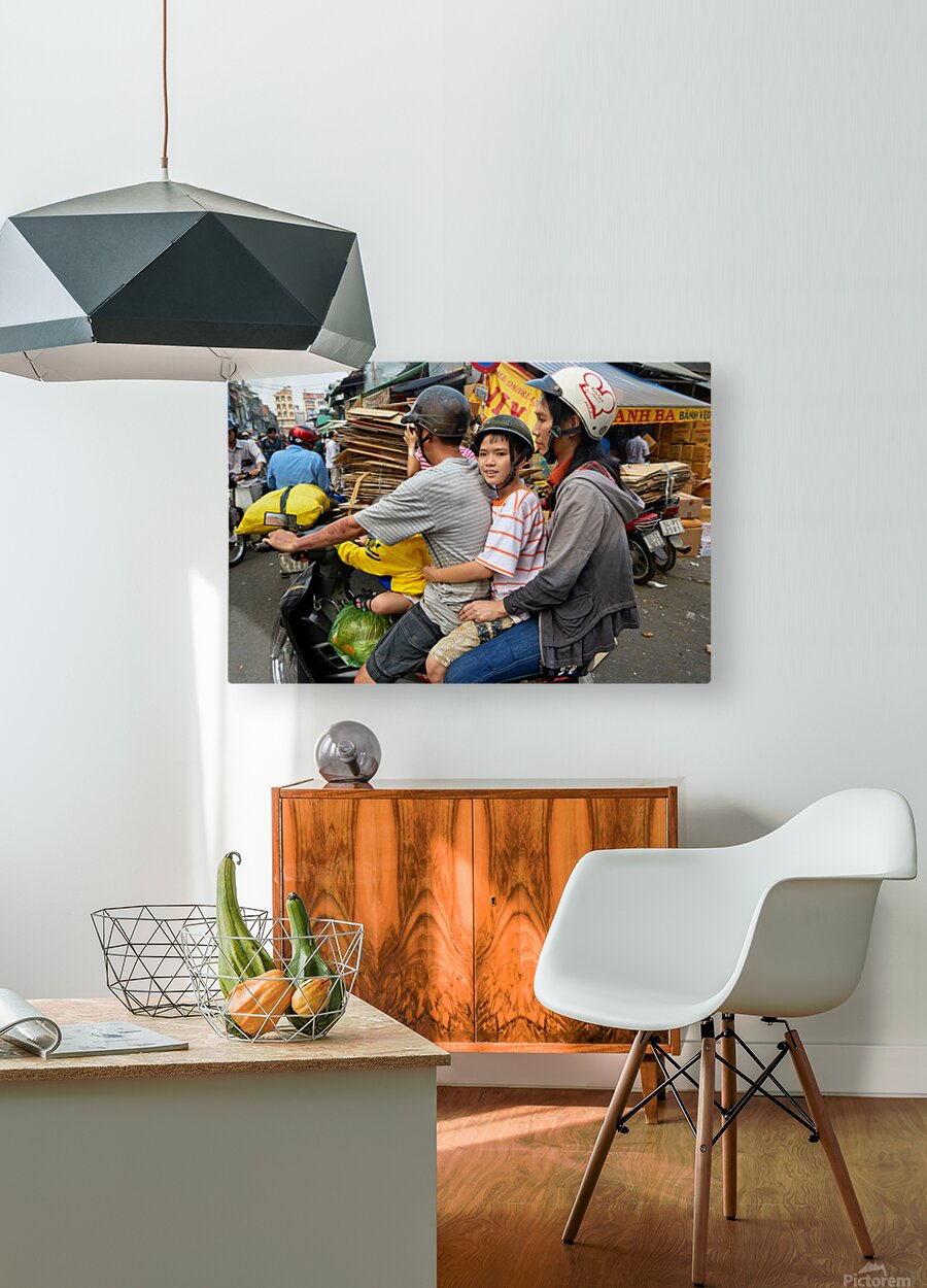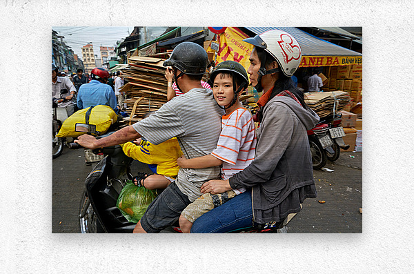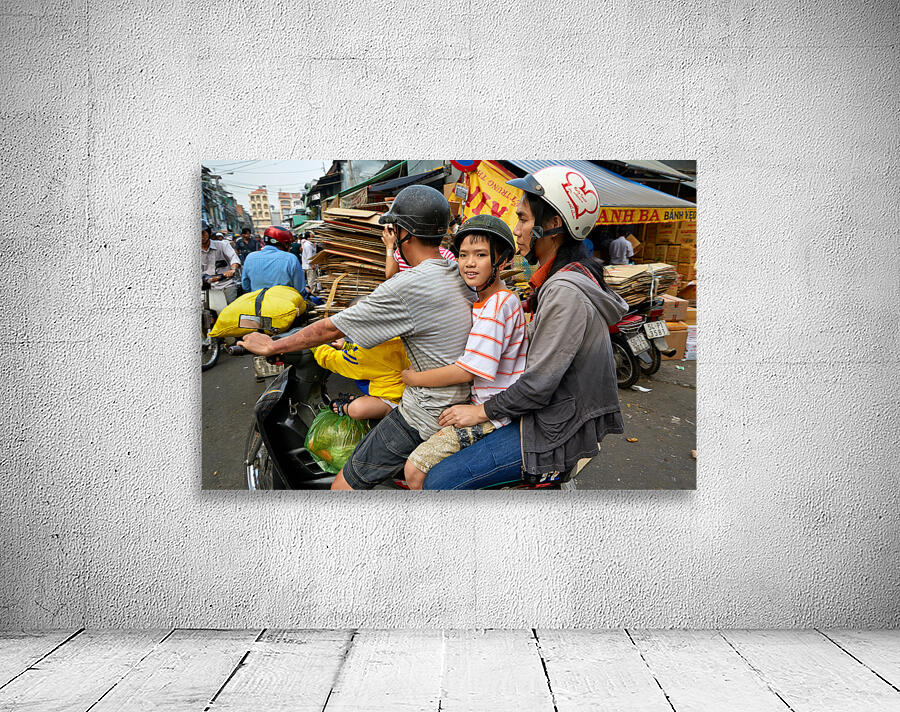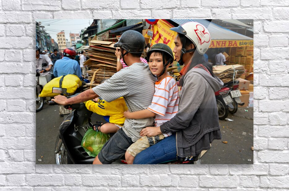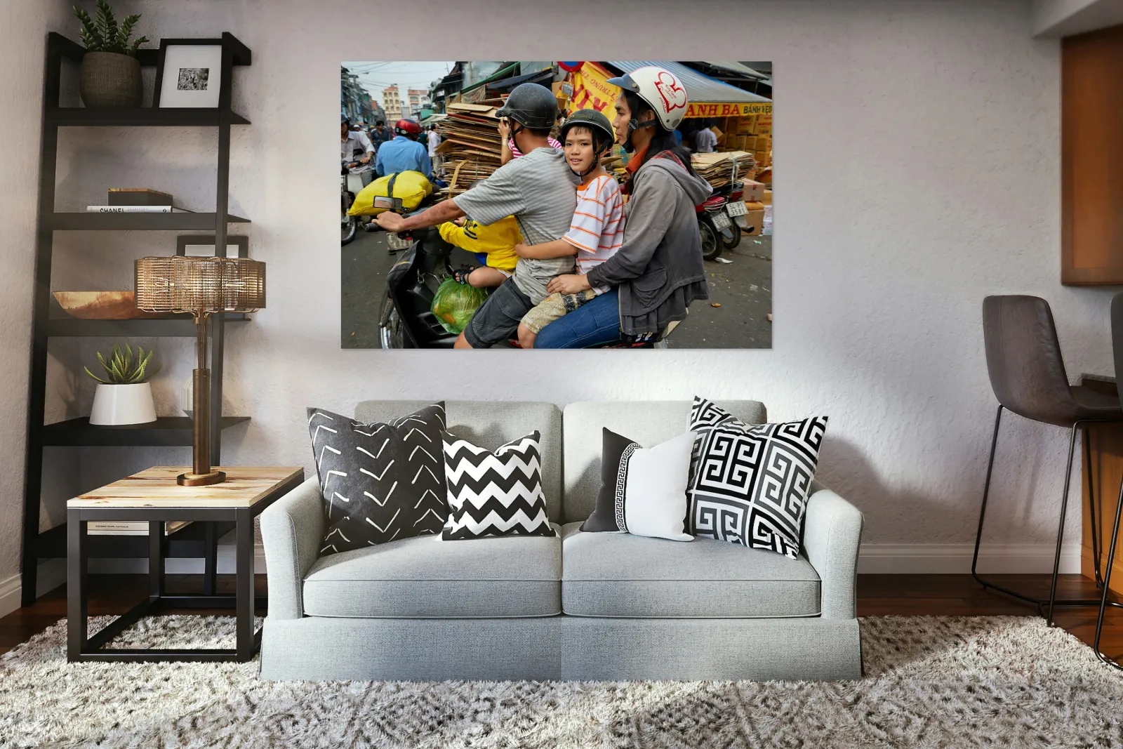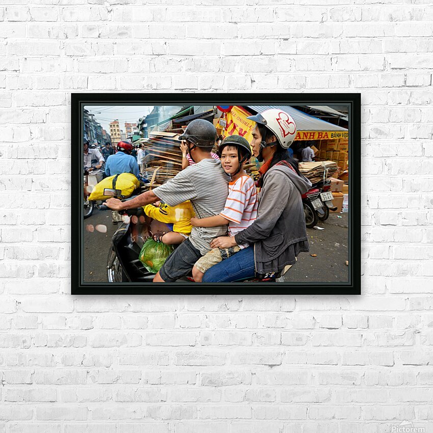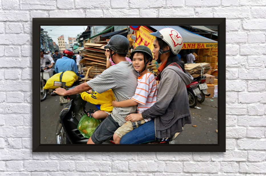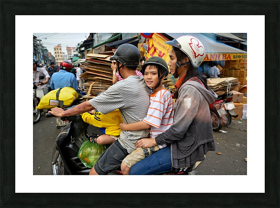 "Traffic in Ho Chi Minh City with a family on a motorbike" in a framed print.