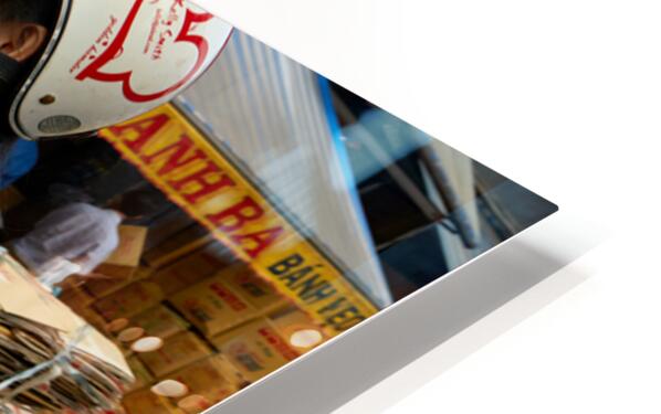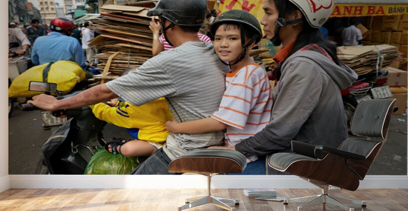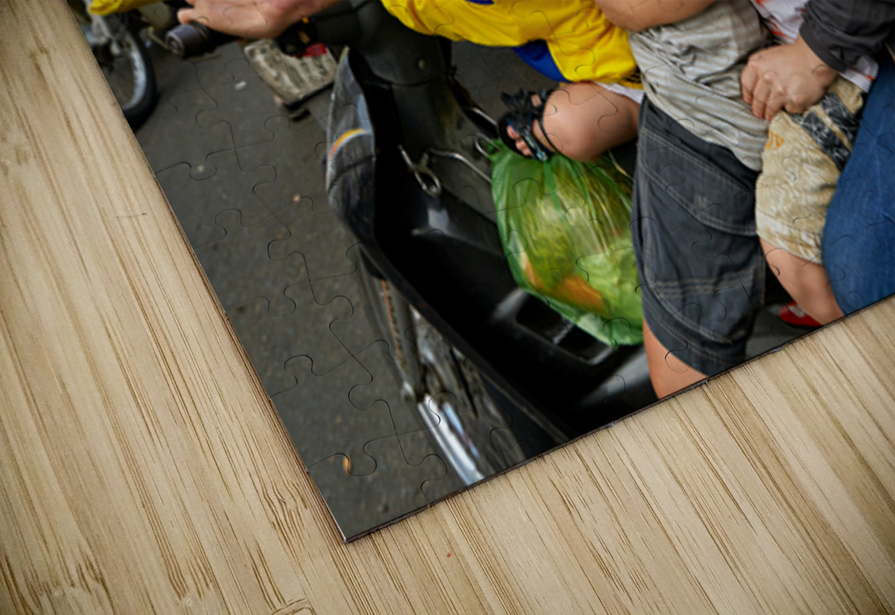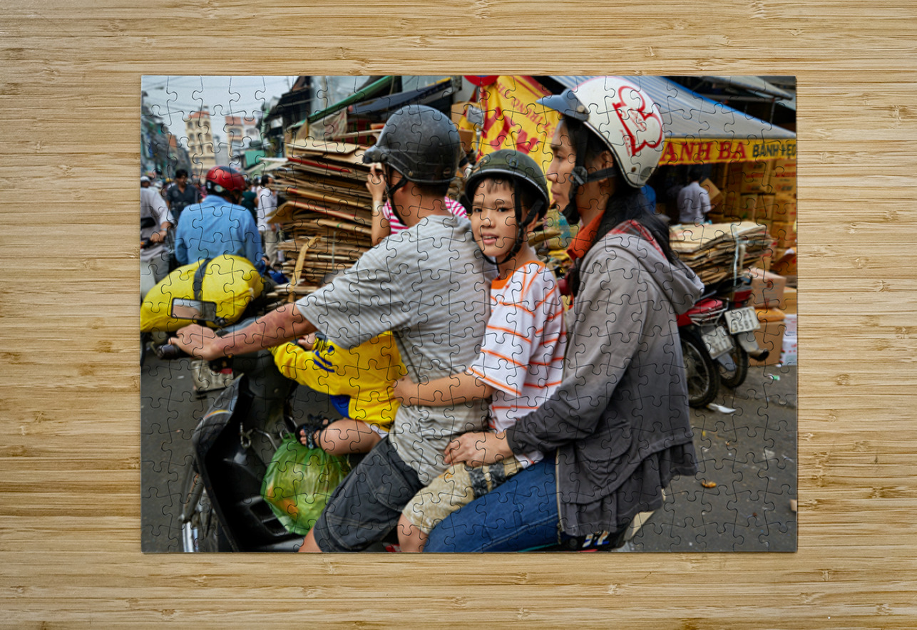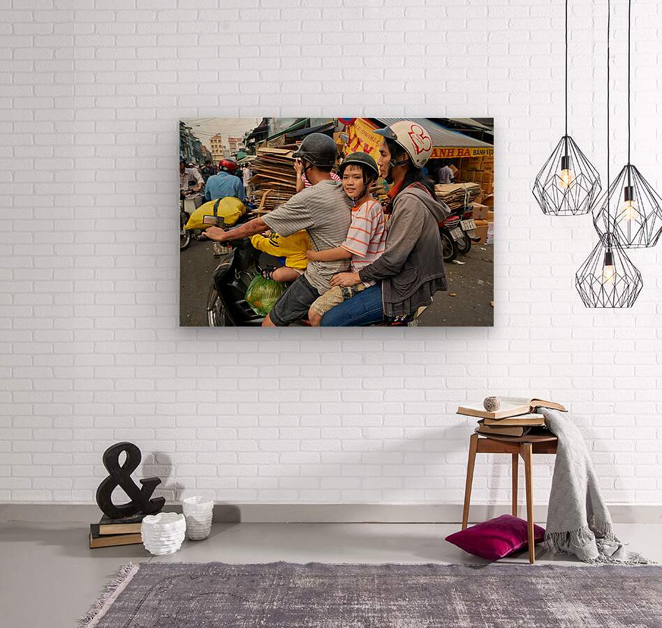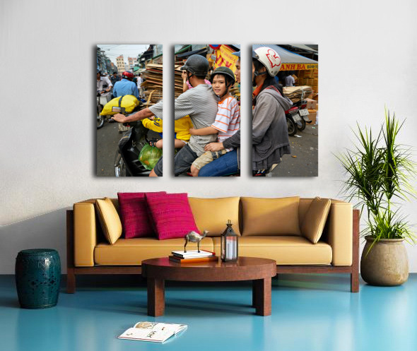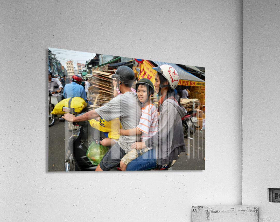 "Traffic in Ho Chi Minh City with a family on a motorbike" in a framed print.
