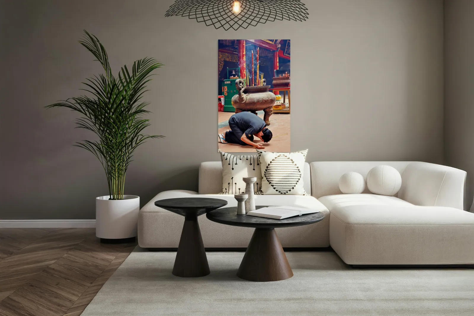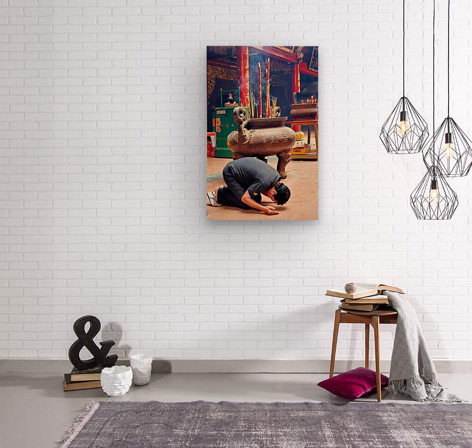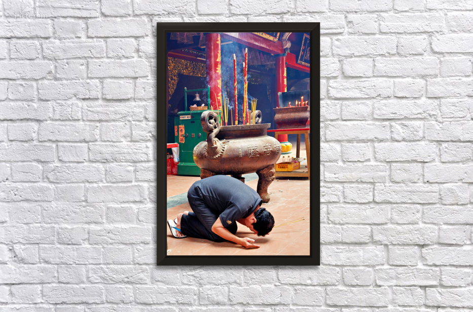 "Man praying at a shrine in Ho Chi Minh City Vietnam" in a framed print.