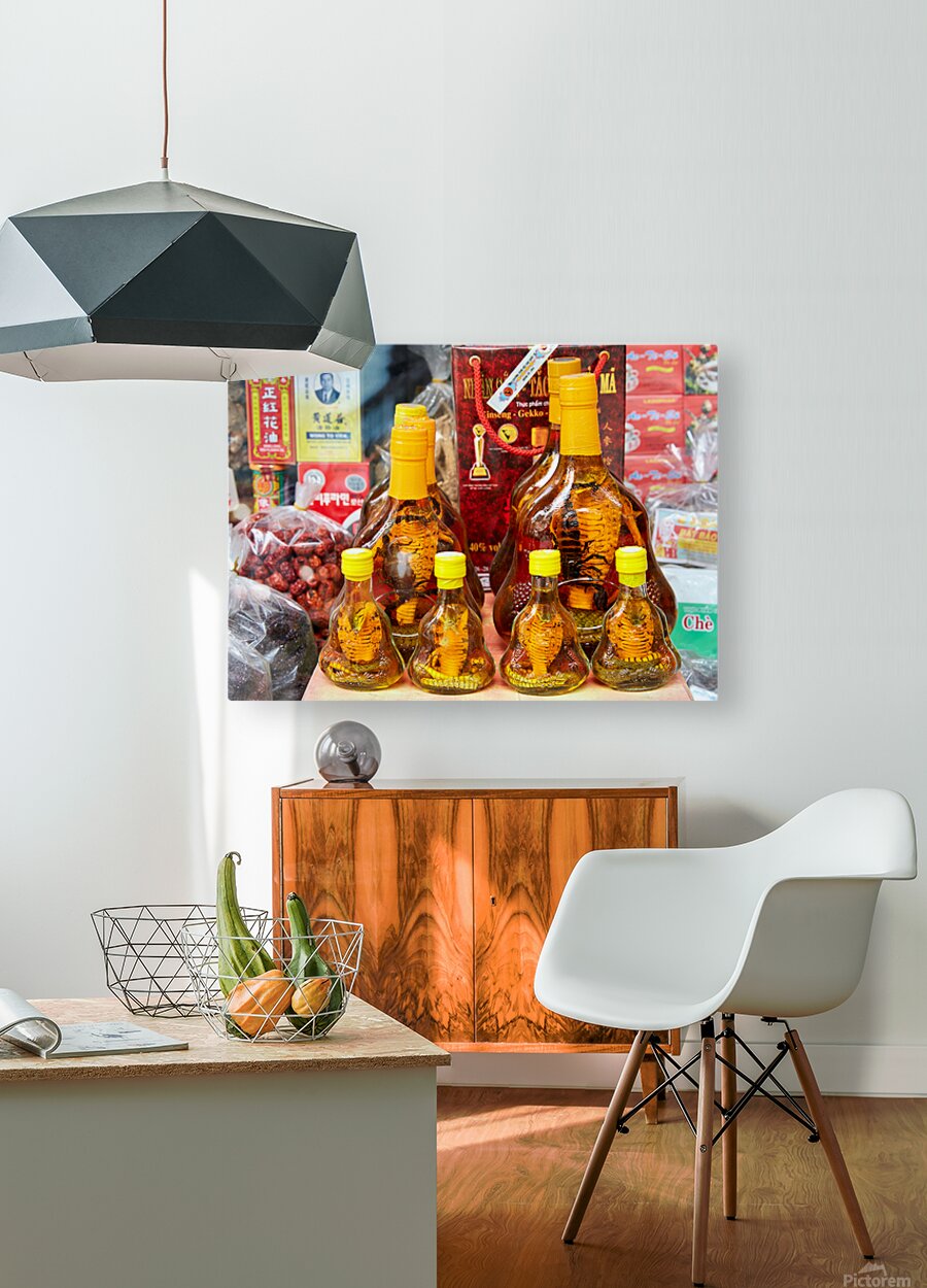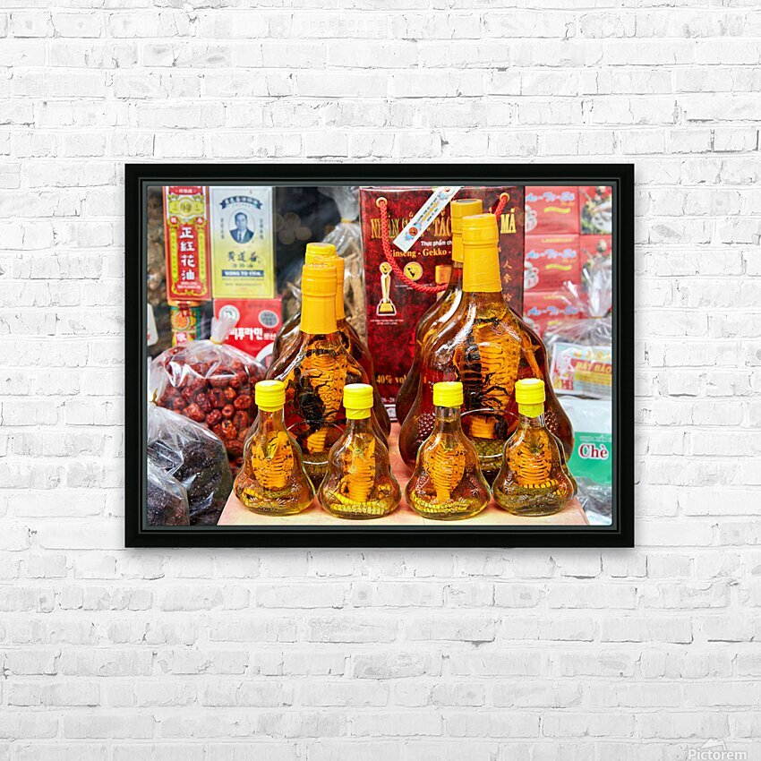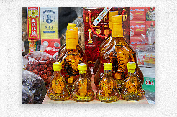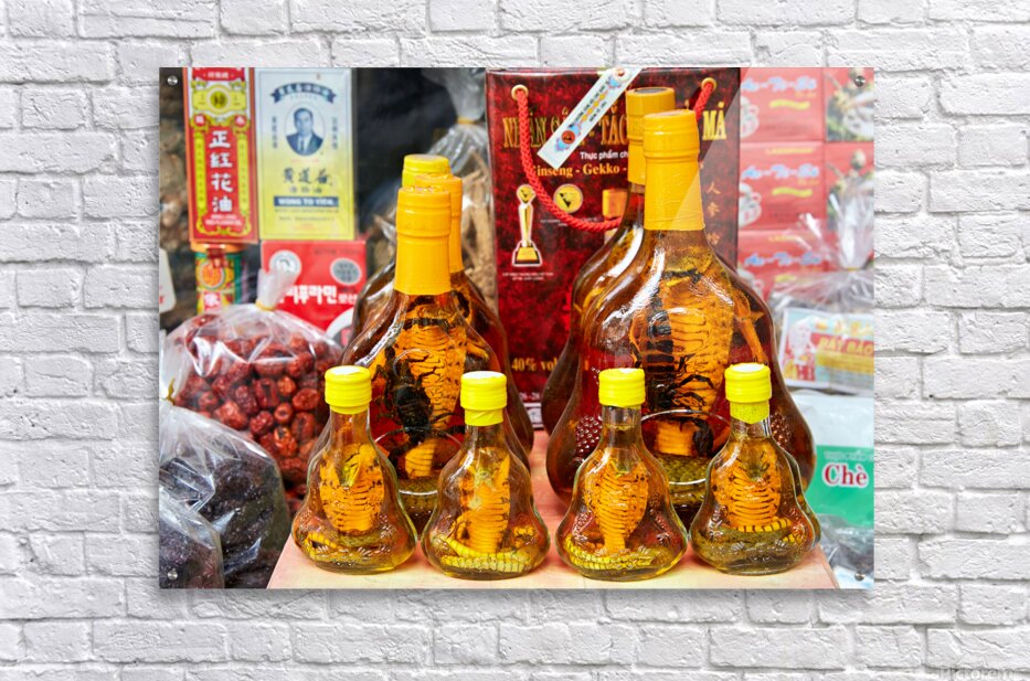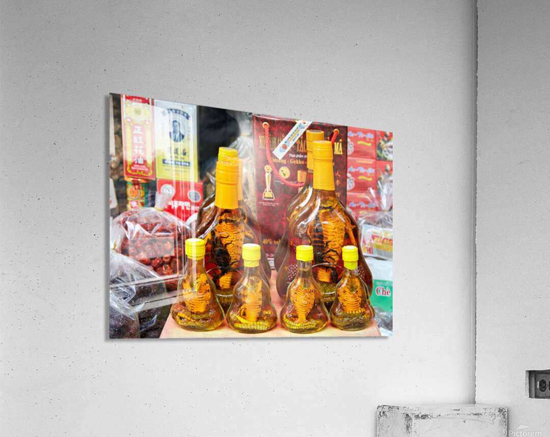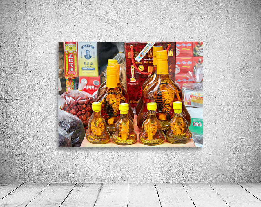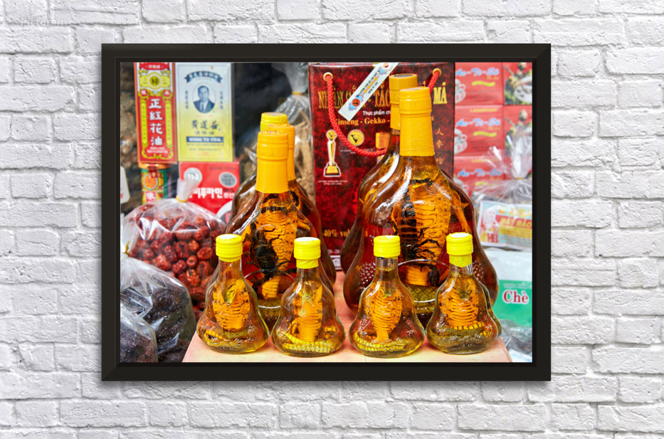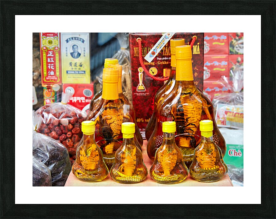 "Bottles of snake alcohol in Ho Chi Minh City market" in a framed print.