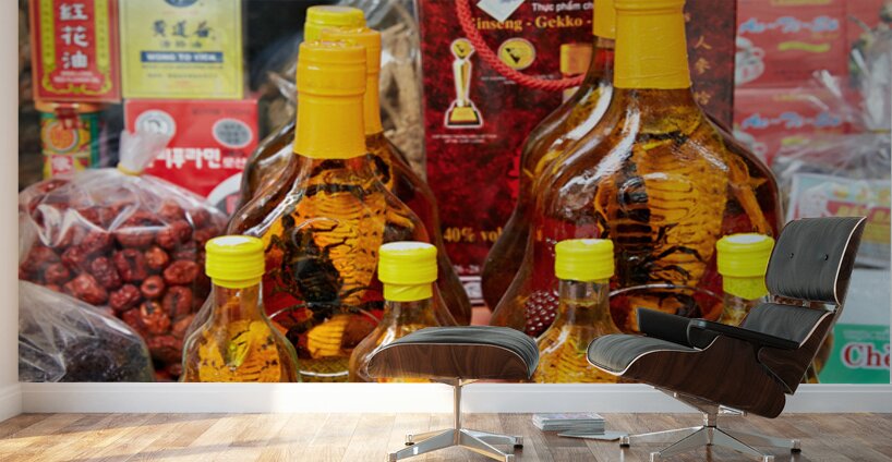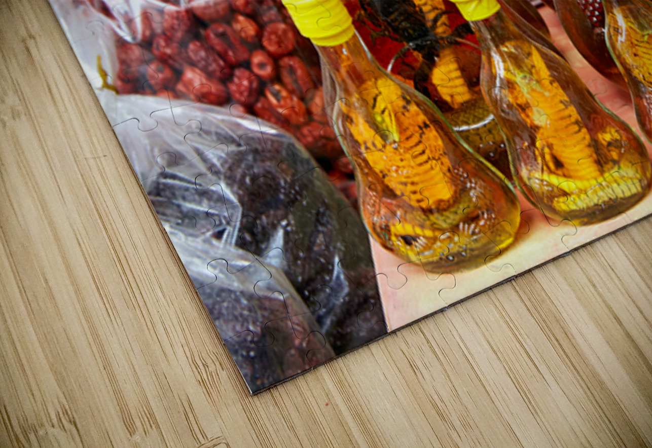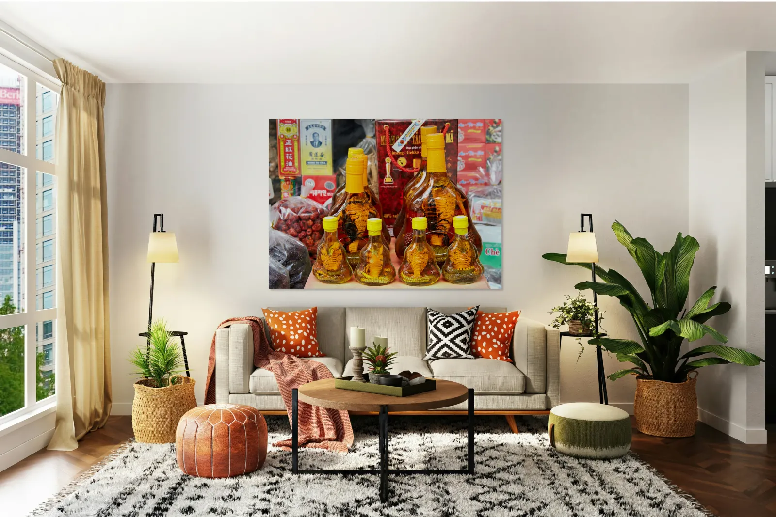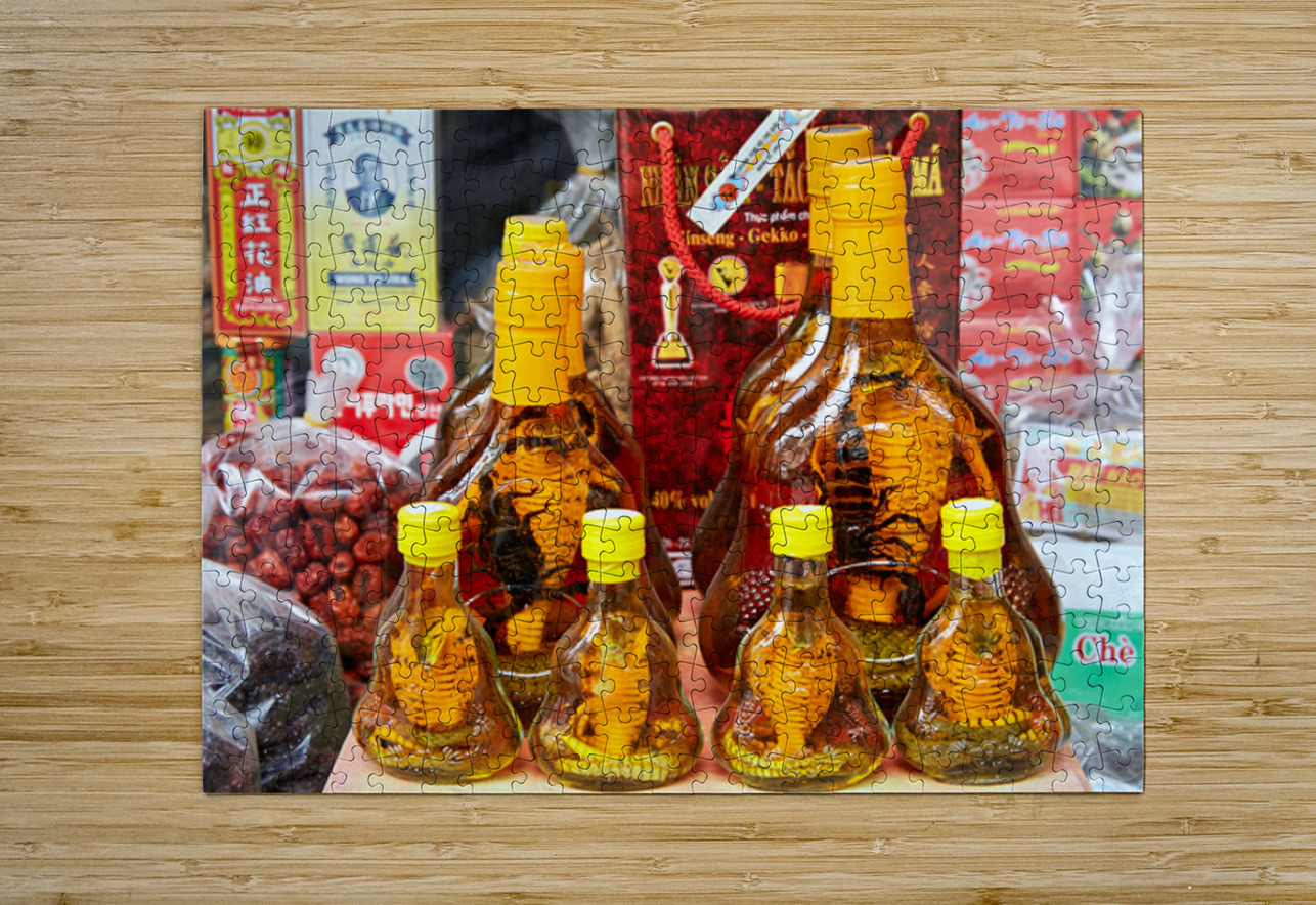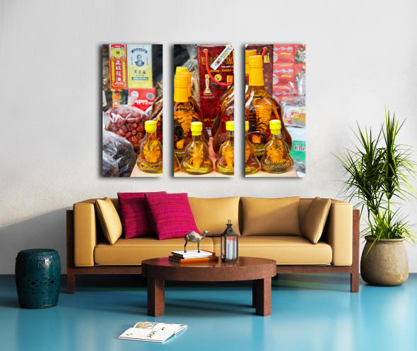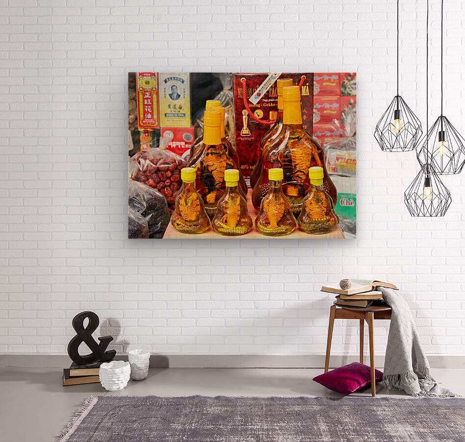 "Bottles of snake alcohol in Ho Chi Minh City market" in a framed print.