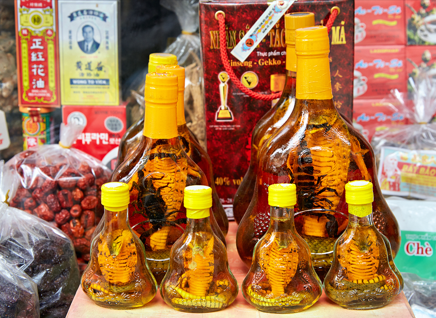 Vendors display bottles of snake alcohol in a market in Ho Chi Minh City. The red packaging and many bottles attract attention from shoppers.