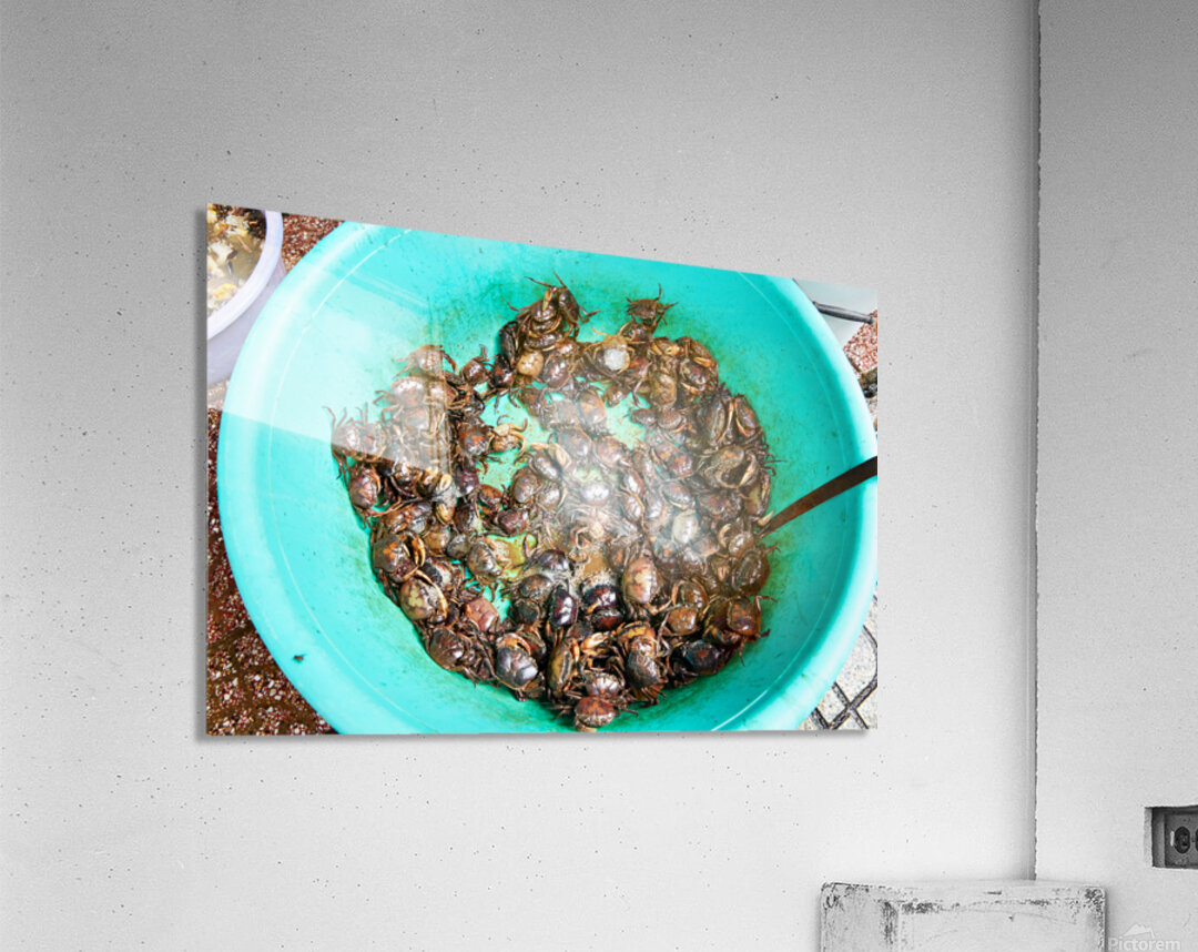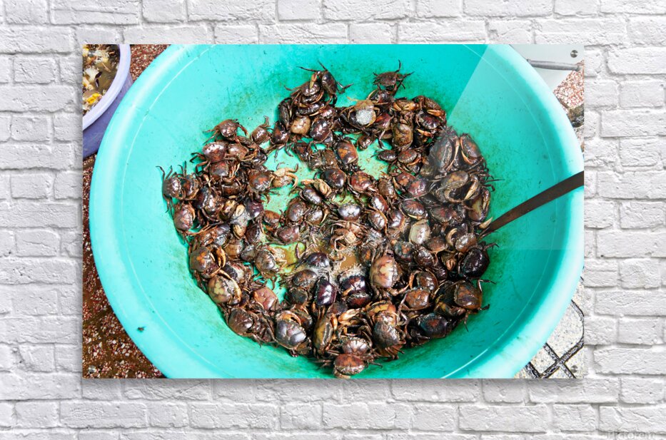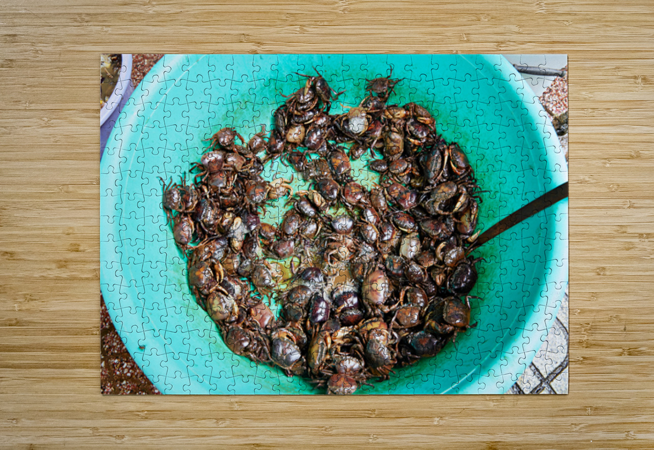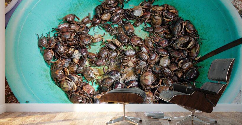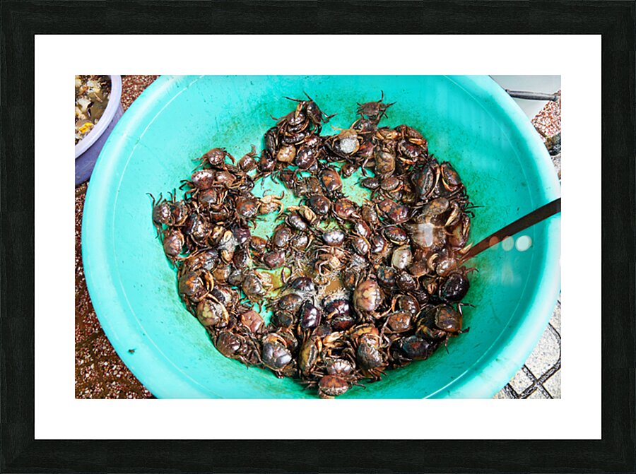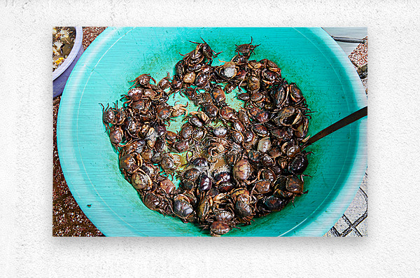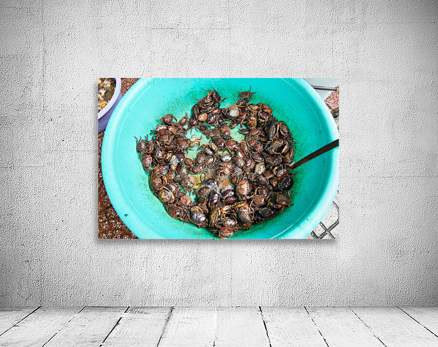 Many live crabs fill a green bowl at a market in Ho Chi Minh City during the day. Vendors prepare seafood for sale.