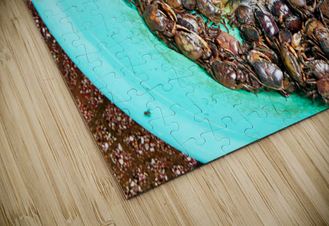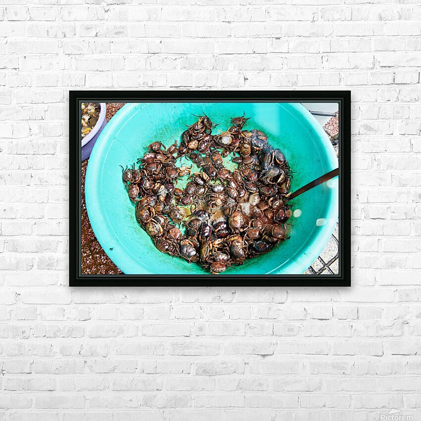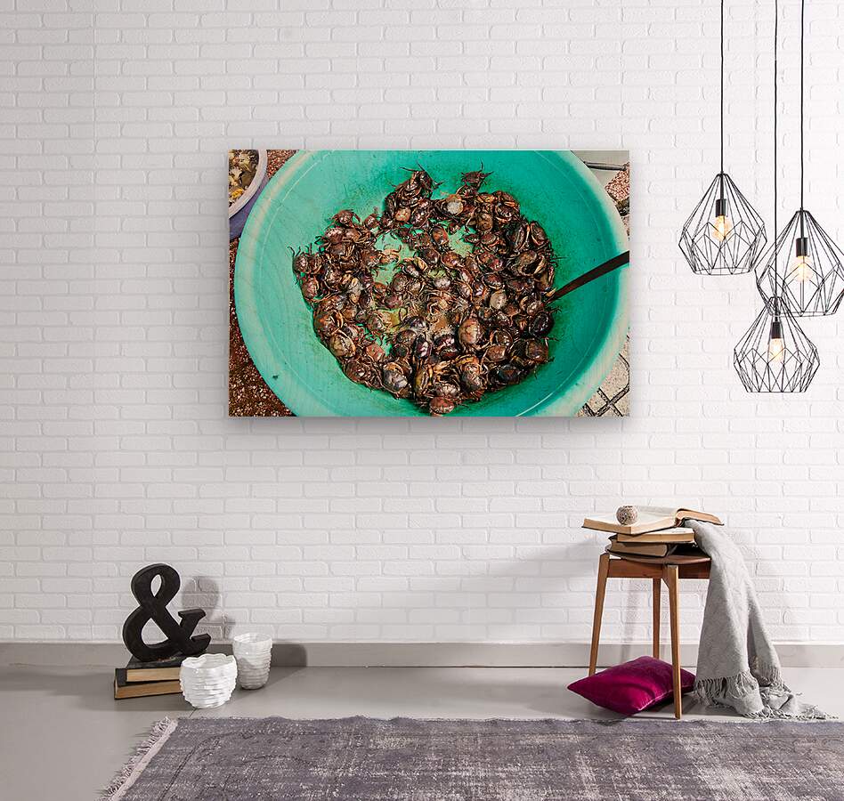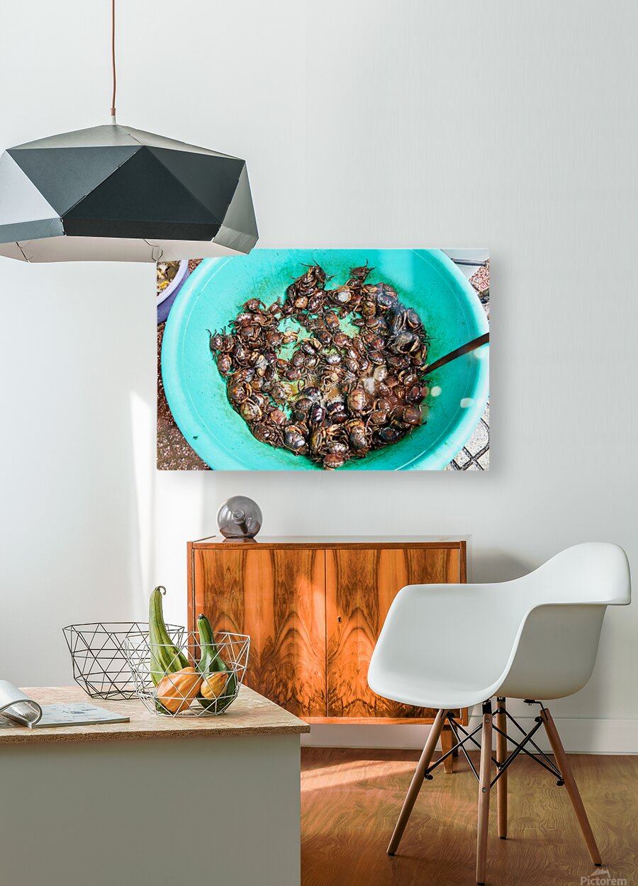 Many live crabs fill a green bowl at a market in Ho Chi Minh City during the day. Vendors prepare seafood for sale.
