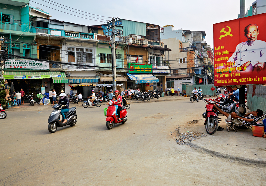 Motorbikes and cars move through a busy street in Ho Chi Minh City. Shops line the road with signs in Vietnamese visible.