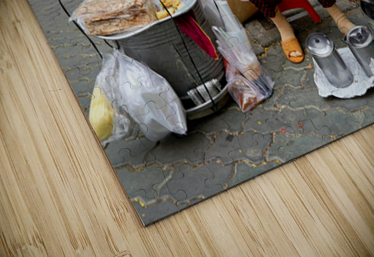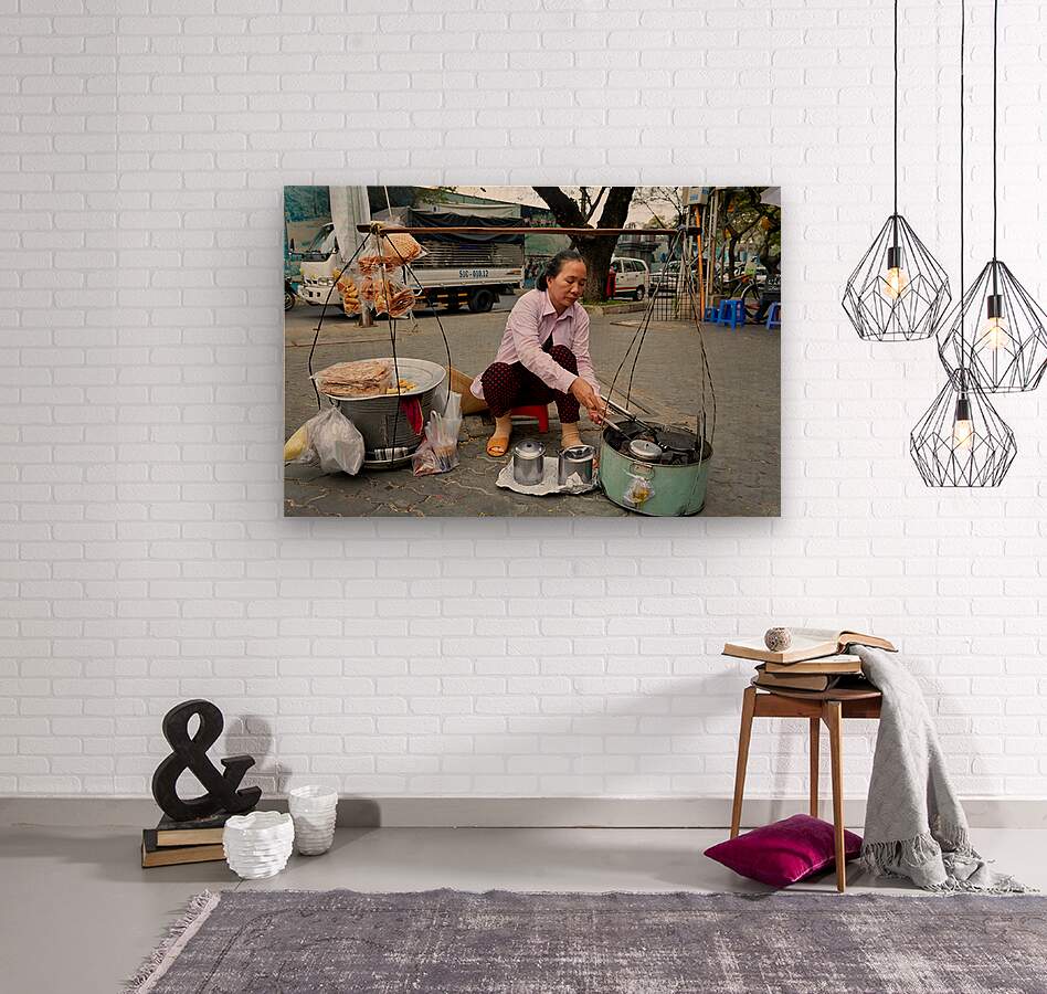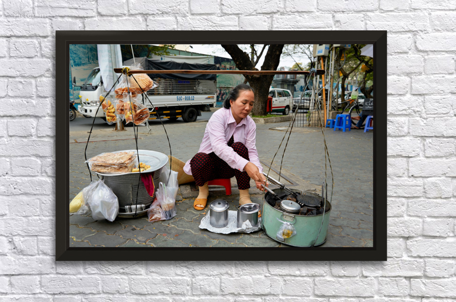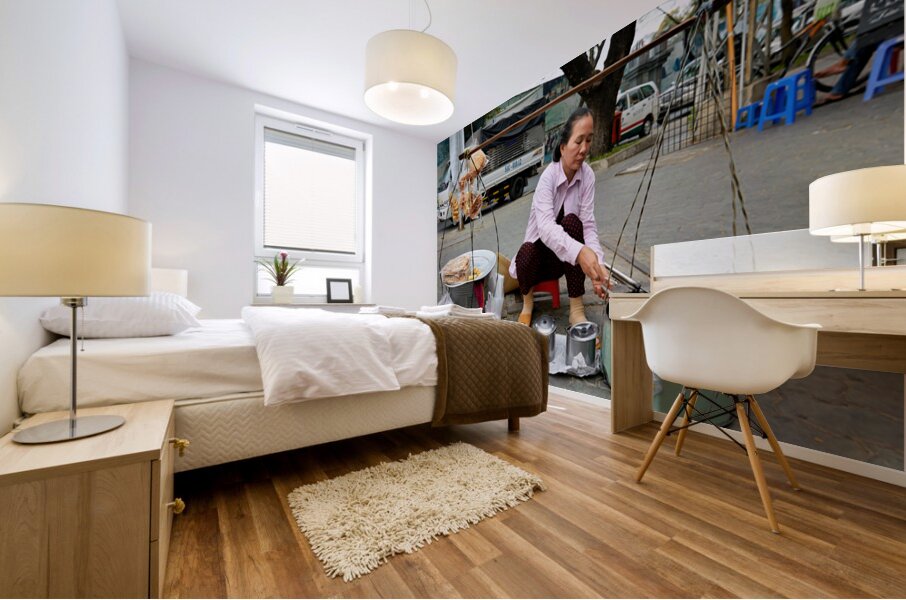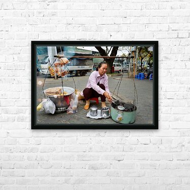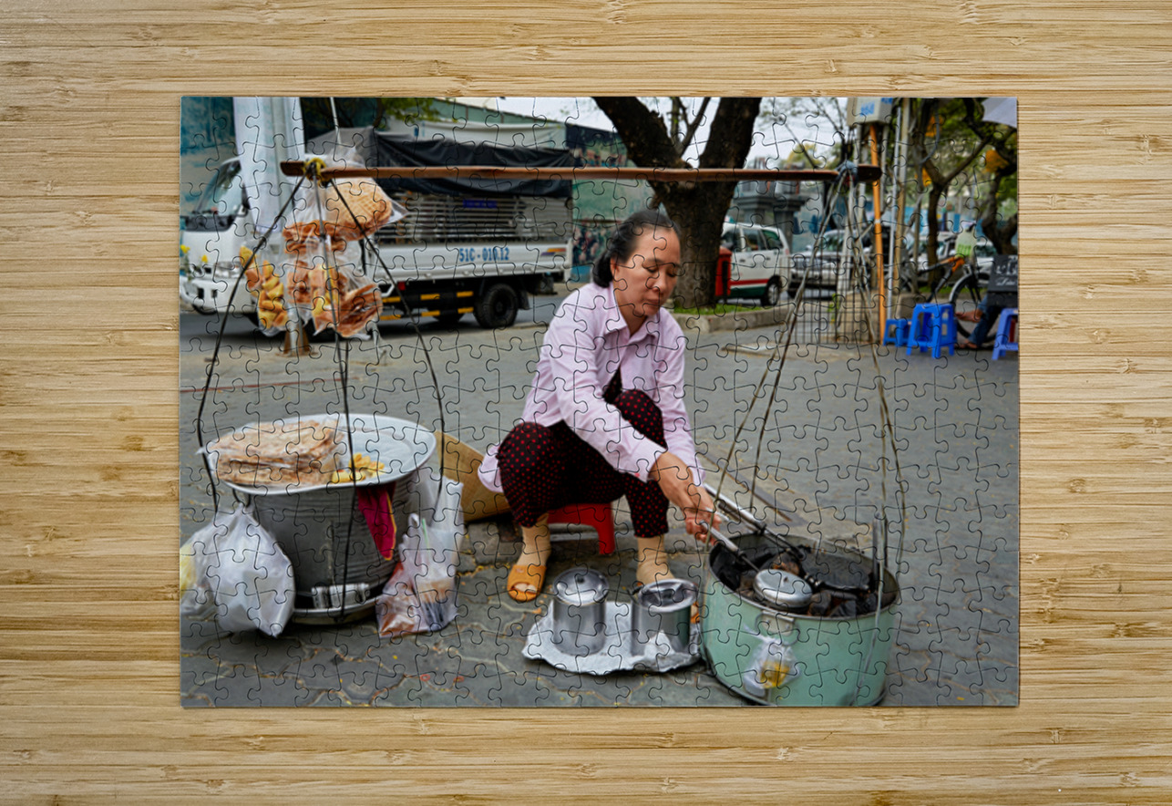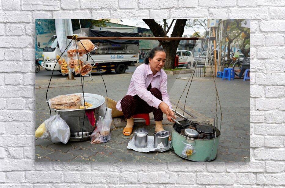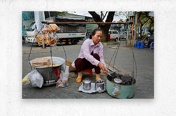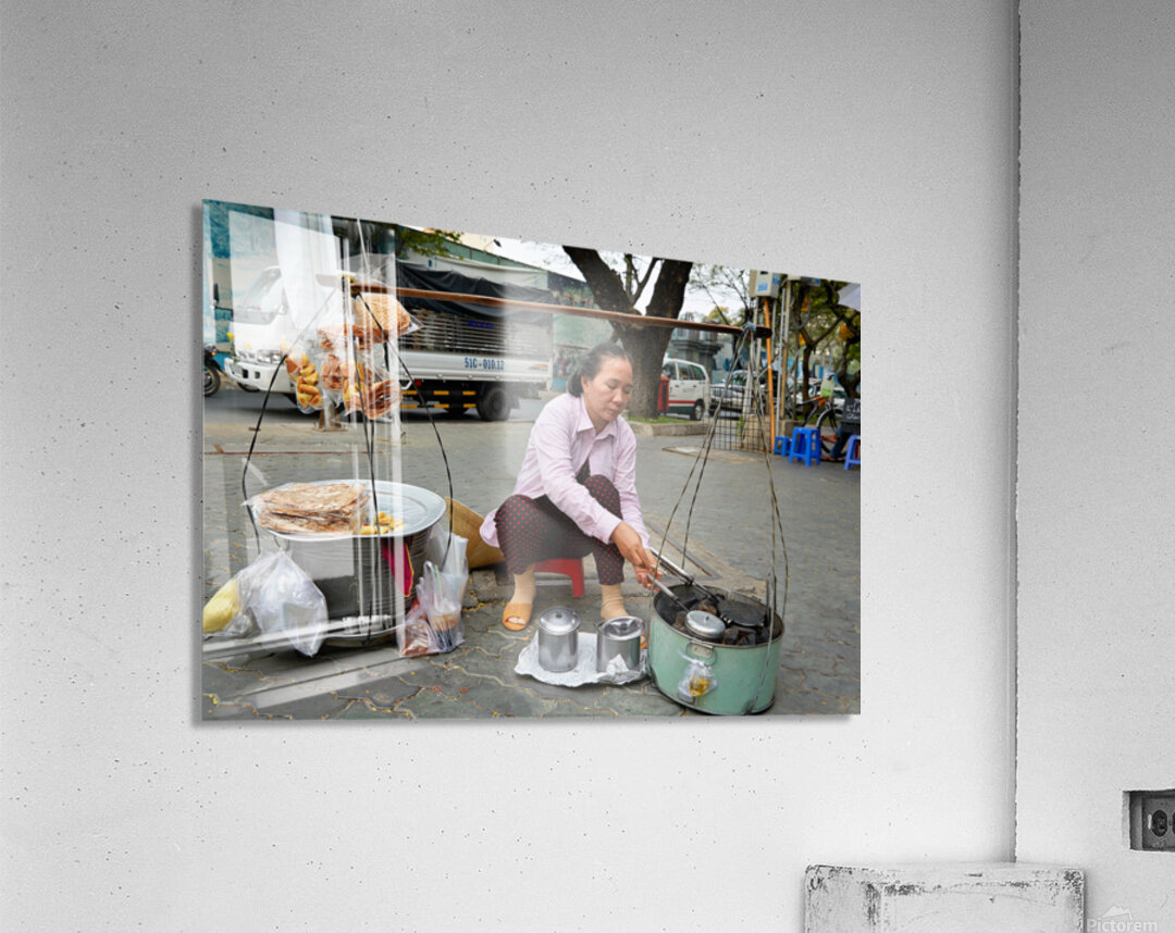 A street vendor in Ho Chi Minh City cooks food on the sidewalk. She sets up her stall with ingredients and cookware for sale.