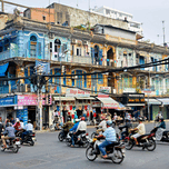 Motorbikes move through a busy street in Ho Chi Minh City. Shops display goods and laundry hangs from balconies.