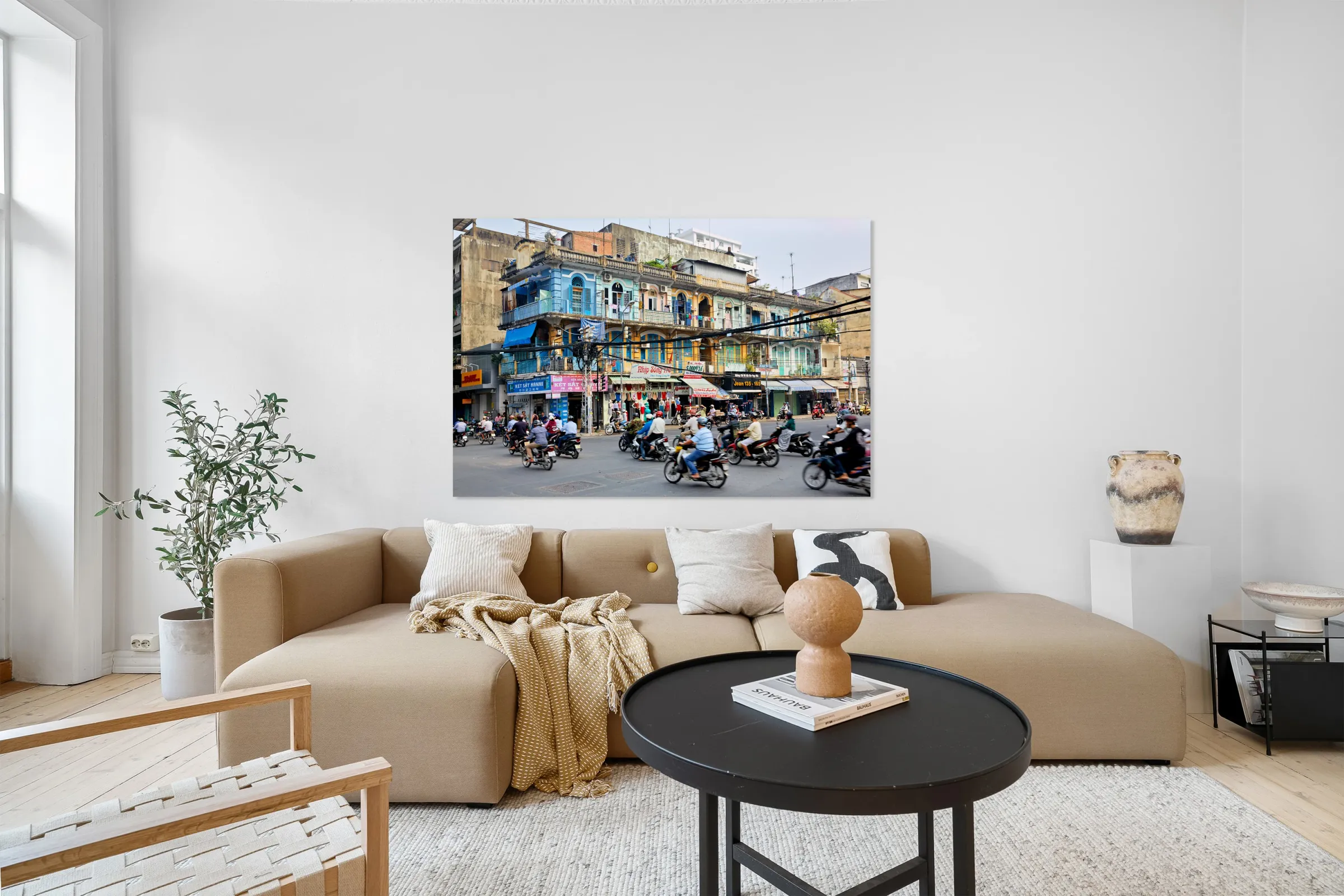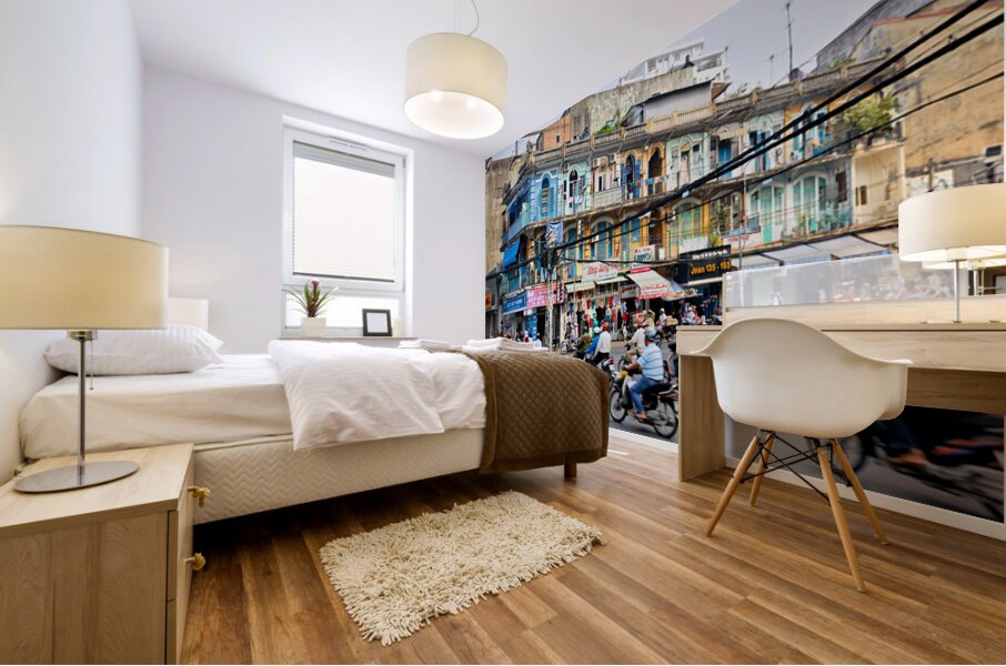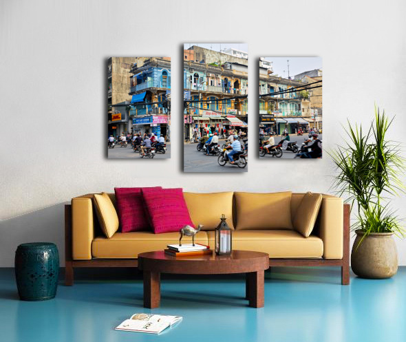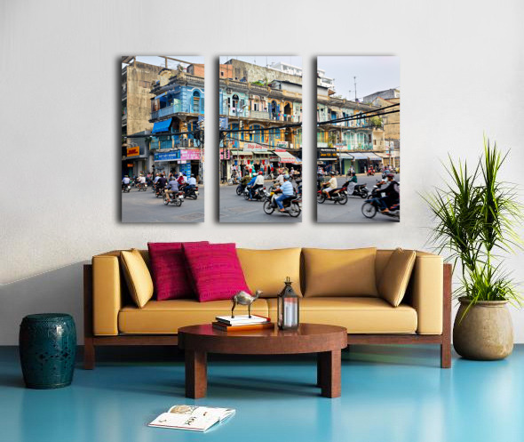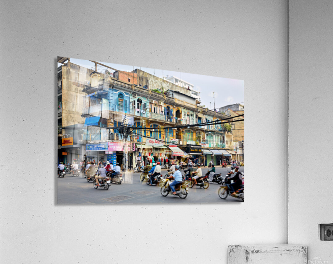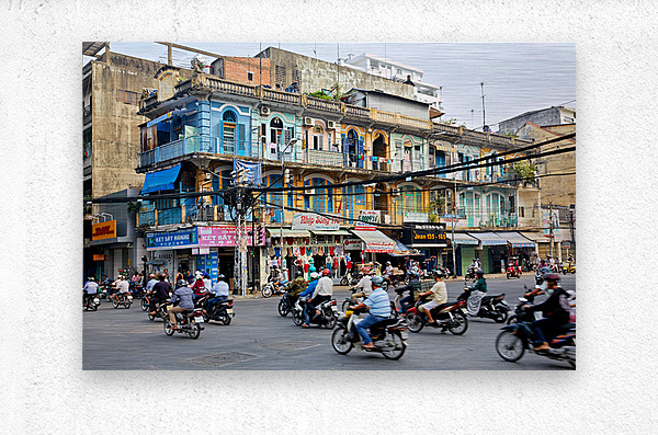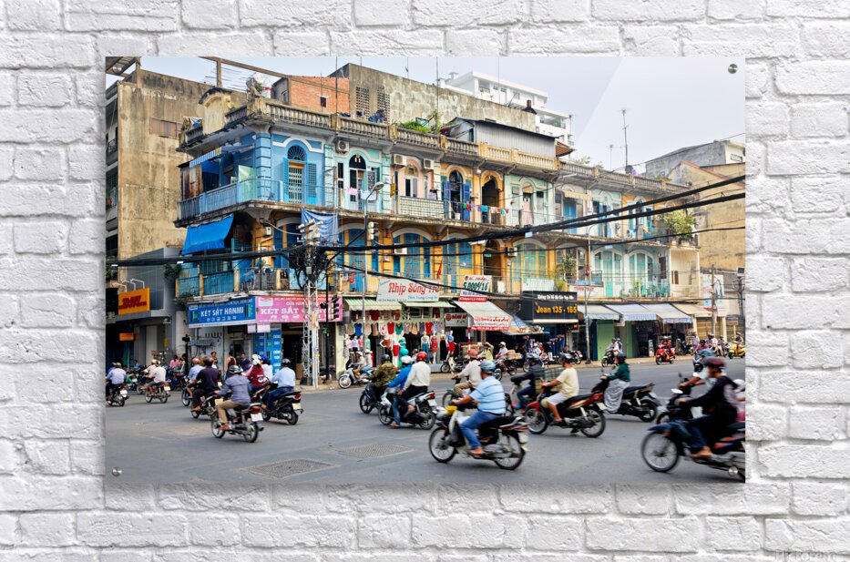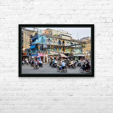 Get this artwork "Busy street scene in Ho Chi Minh City with motorbikes and shops" in a framed print.