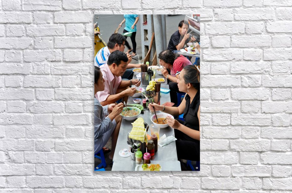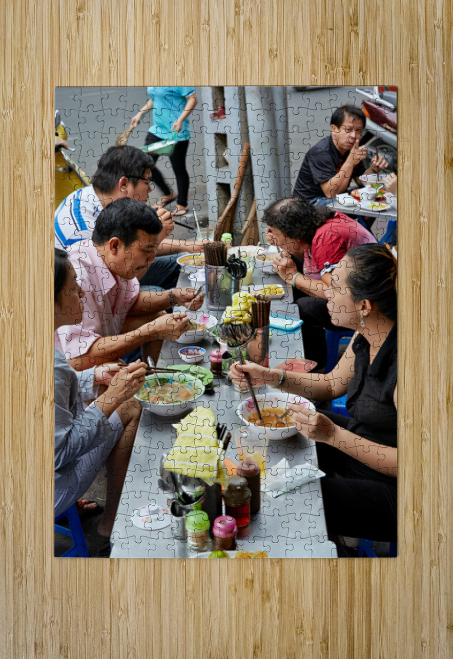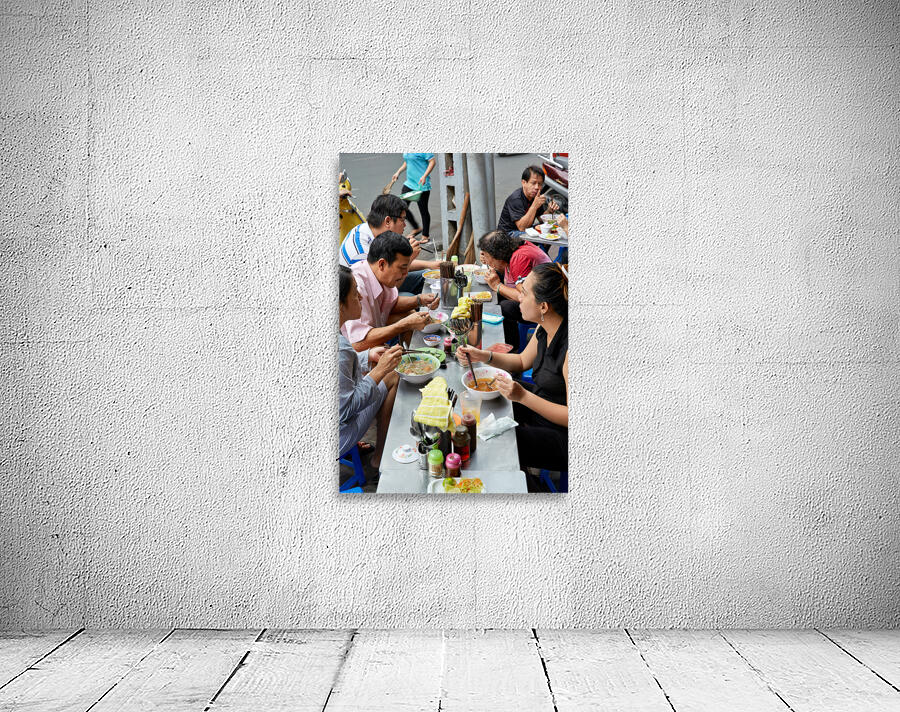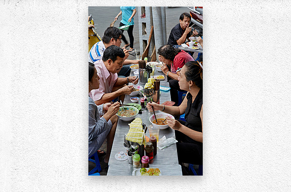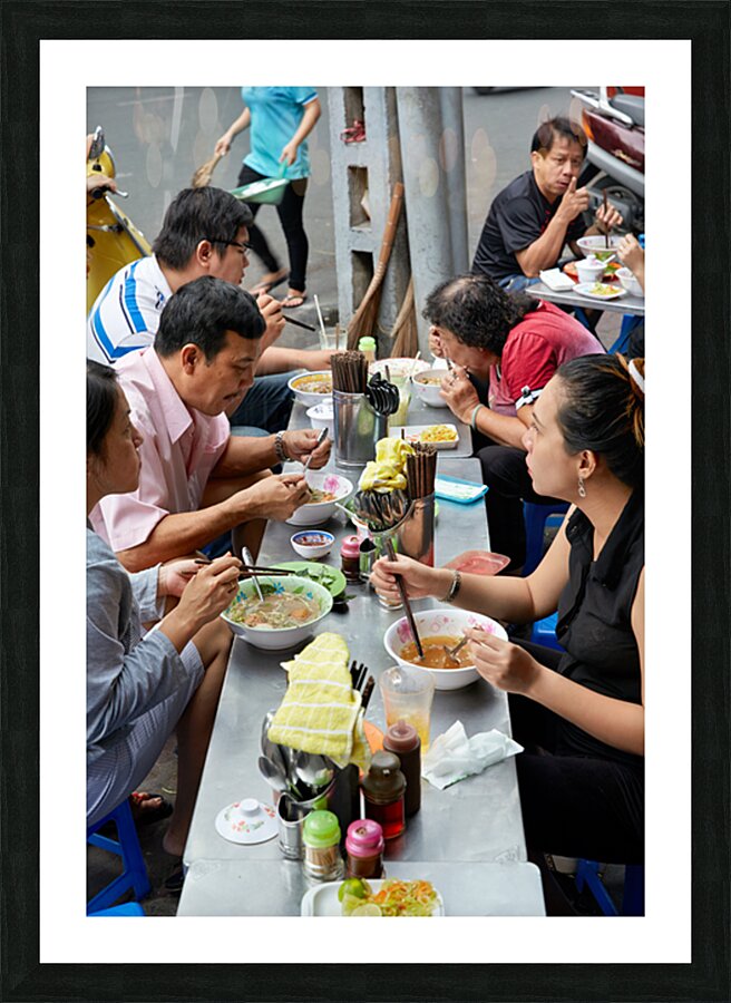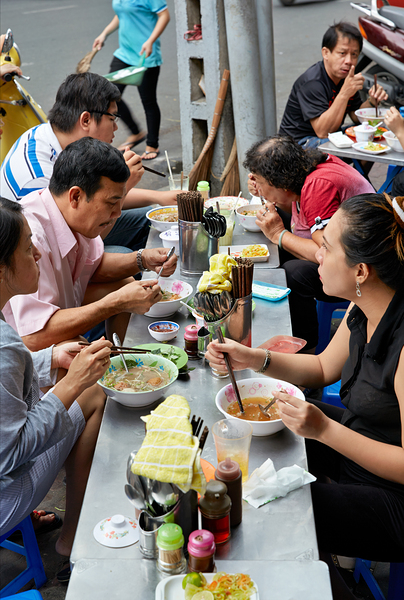 Groups of people enjoy bowls of food at street stalls in Saigon Vietnam. They use chopsticks to eat various dishes in an outdoor setting.