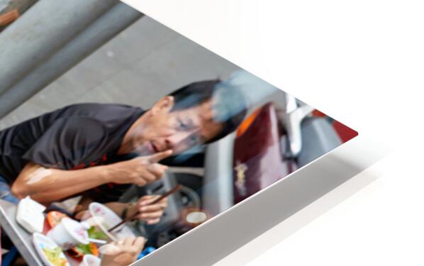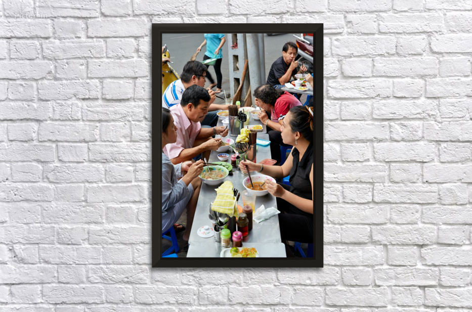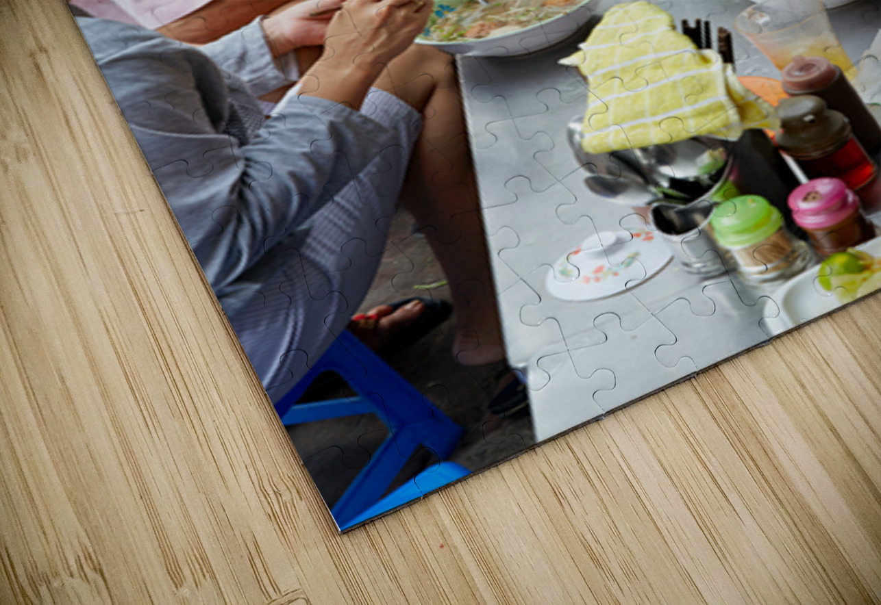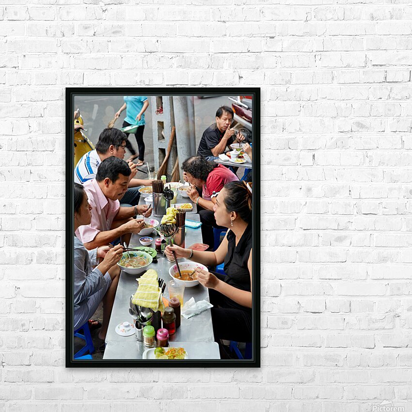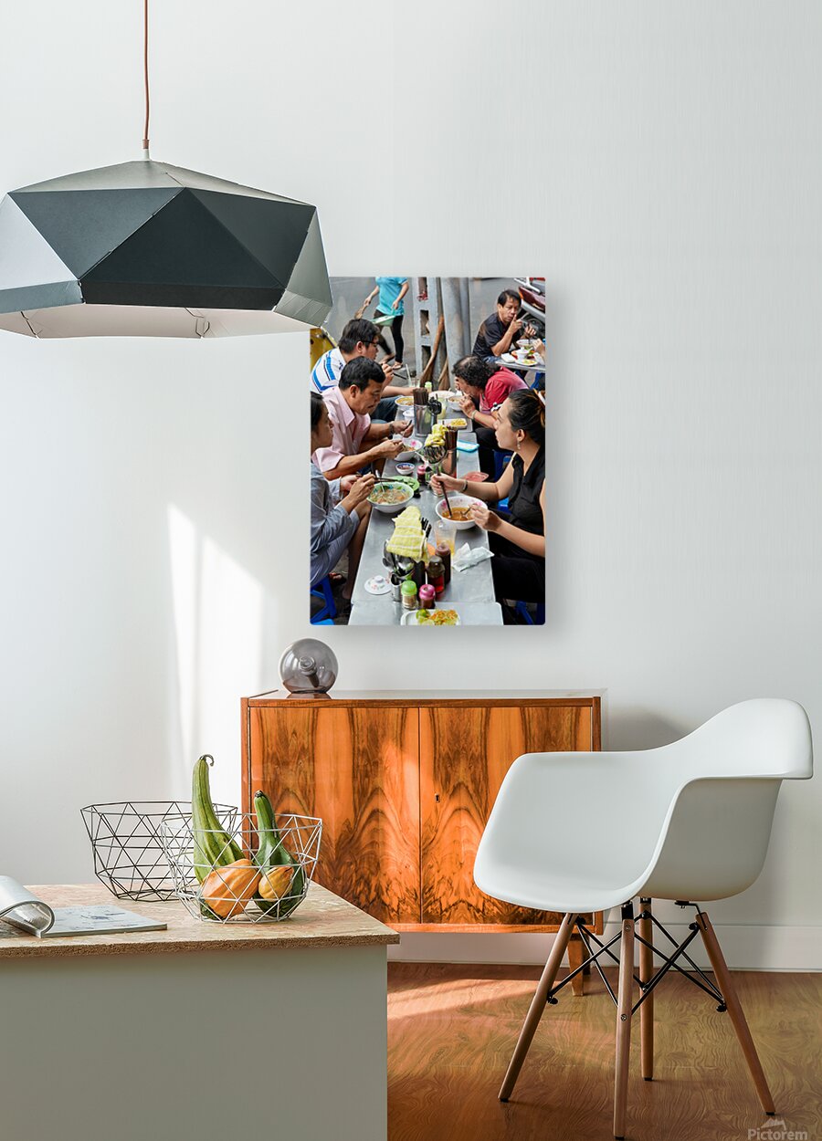 Groups of people enjoy bowls of food at street stalls in Saigon Vietnam. They use chopsticks to eat various dishes in an outdoor setting.