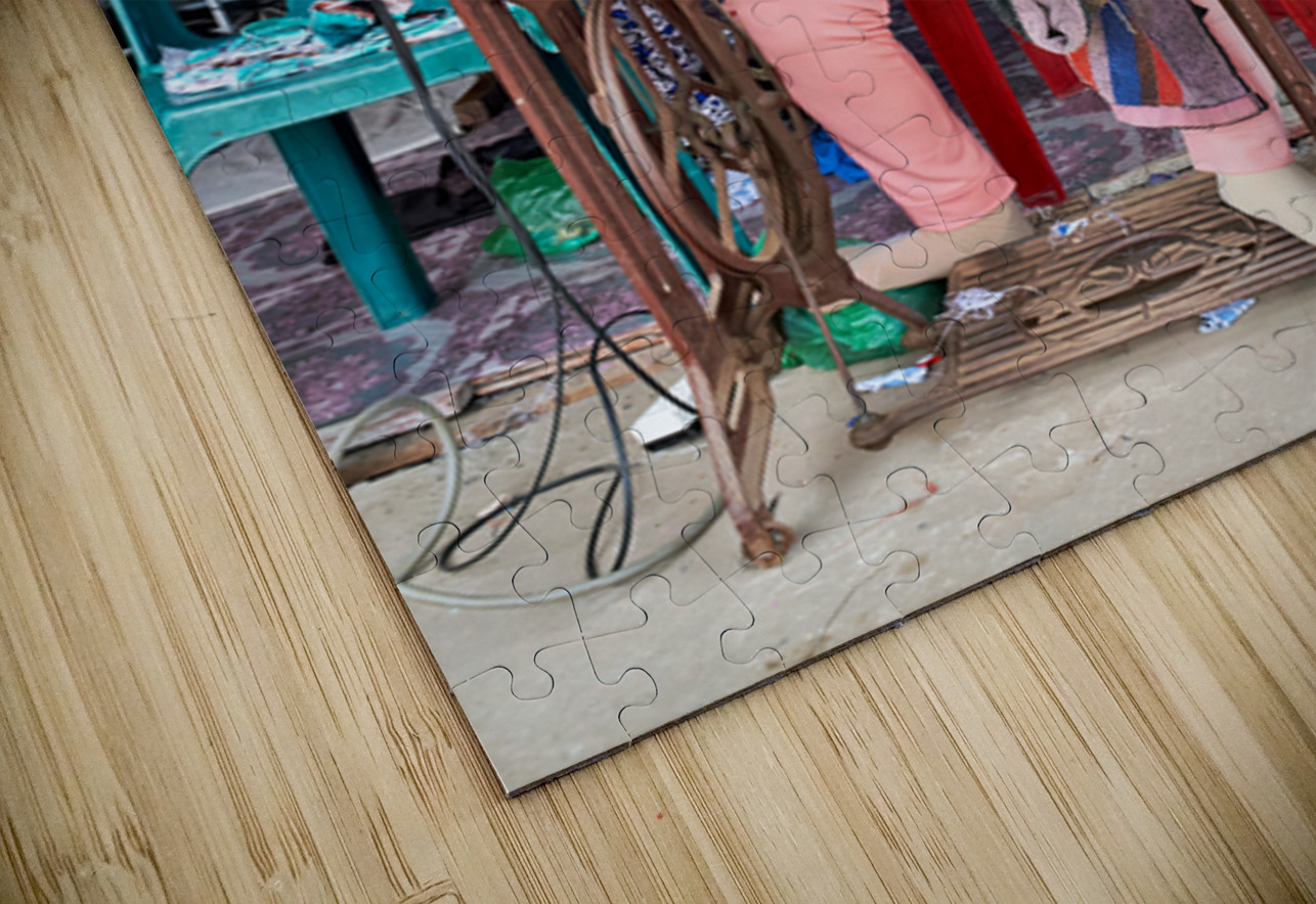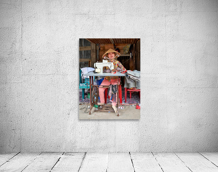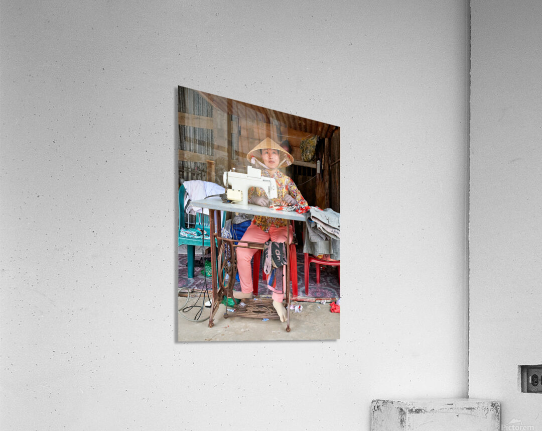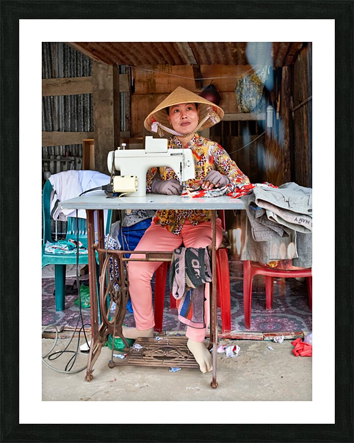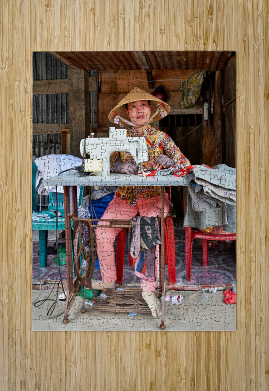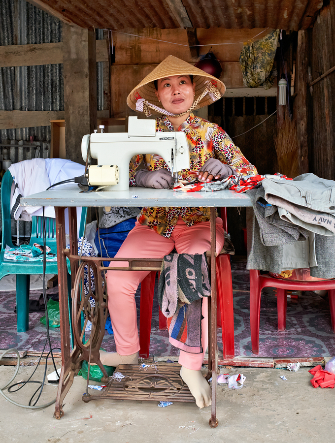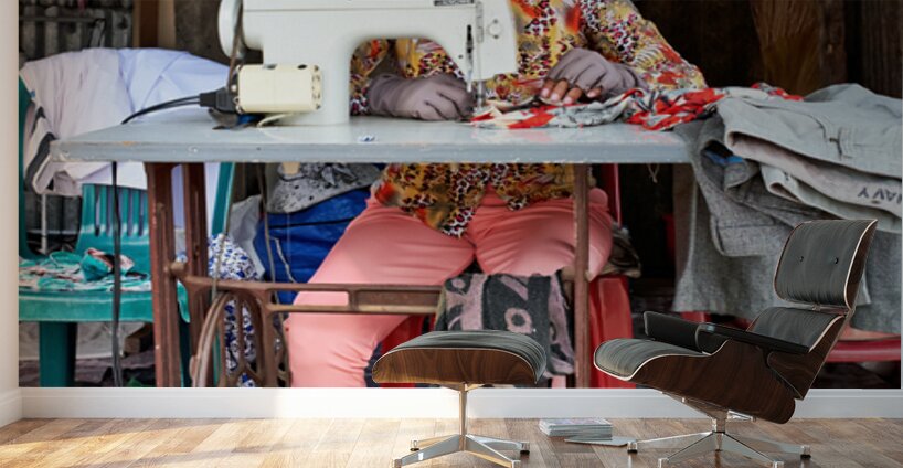A woman works at a sewing machine in Phu Quoc Vietnam. She creates clothing while sitting at a table in her workspace.