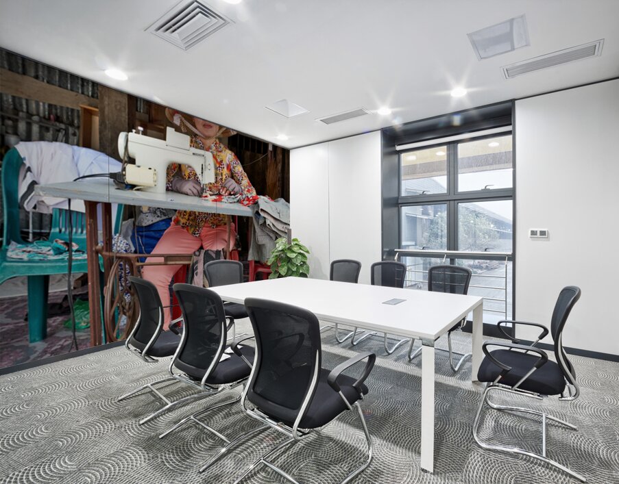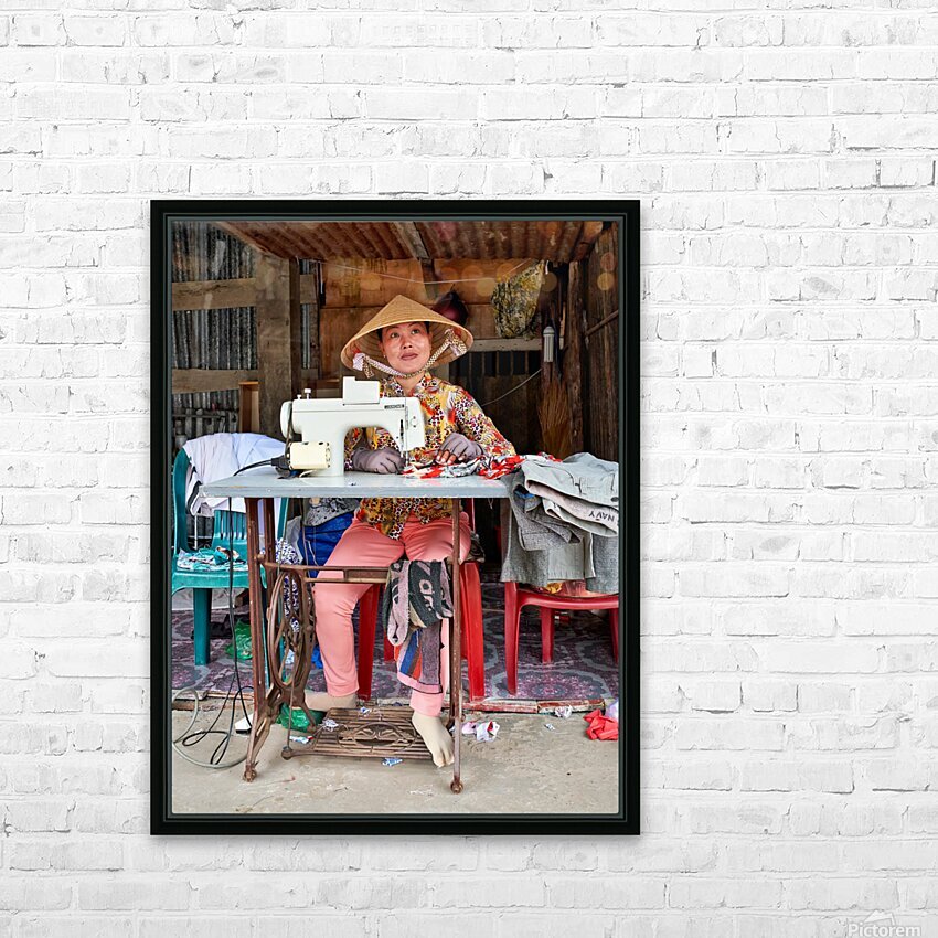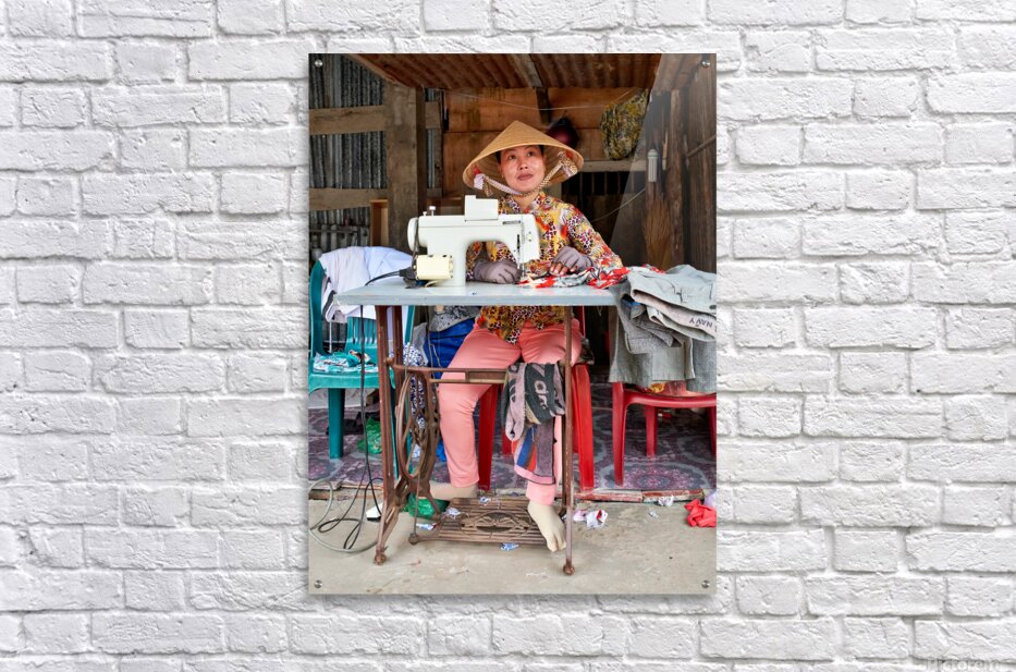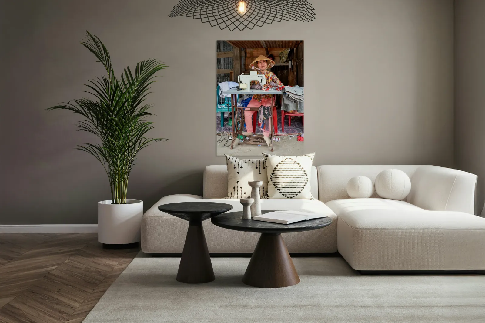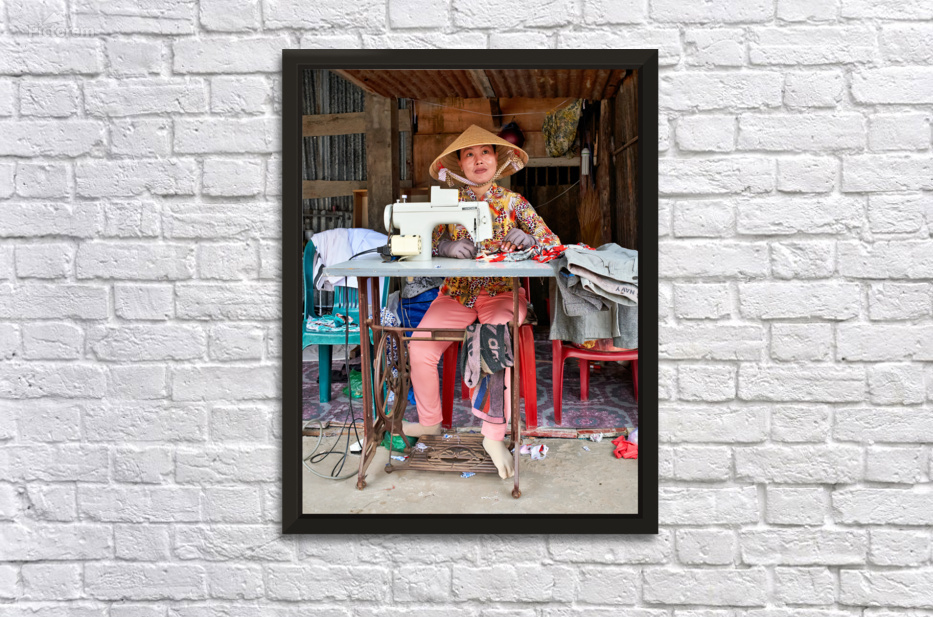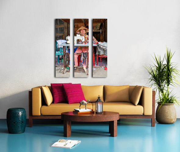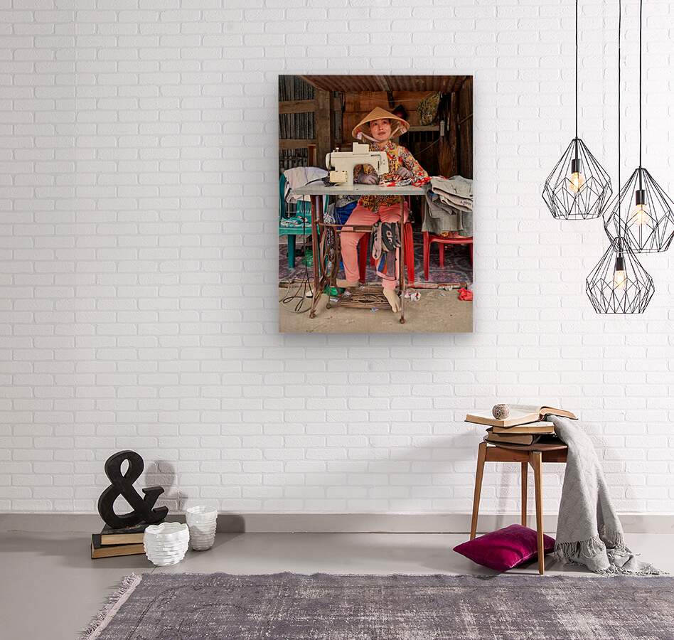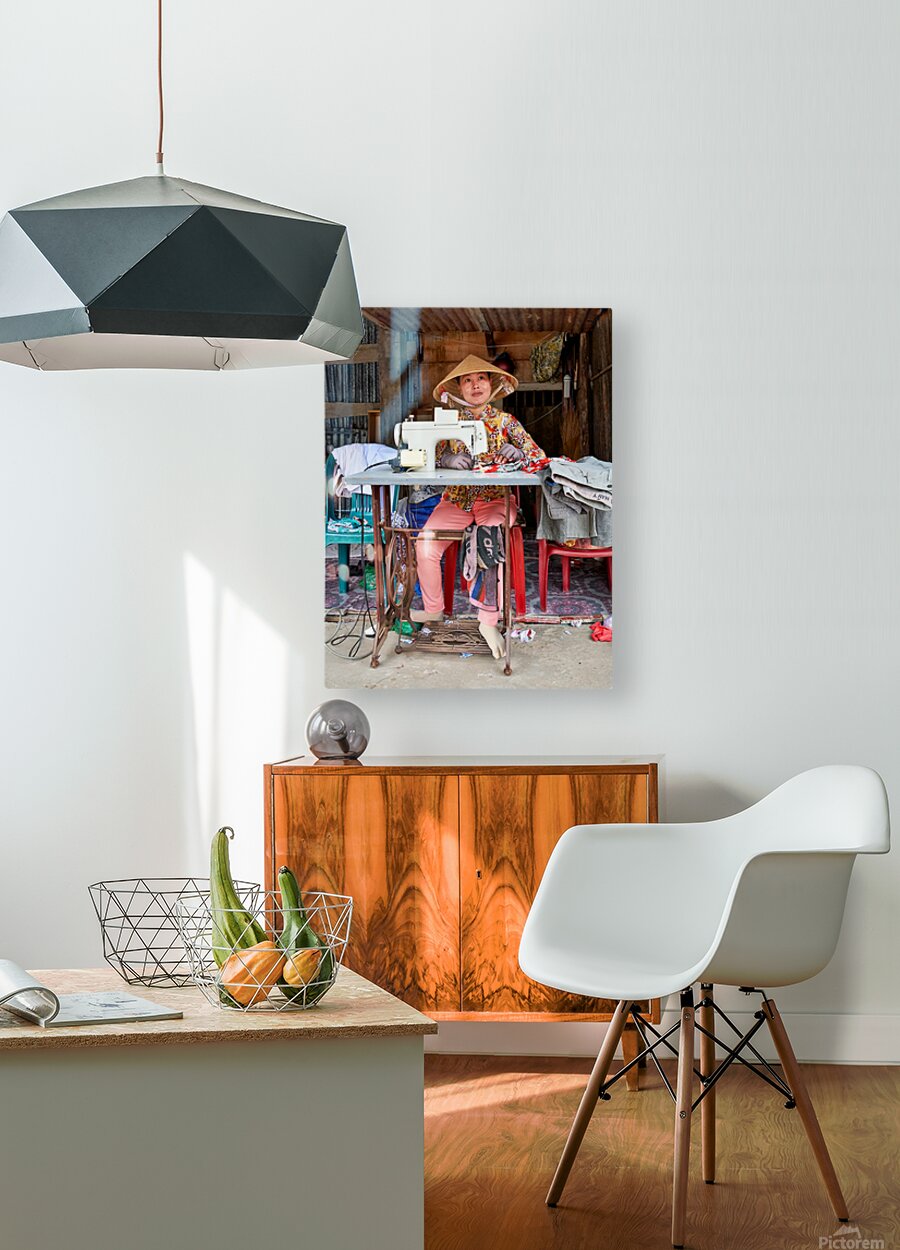 A woman works at a sewing machine in Phu Quoc Vietnam. She creates clothing while sitting at a table in her workspace.