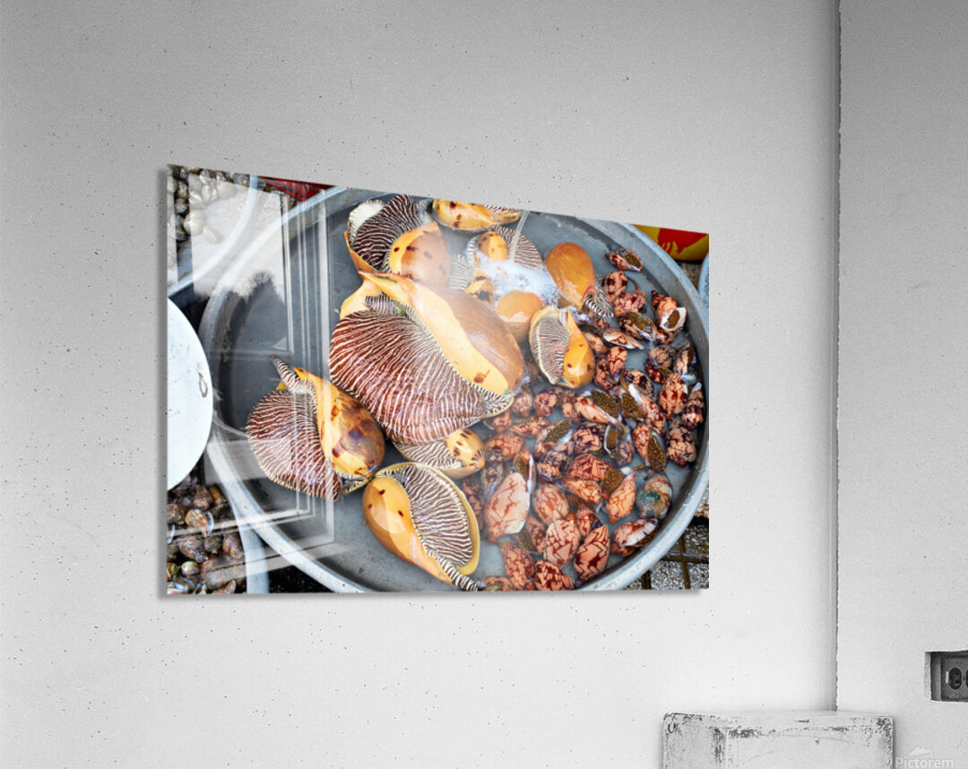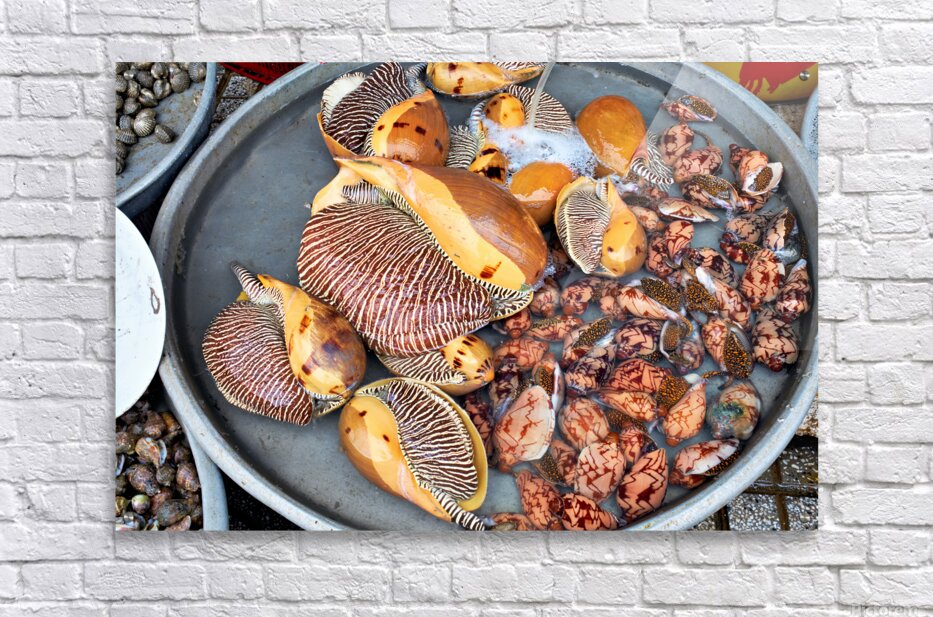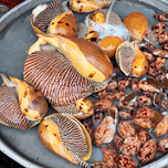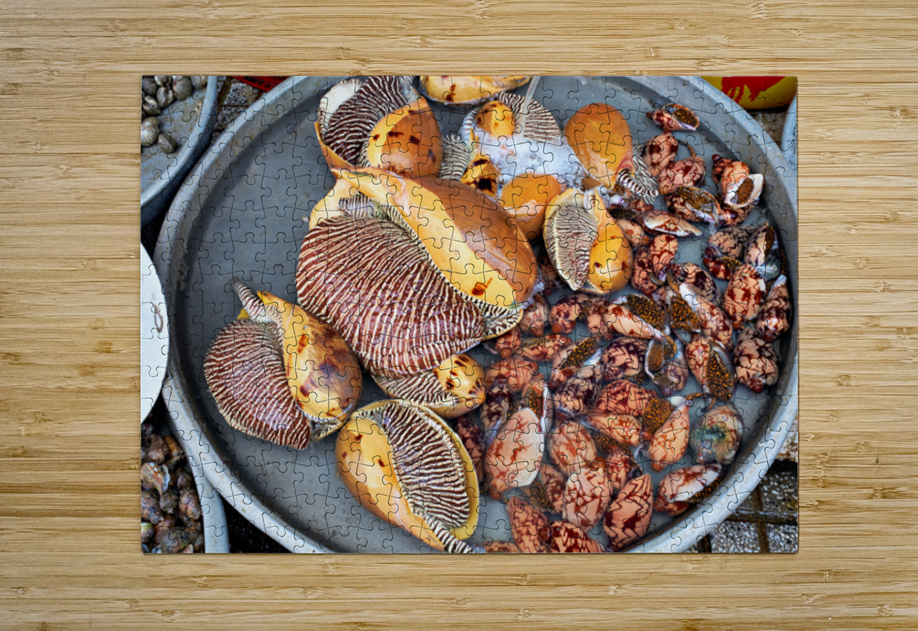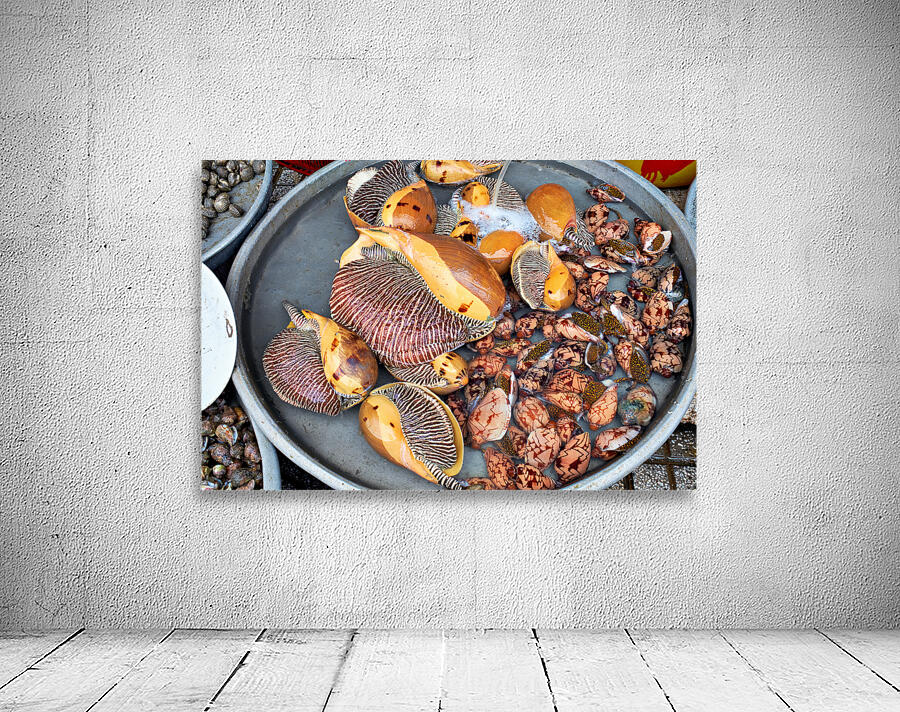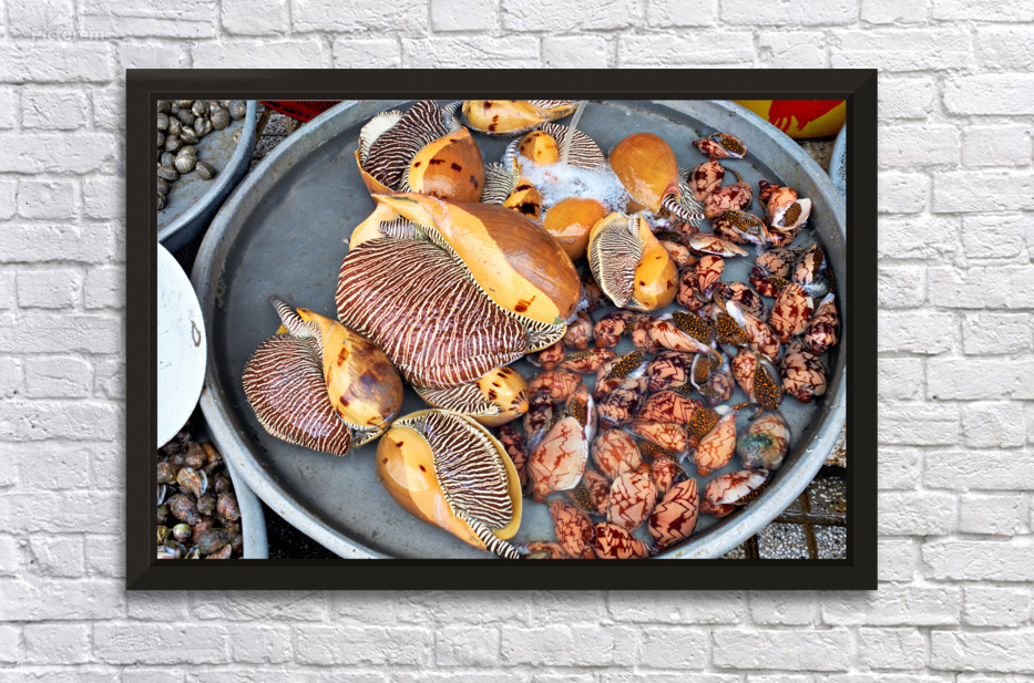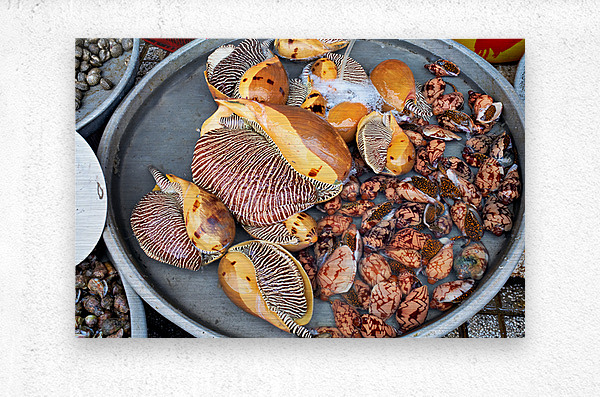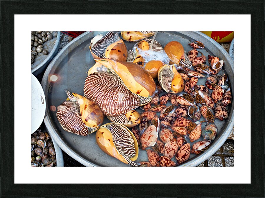 At a market in Phu Quoc various types of shells and clams are displayed in water. Vendors prepare for the day ahead with fresh seafood.