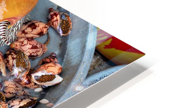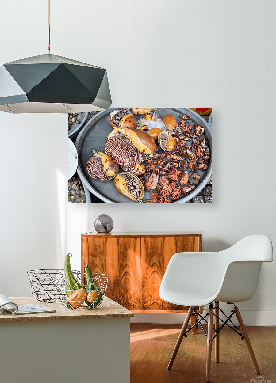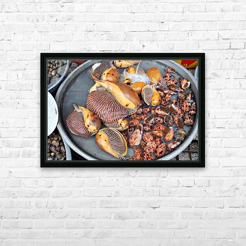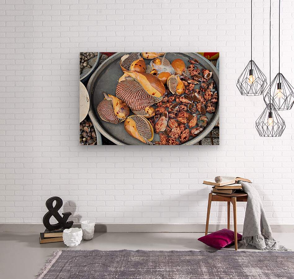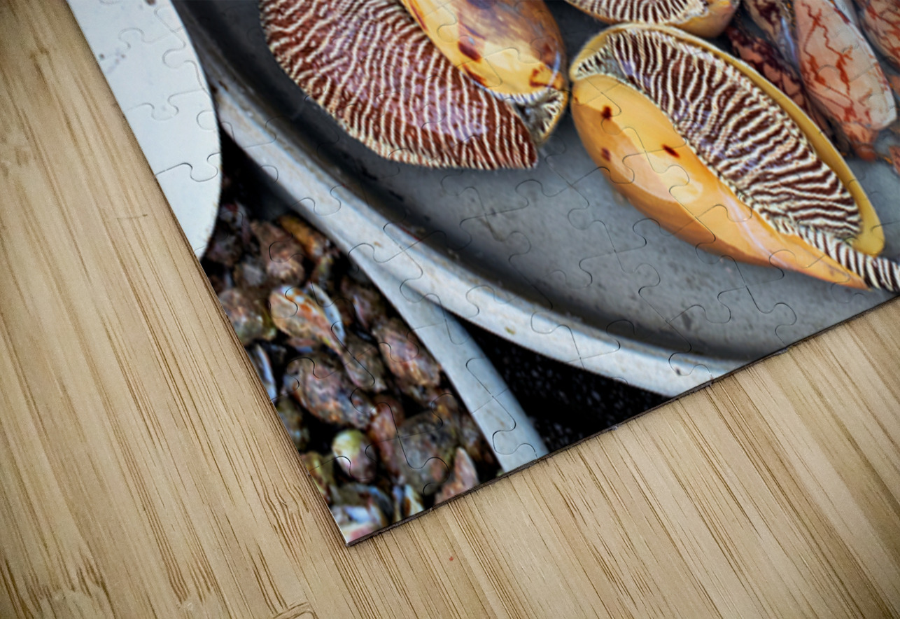 At a market in Phu Quoc various types of shells and clams are displayed in water. Vendors prepare for the day ahead with fresh seafood.