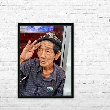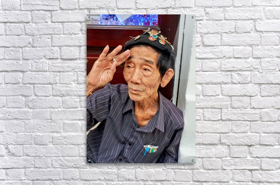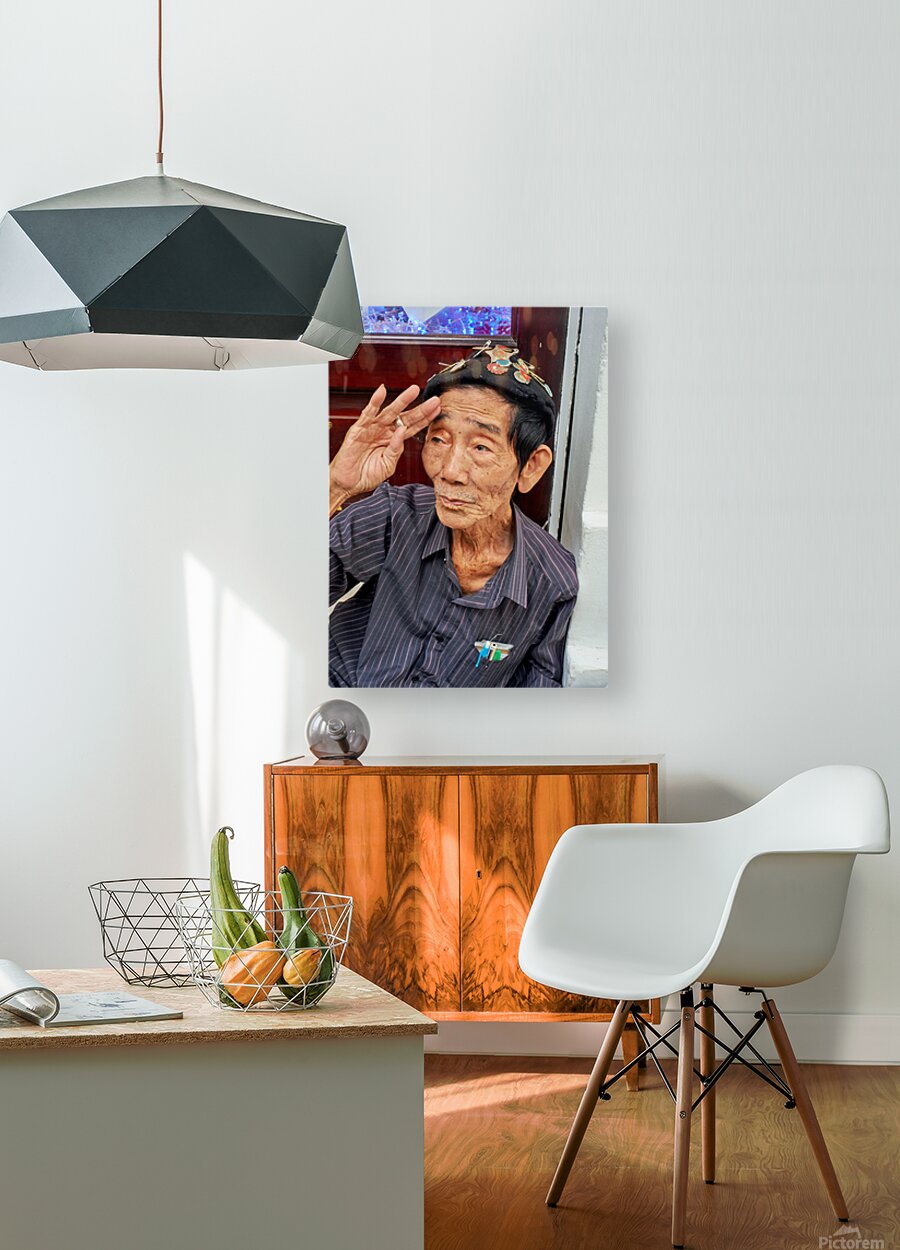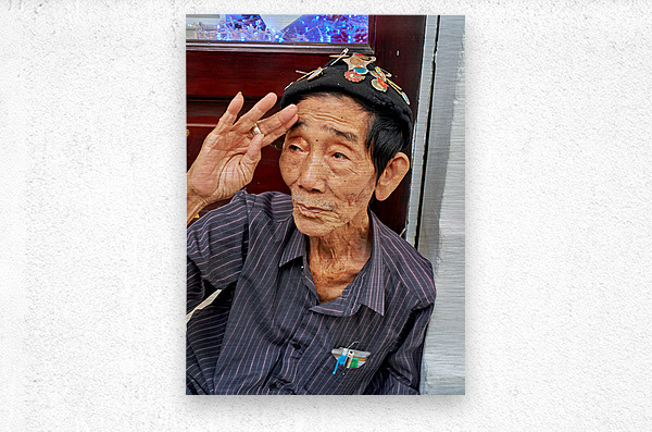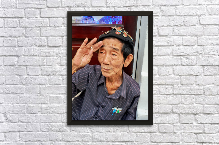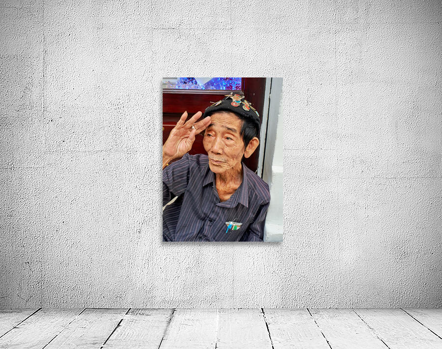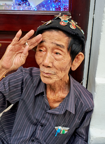 A man sits on the street in Ho Chi Minh City. He salutes with a hat decorated with pins. Street life continues around him.