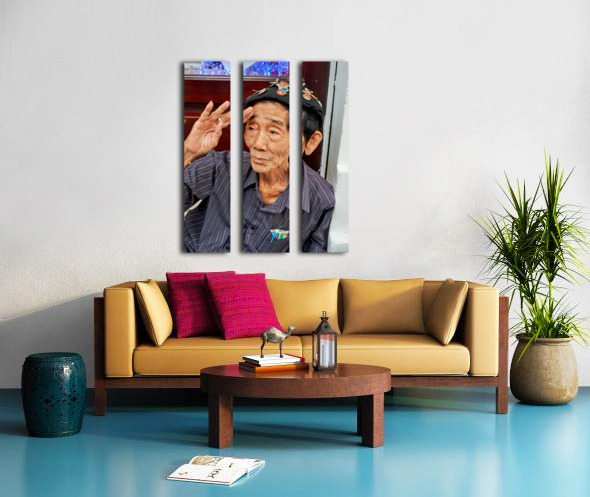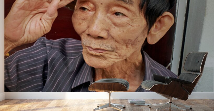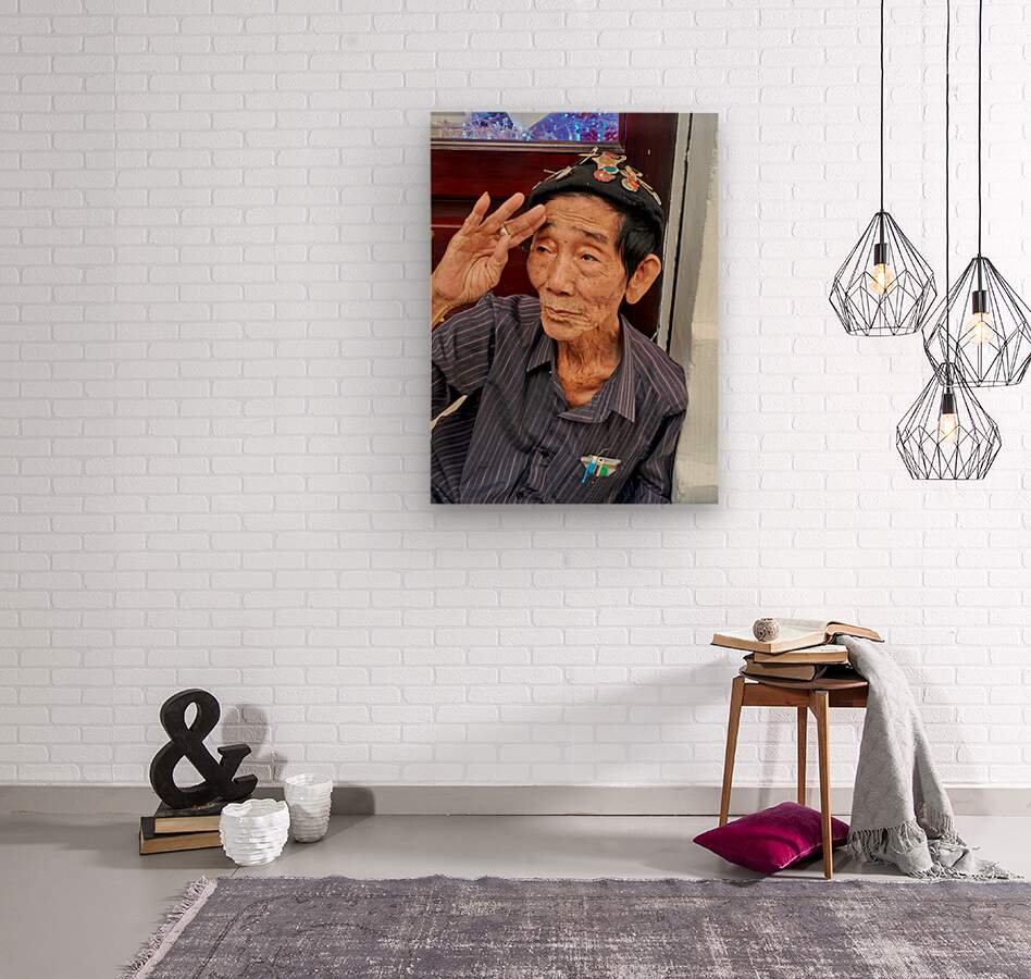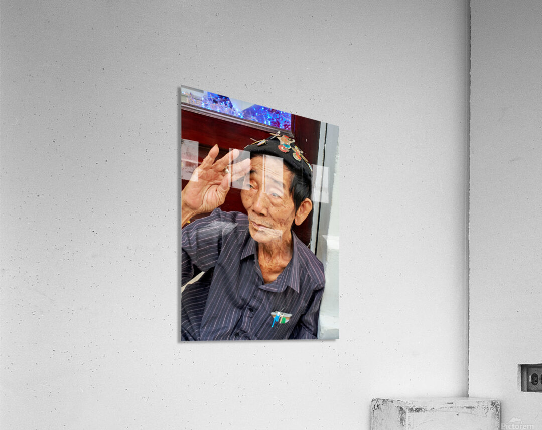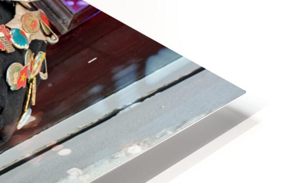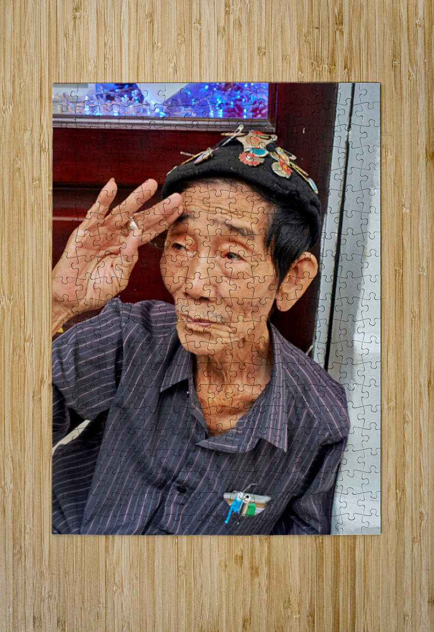 A man sits on the street in Ho Chi Minh City. He salutes with a hat decorated with pins. Street life continues around him.