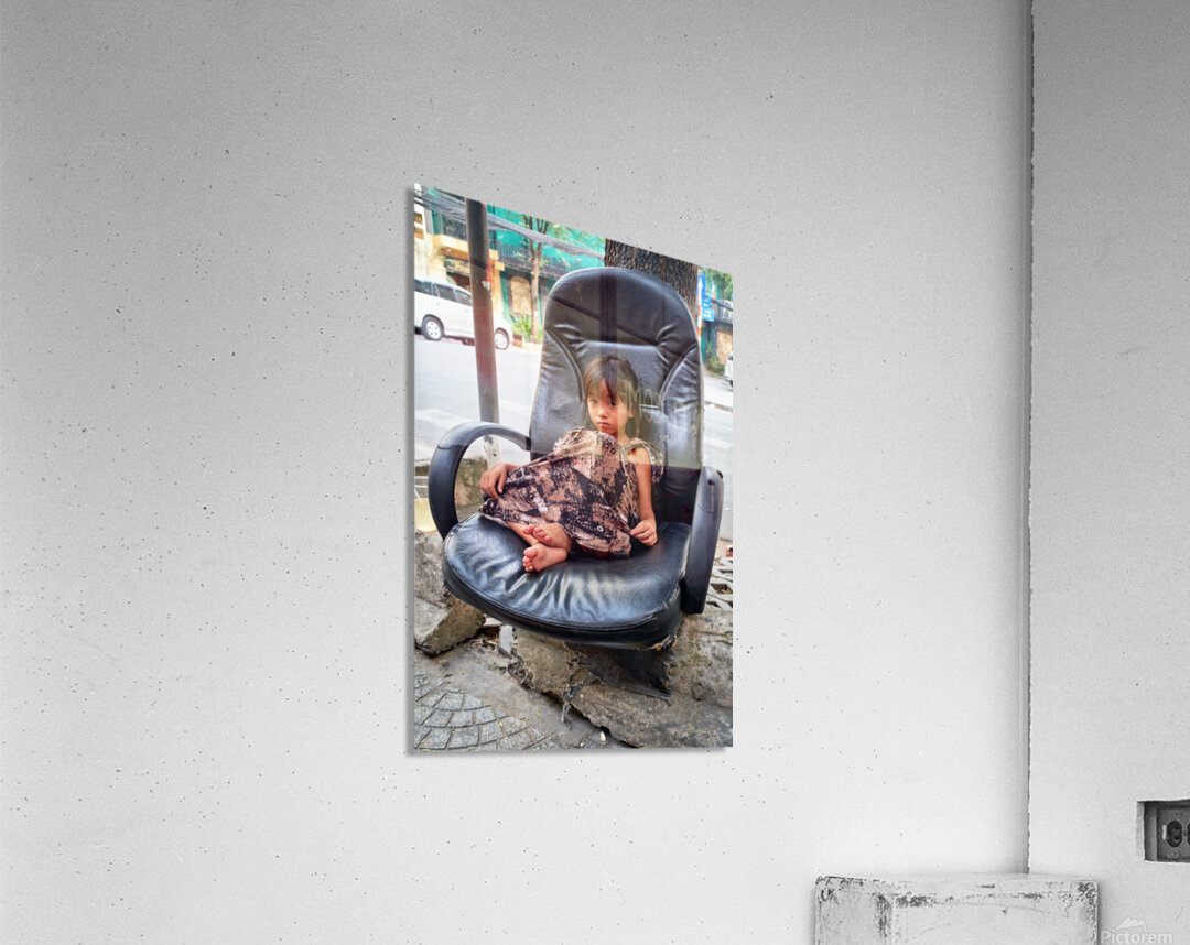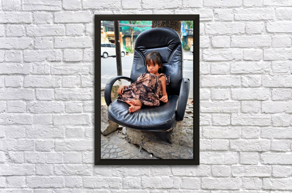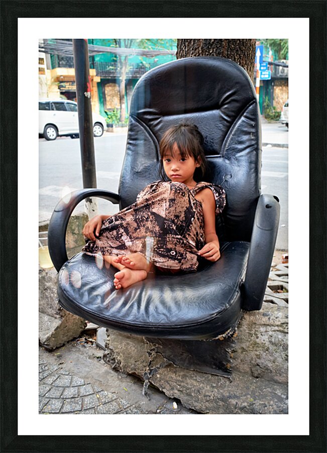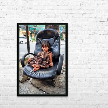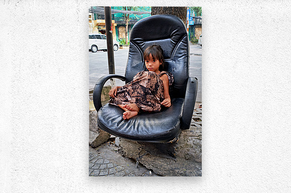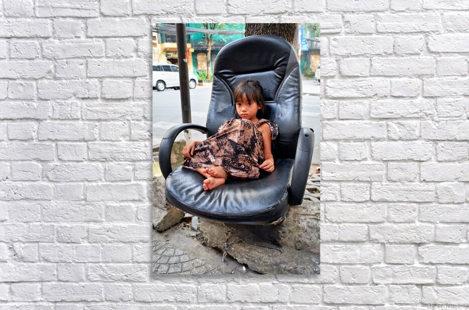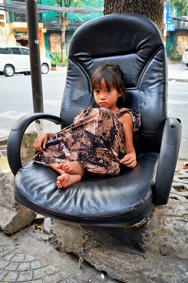 A young child sits on a worn-out chair beside the street in Ho Chi Minh City. The child appears to be relaxed and observing the surroundings.