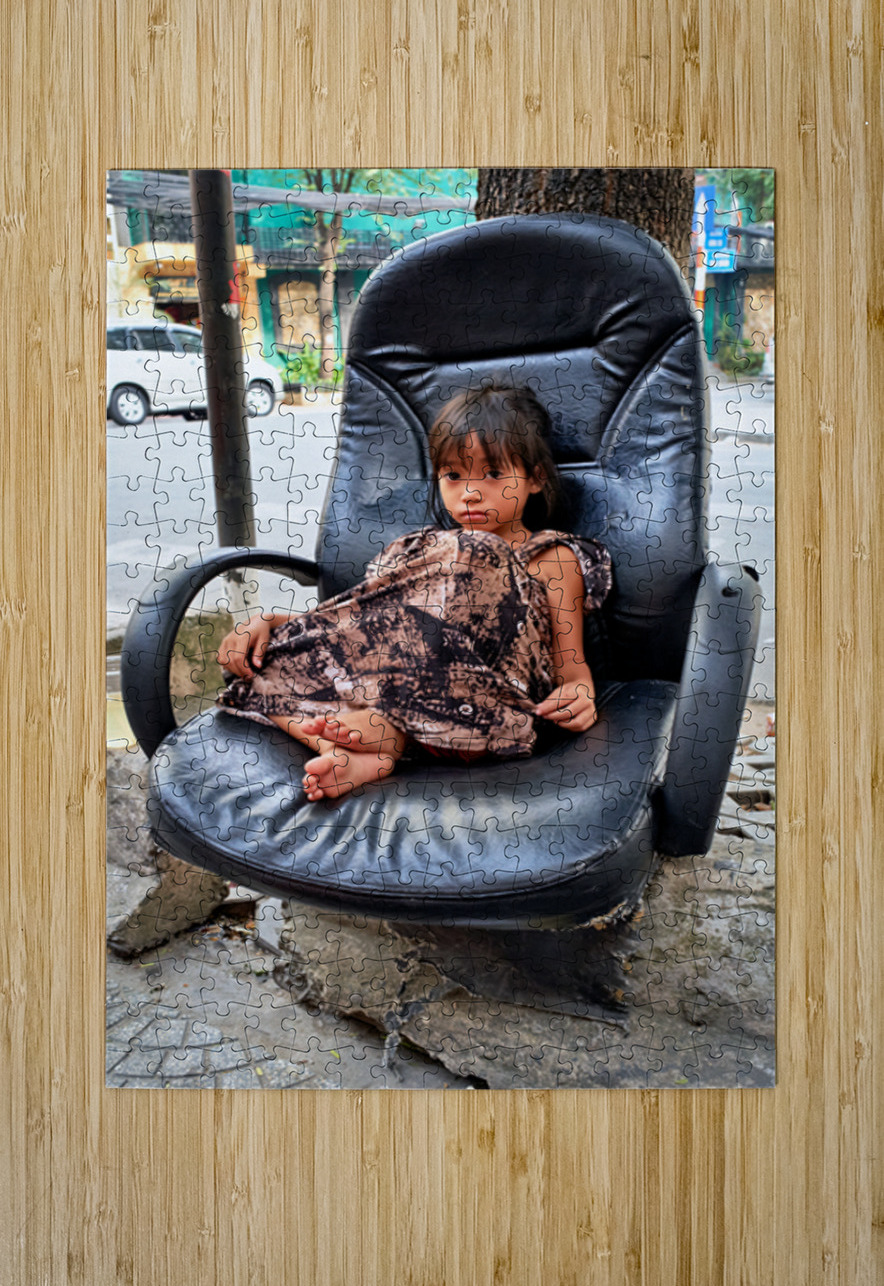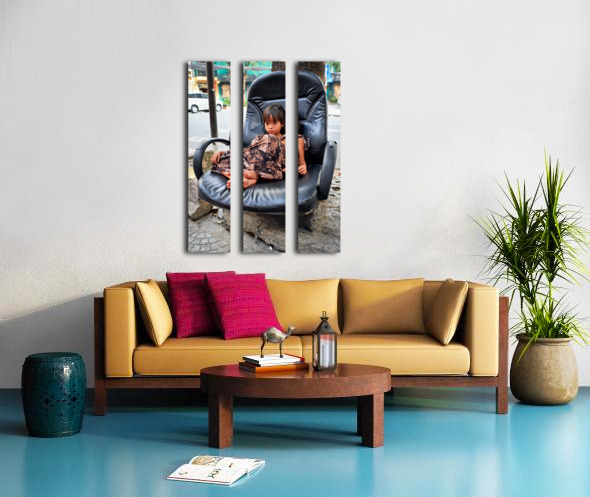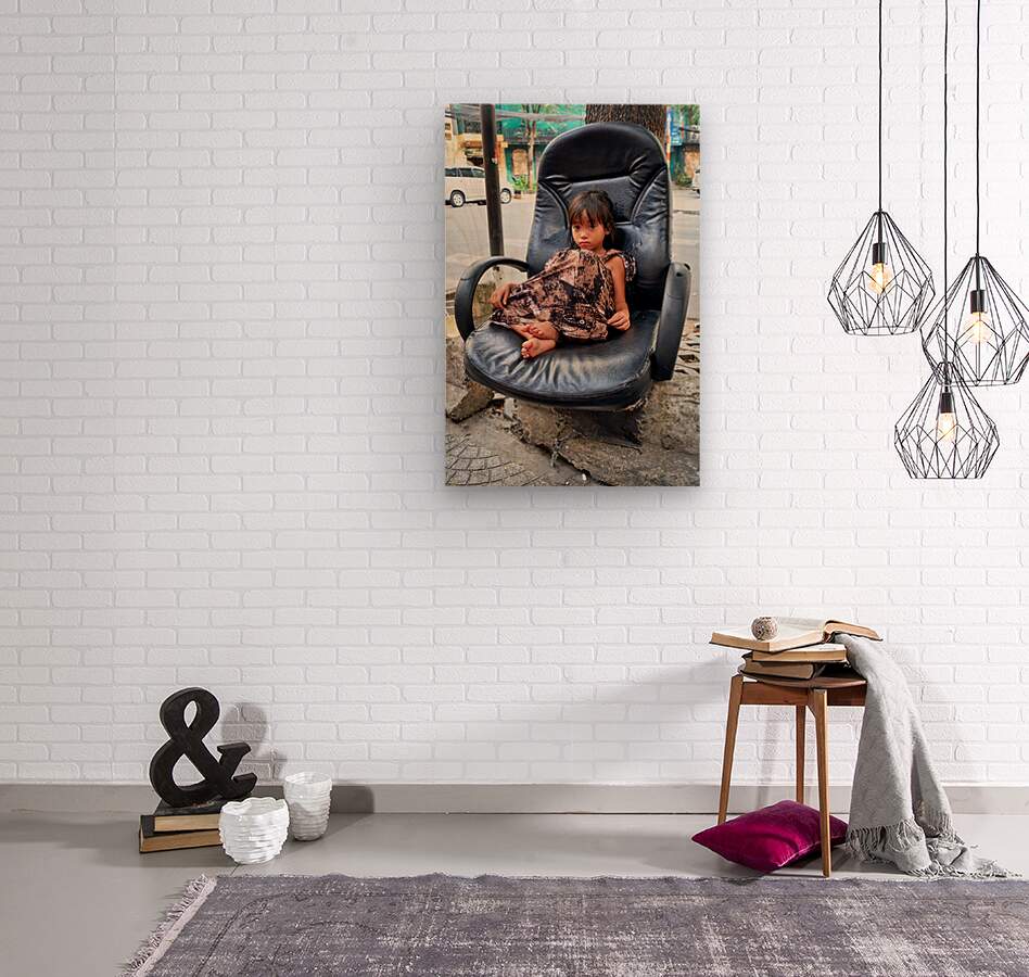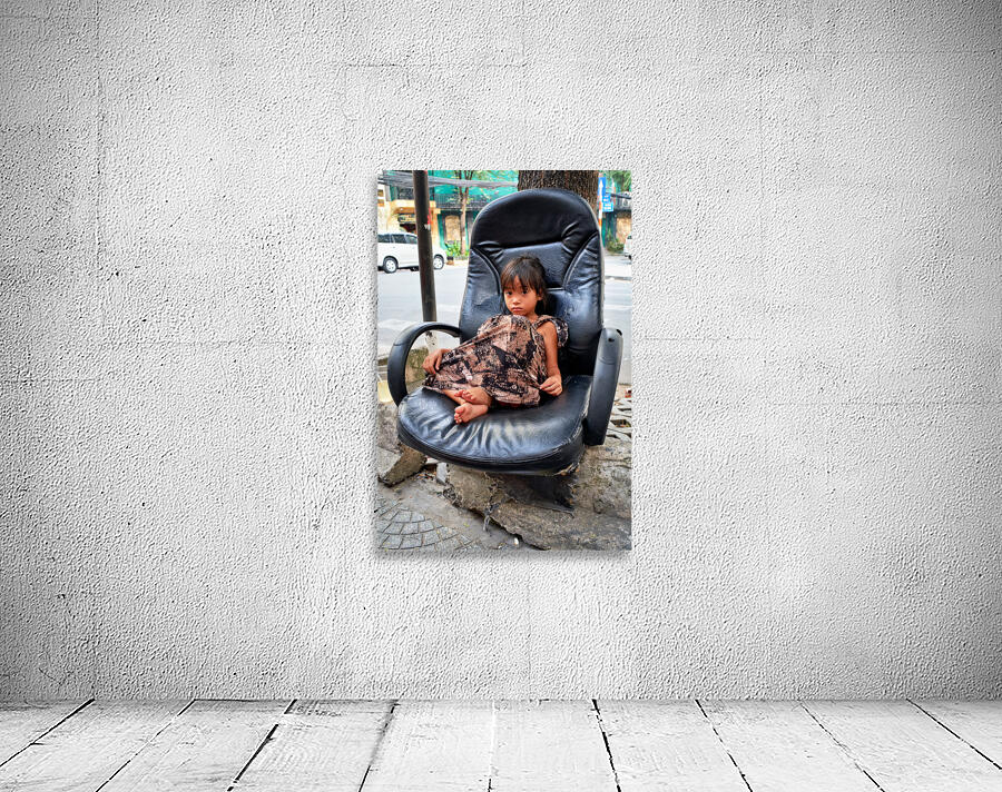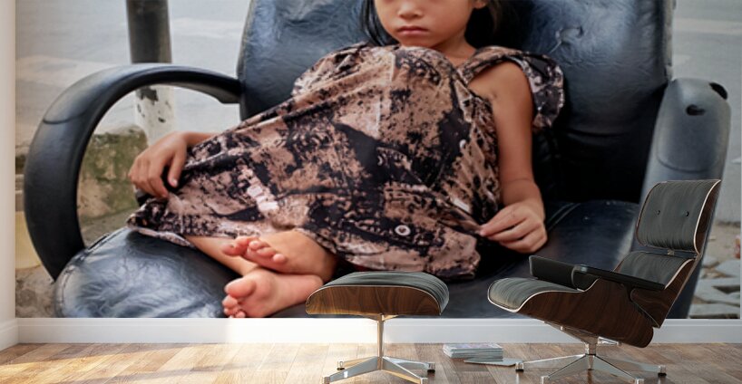 A young child sits on a worn-out chair beside the street in Ho Chi Minh City. The child appears to be relaxed and observing the surroundings.