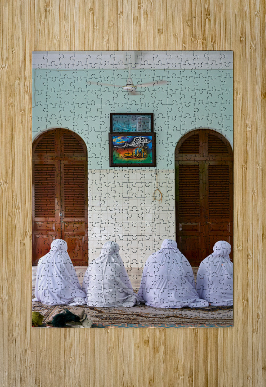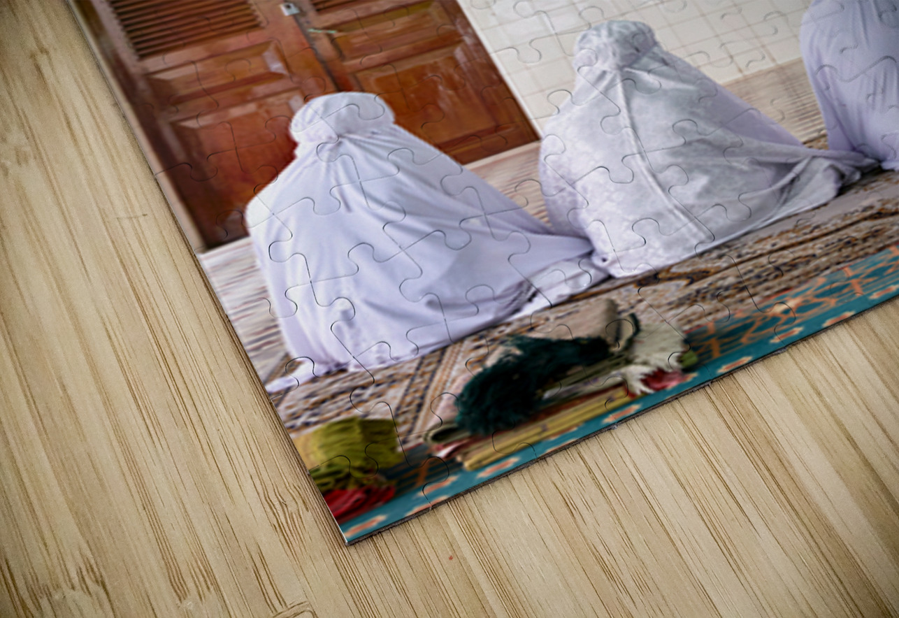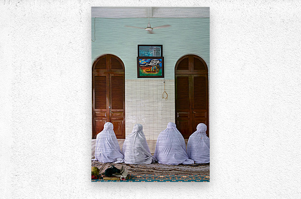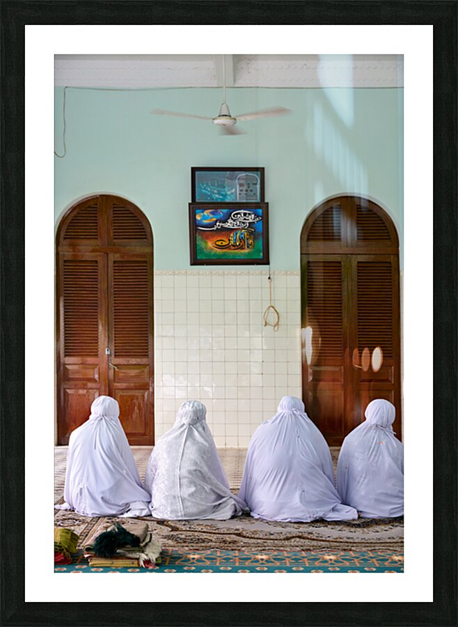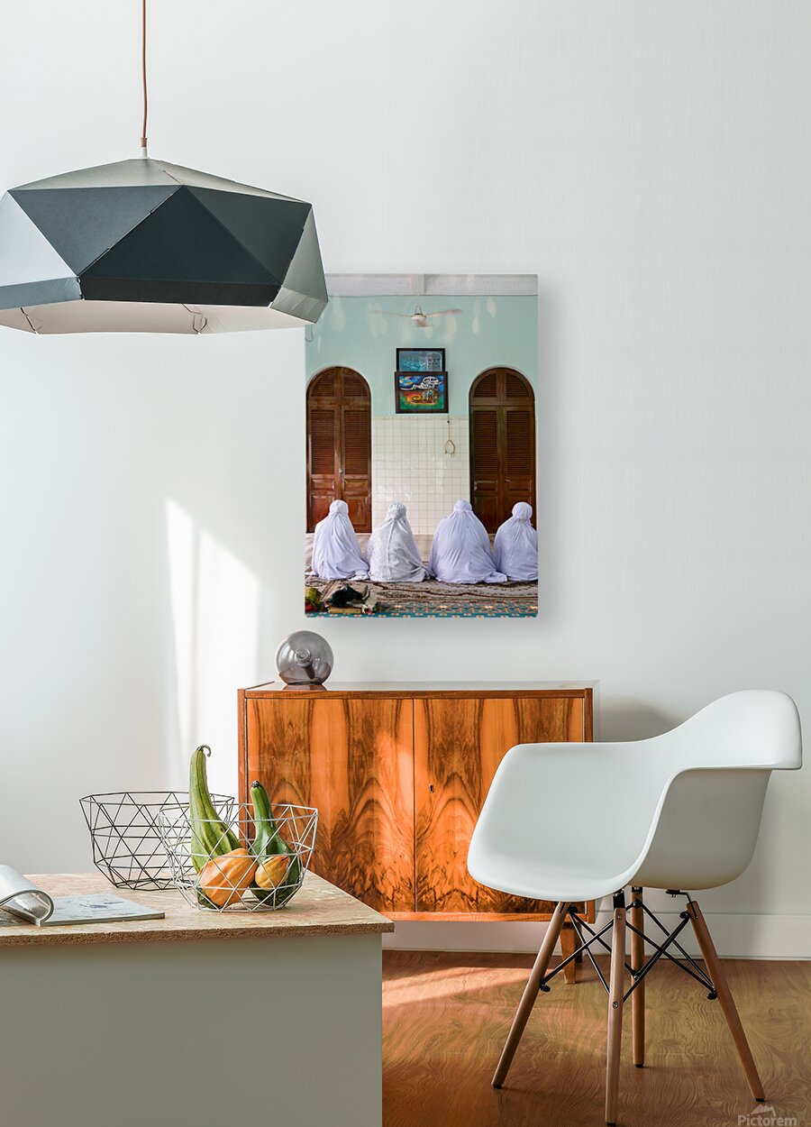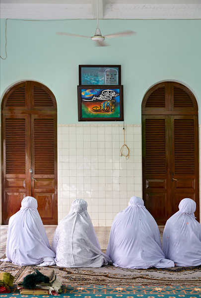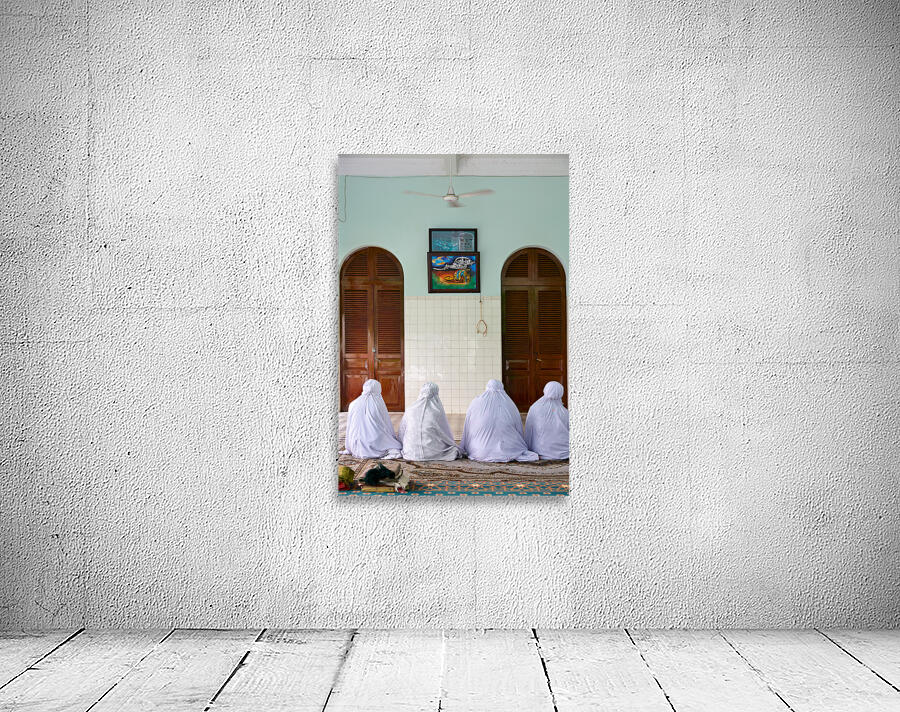 Women in white garments pray together in a simple room in Ho Chi Minh City. Their focus is on the wall with art.