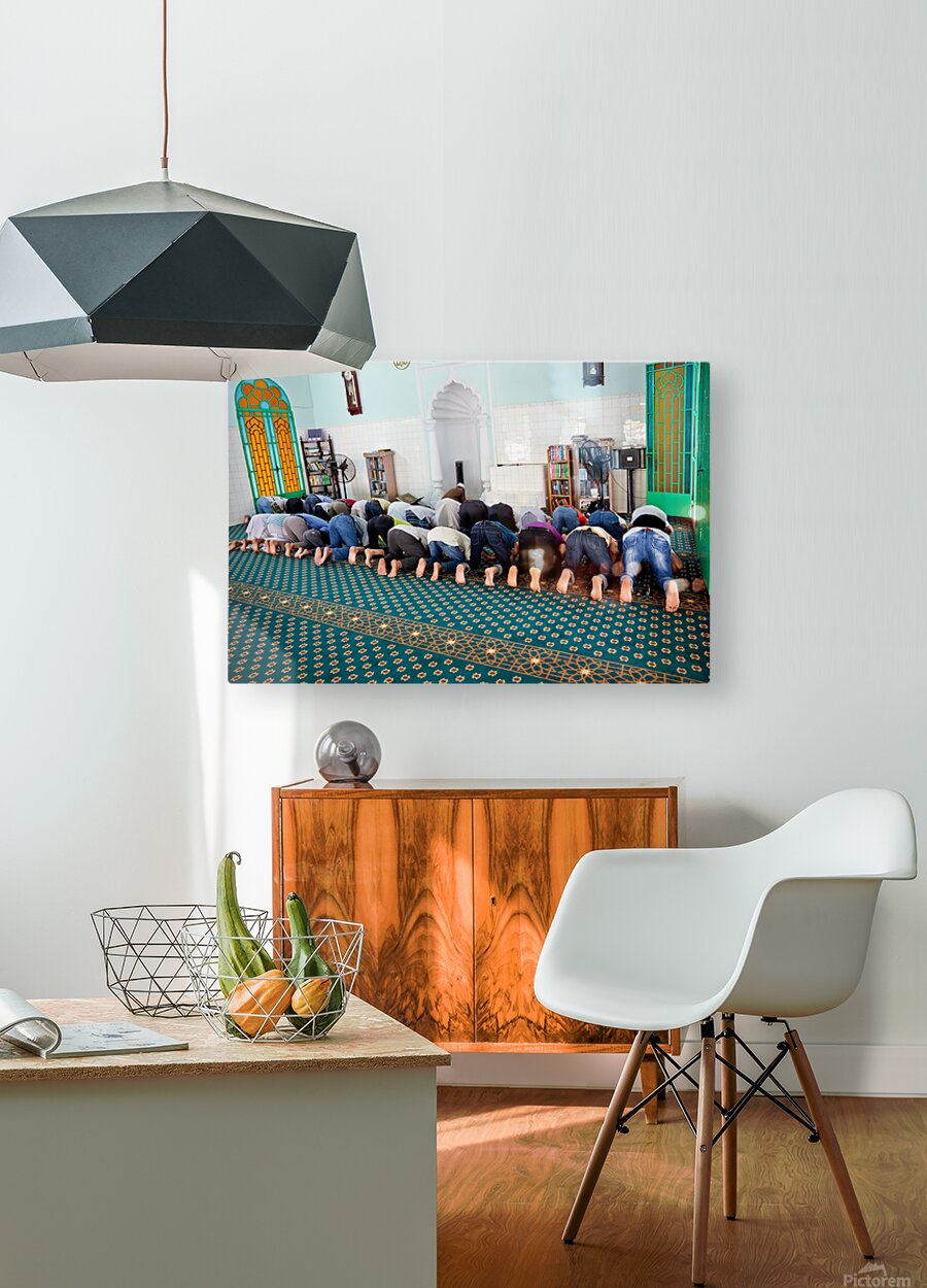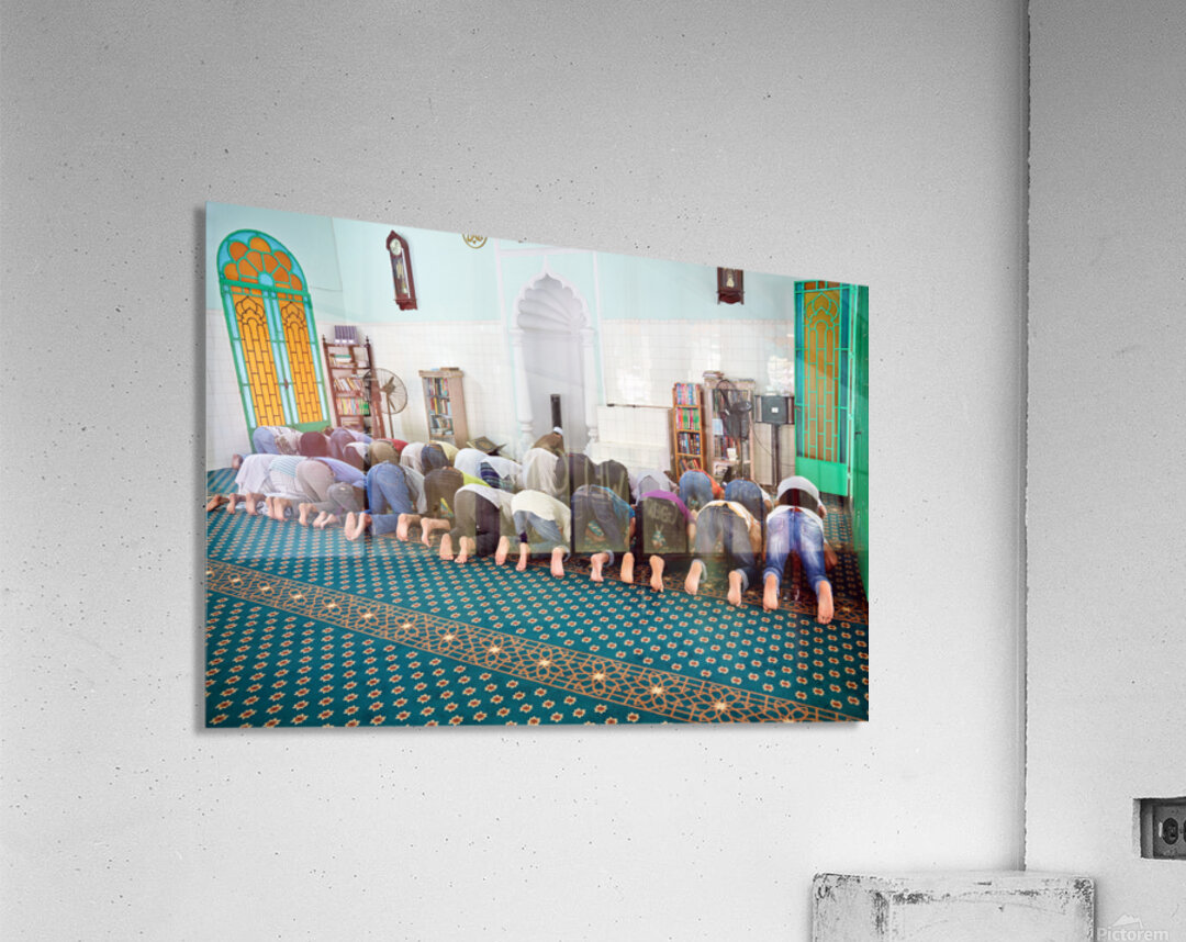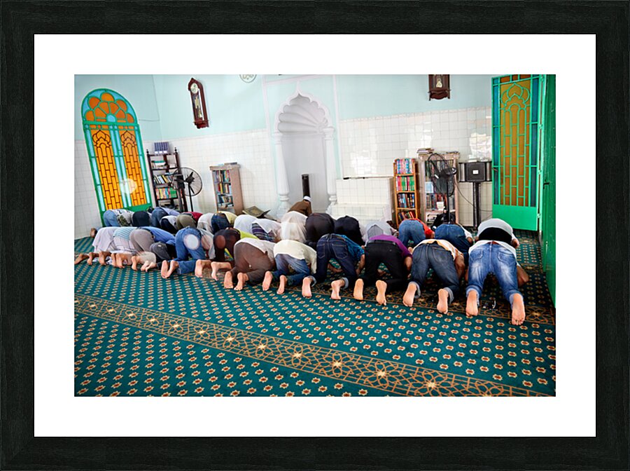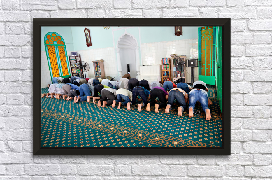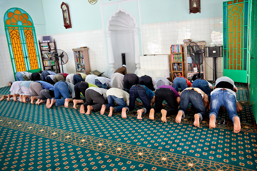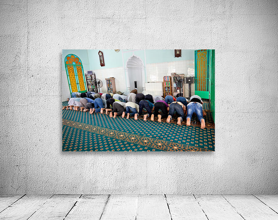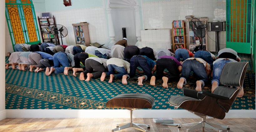 Groups of men are praying inside a mosque in Ho Chi Minh City. The time appears to be during a prayer session.