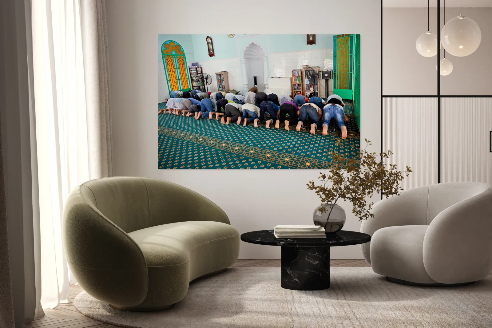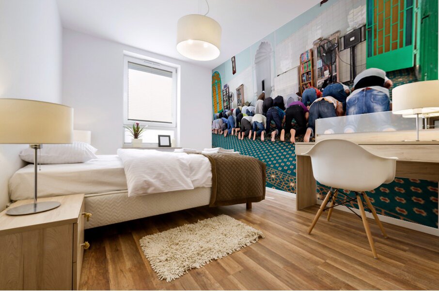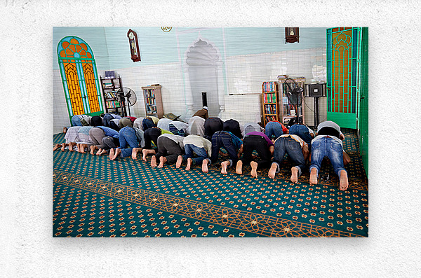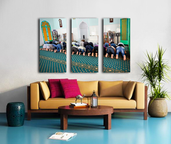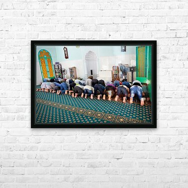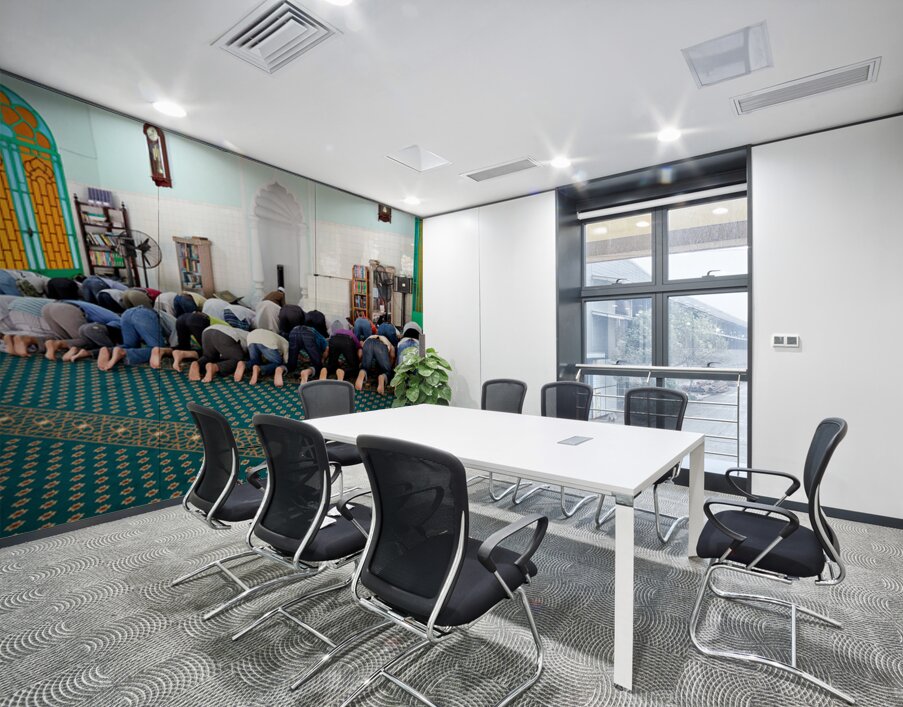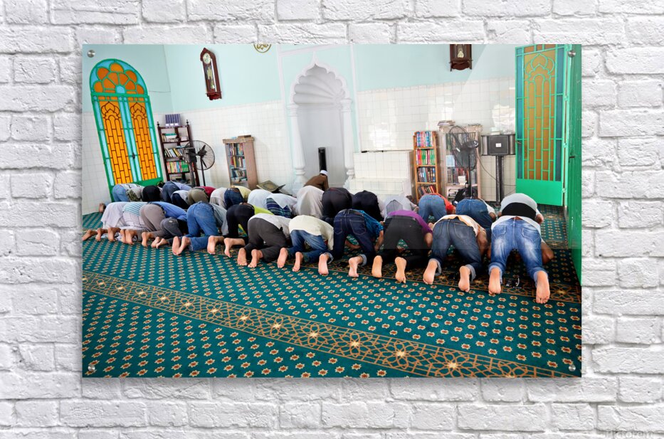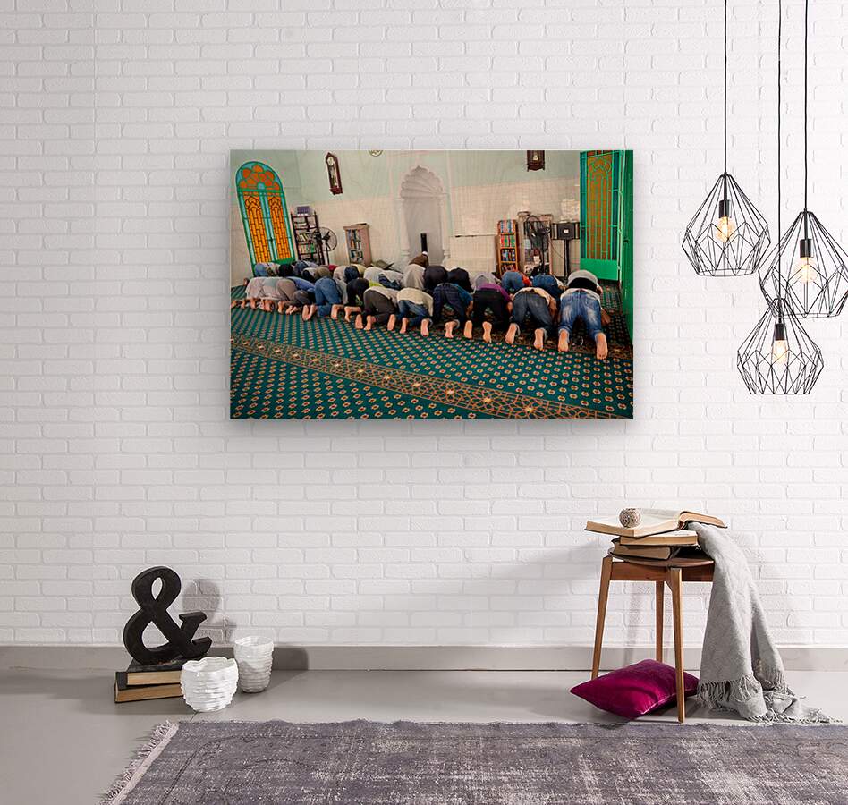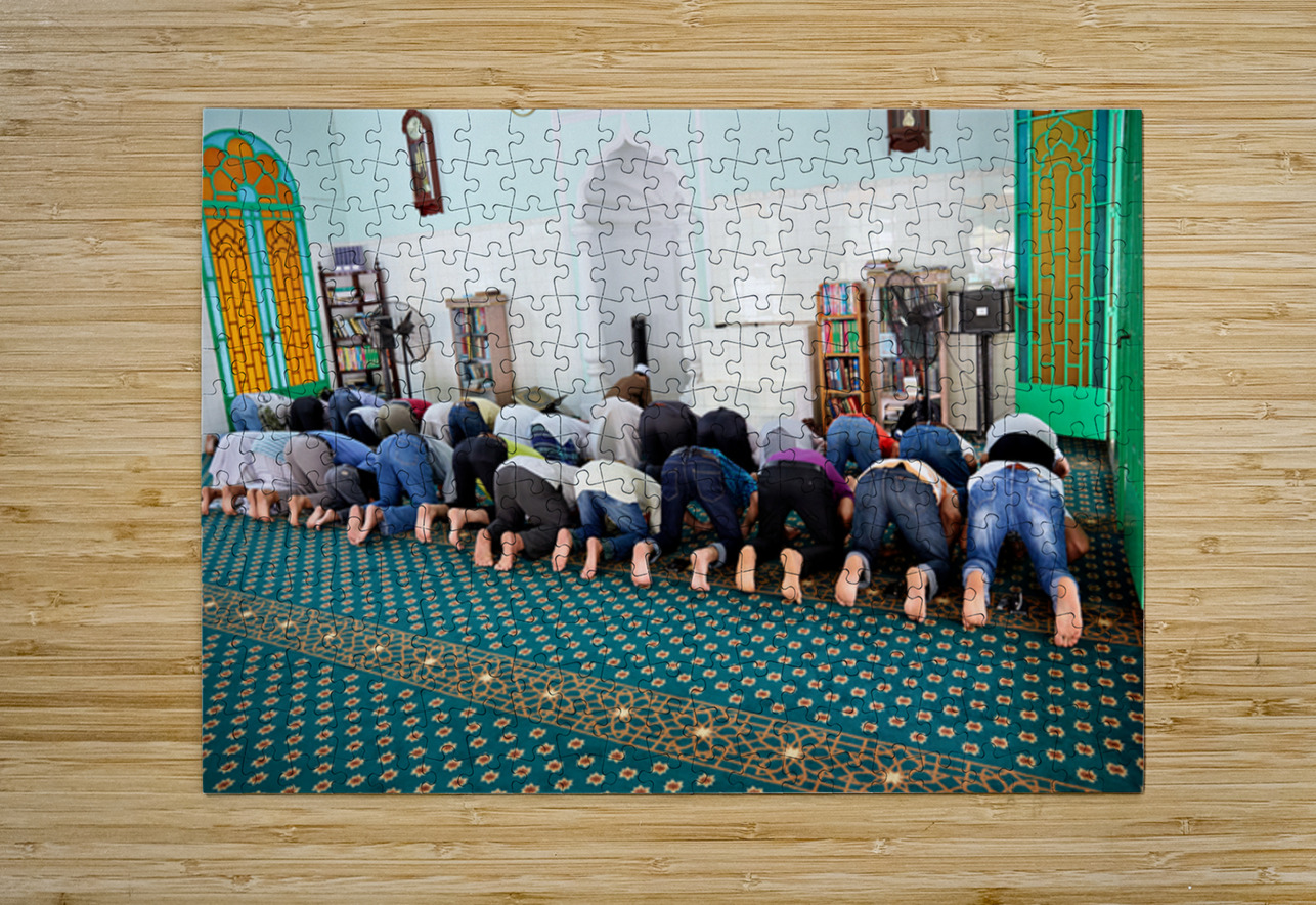 Groups of men are praying inside a mosque in Ho Chi Minh City. The time appears to be during a prayer session.