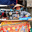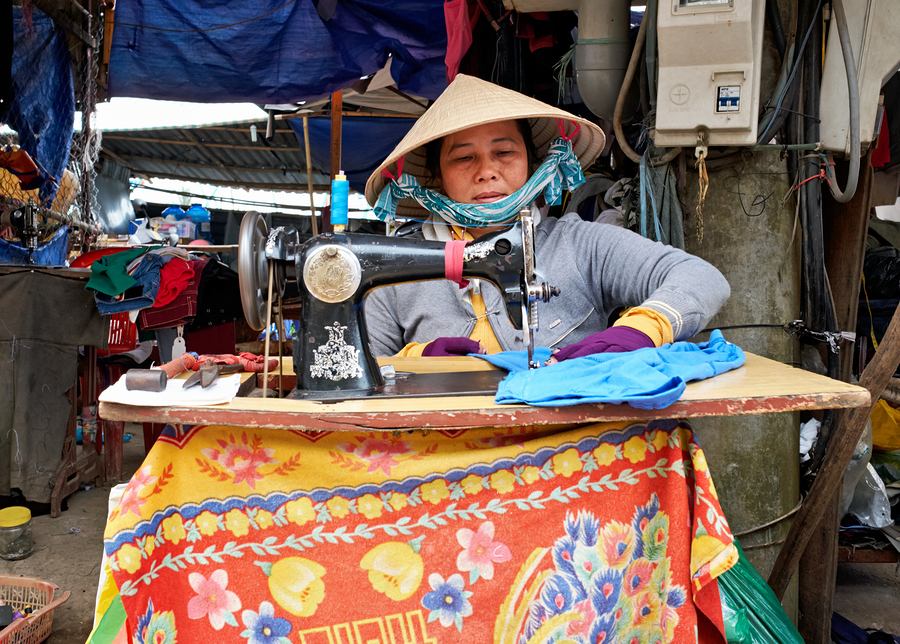 A woman is sewing clothes in a market in Phu Quoc. She wears a conical hat and is focused on her work surrounded by fabrics.