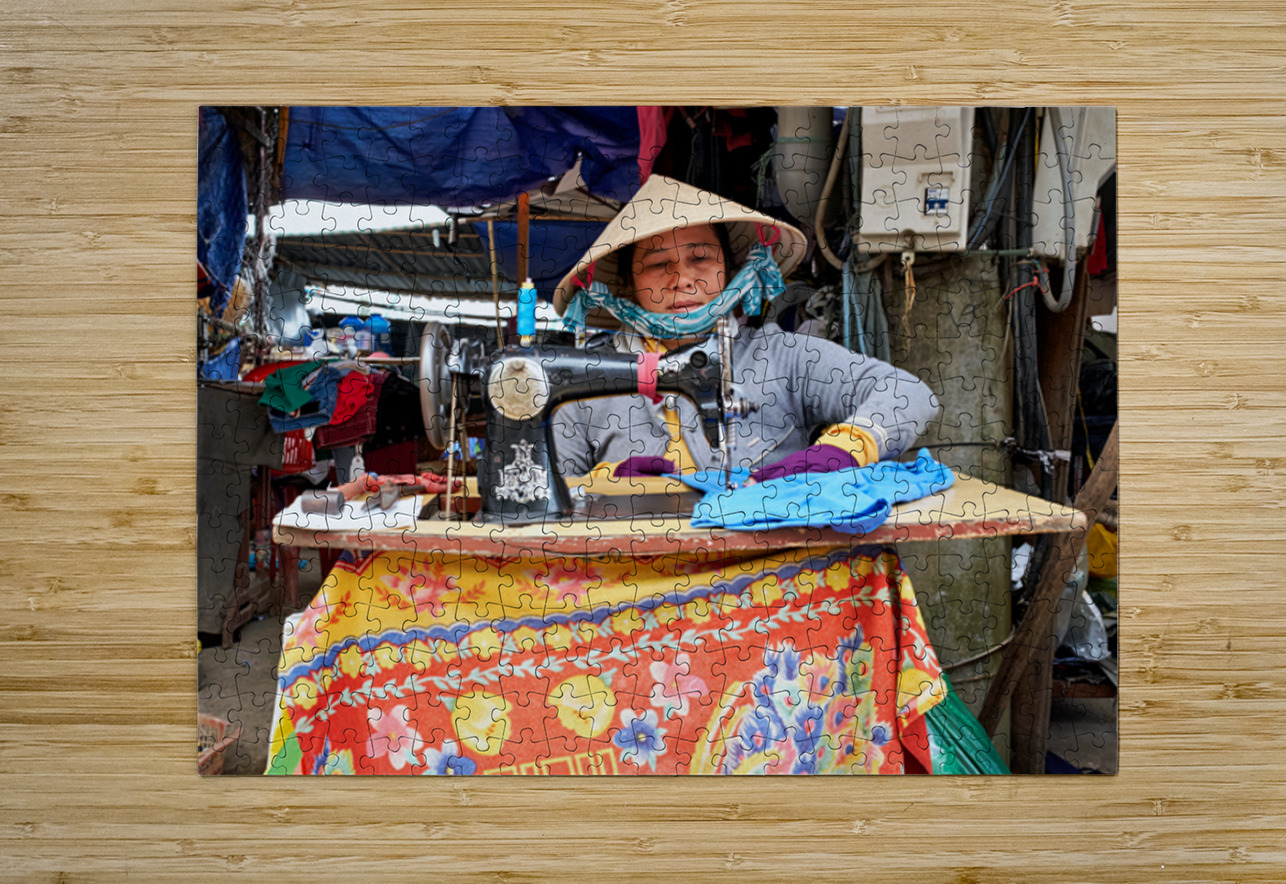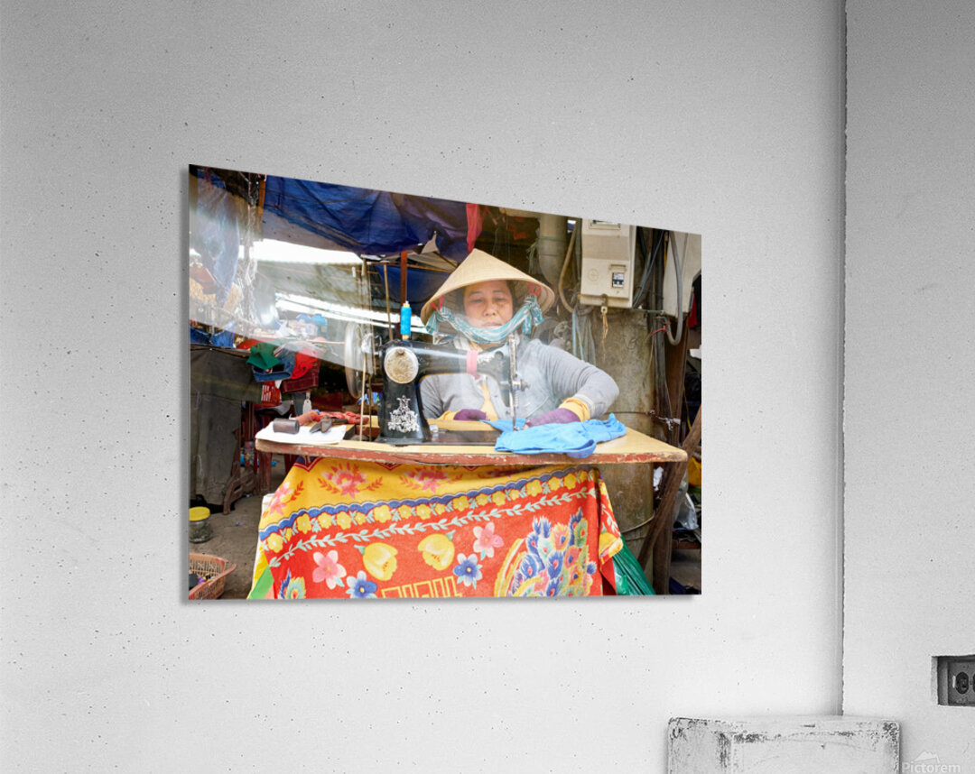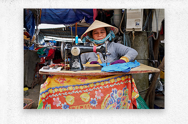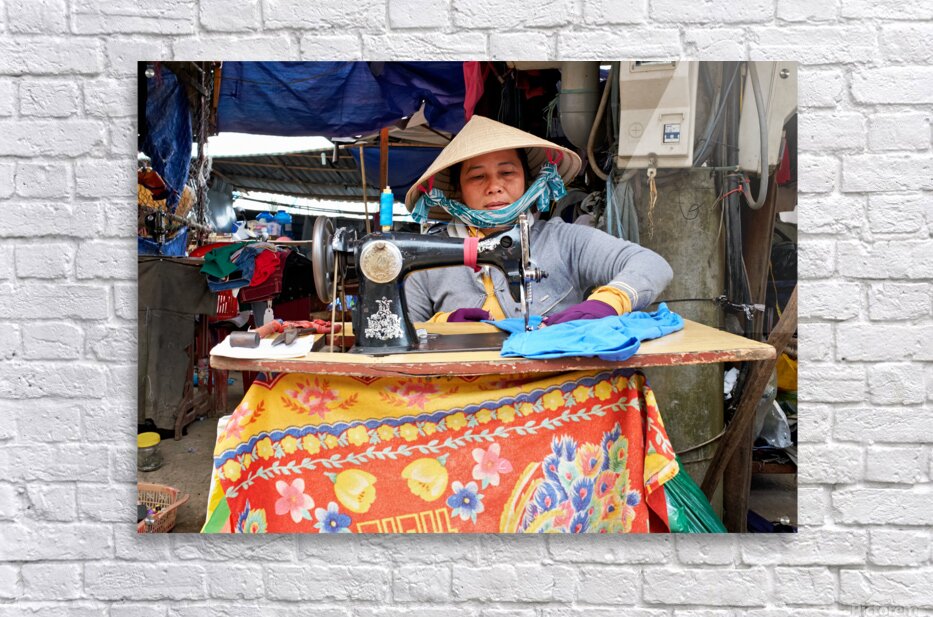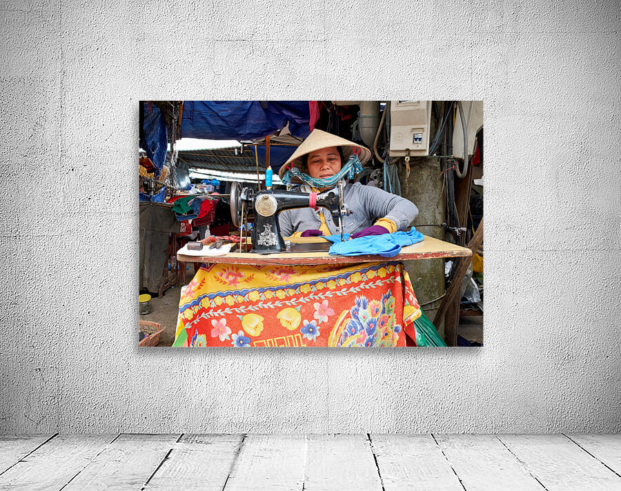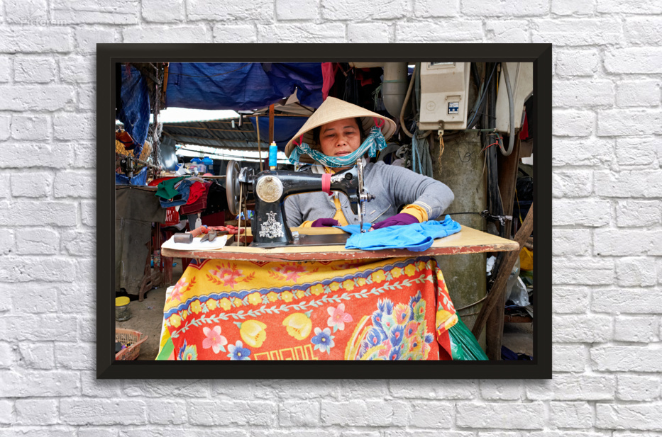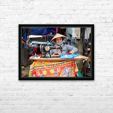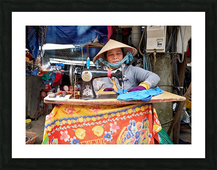 "Woman sewing at a market in Phu Quoc Vietnam during the day" in a framed print.