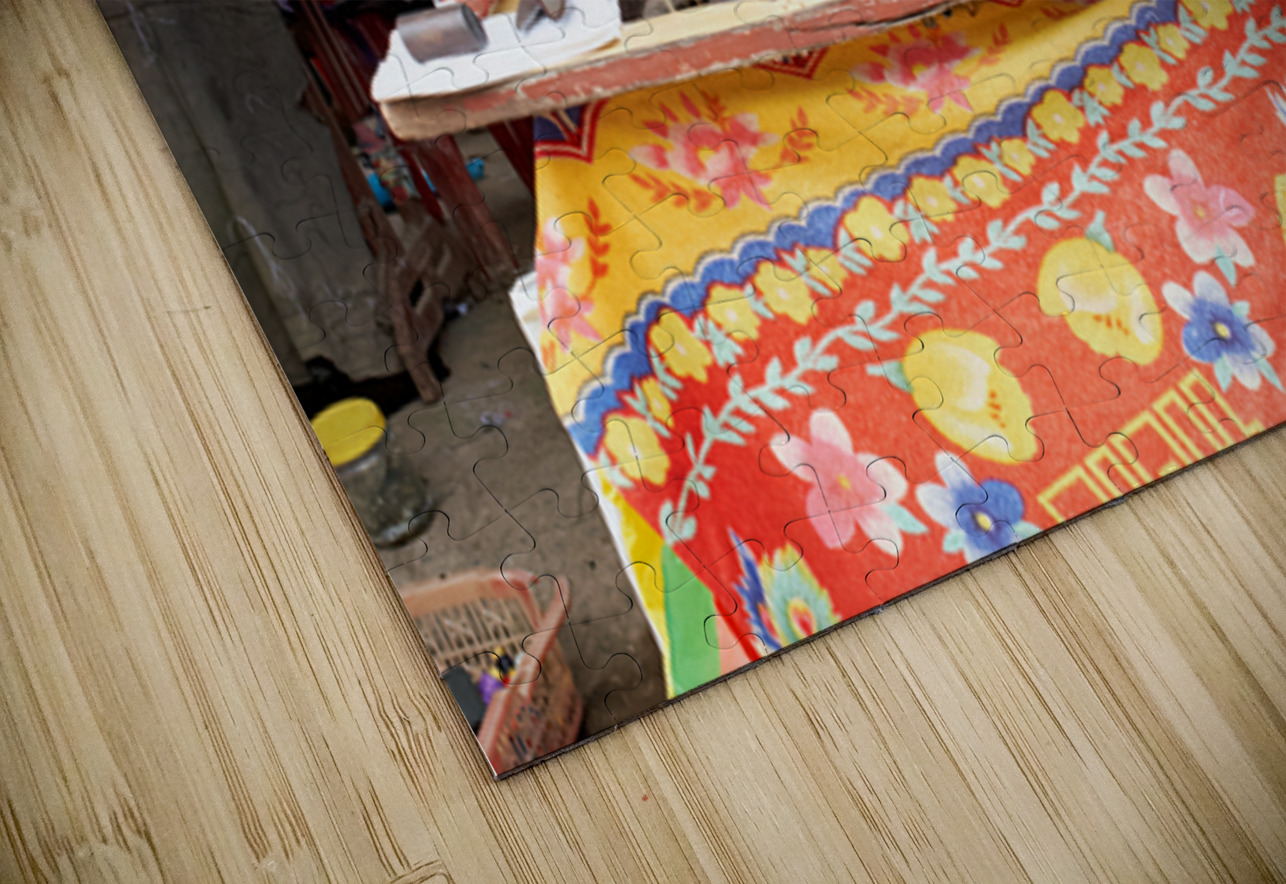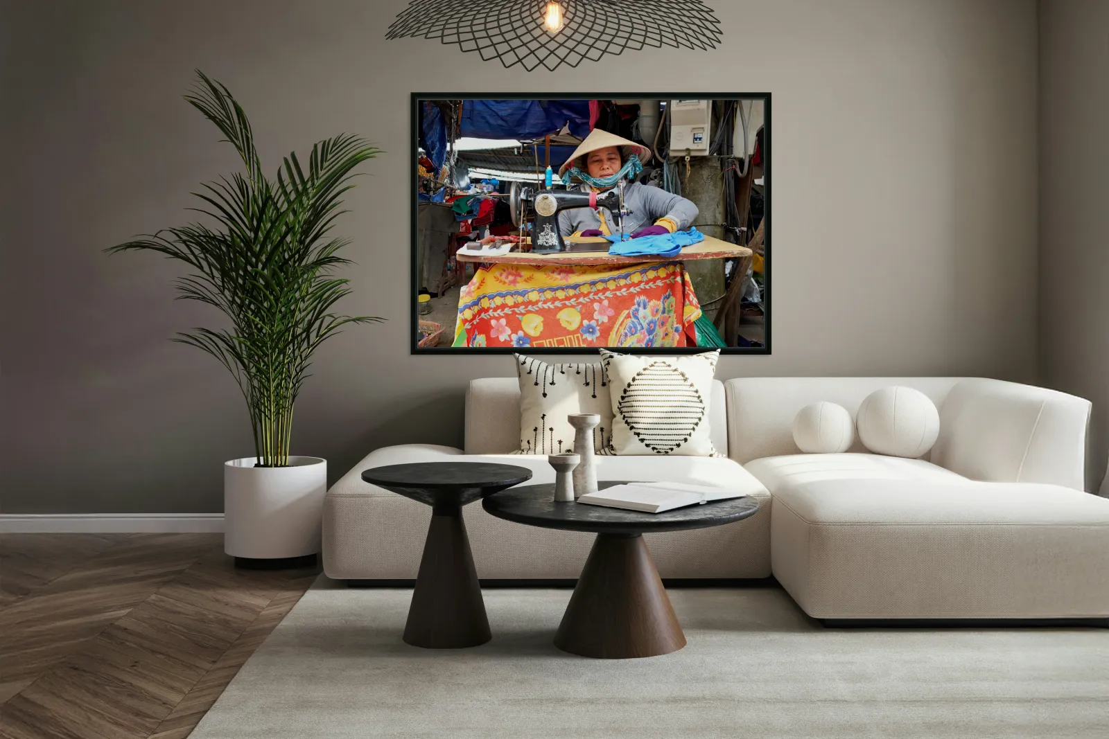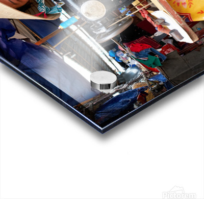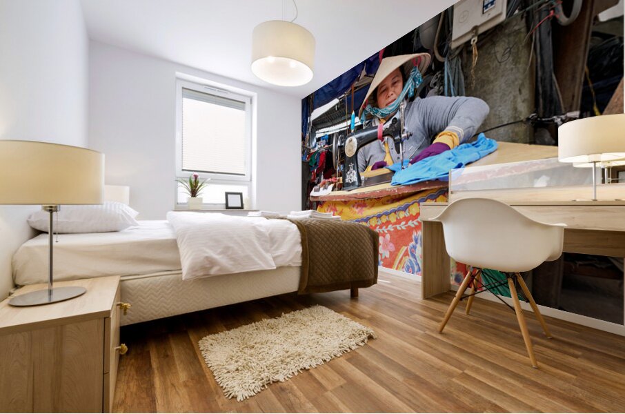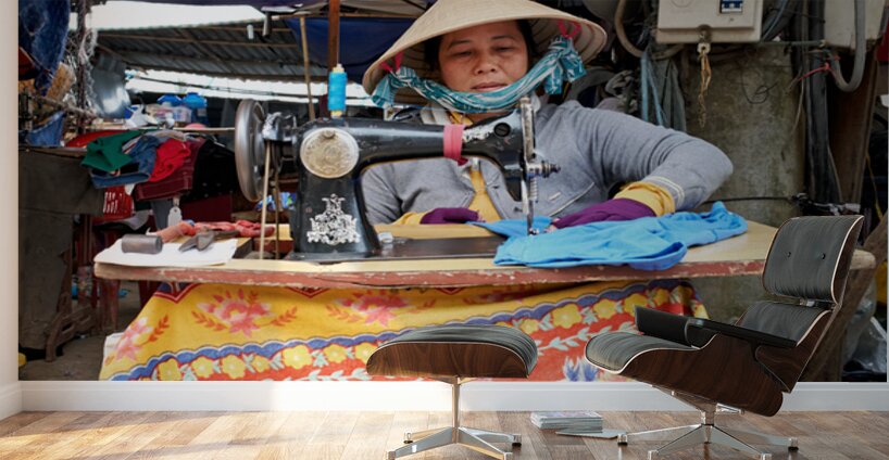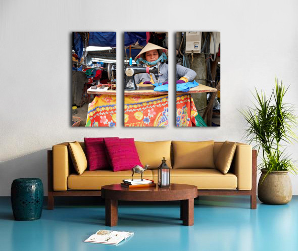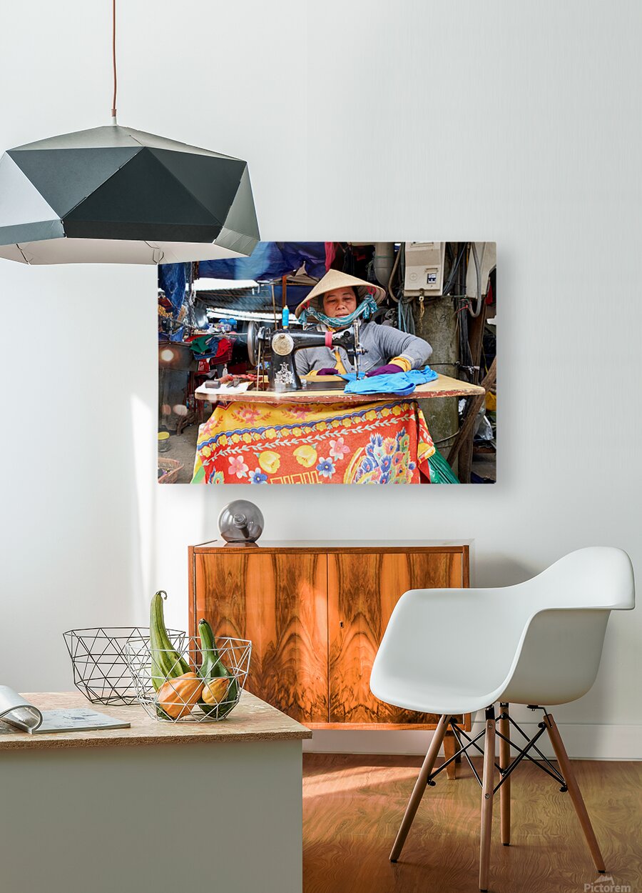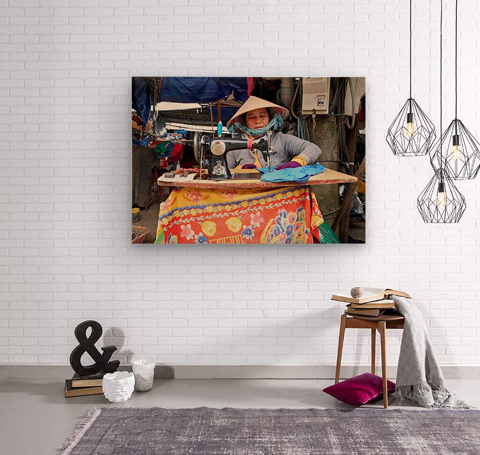"Woman sewing at a market in Phu Quoc Vietnam during the day" in a framed print.
