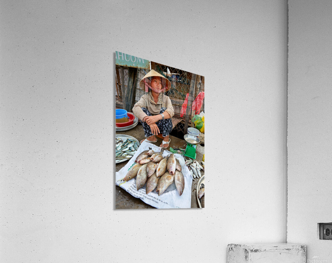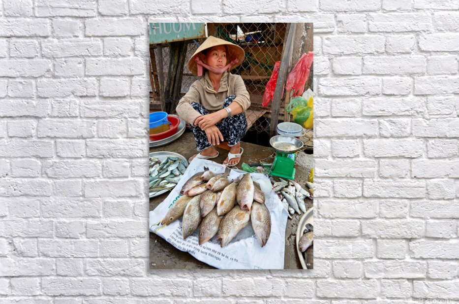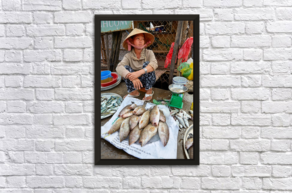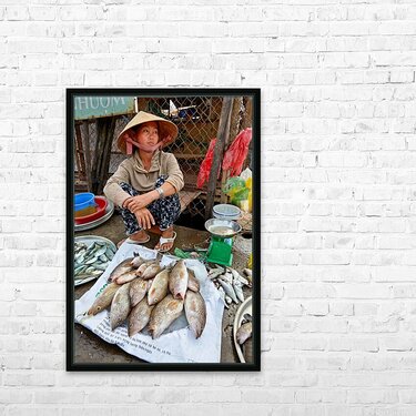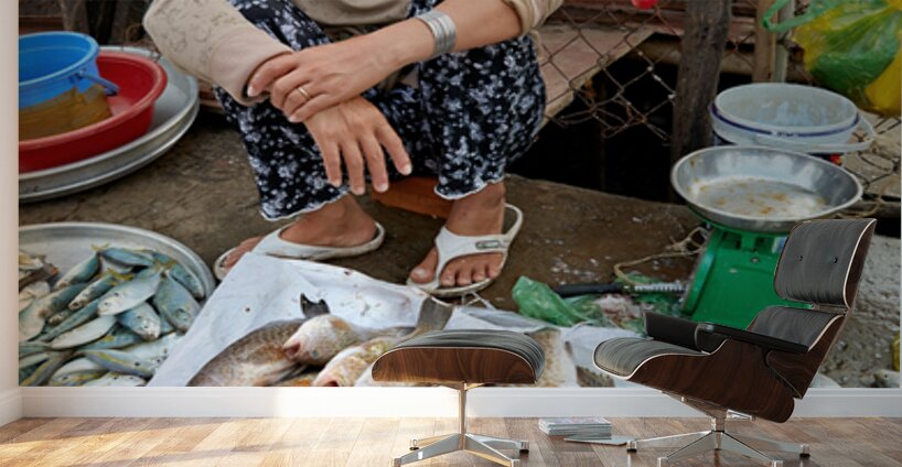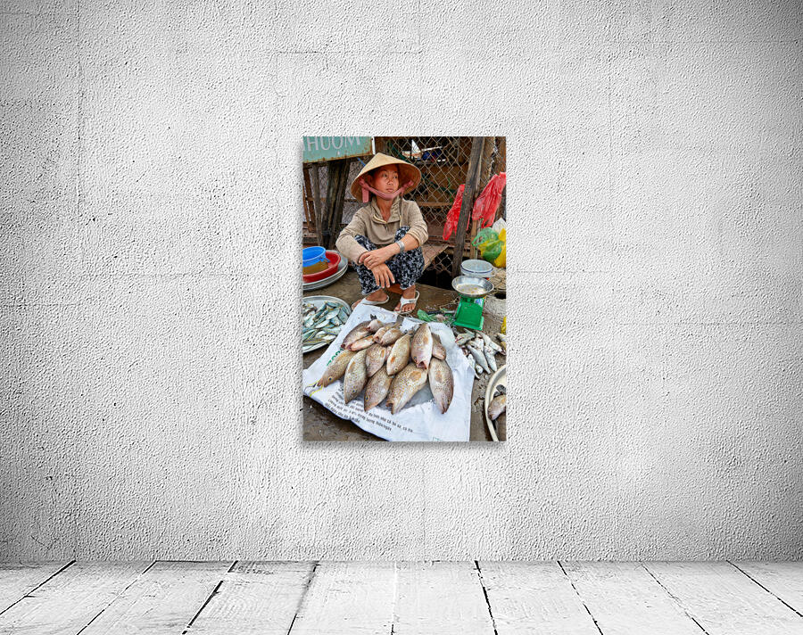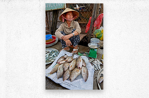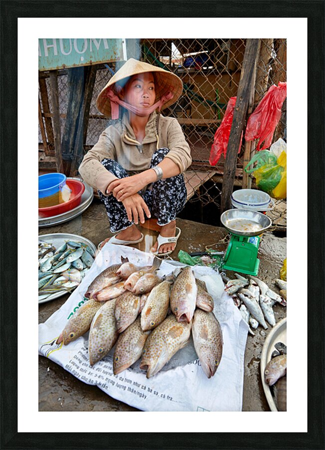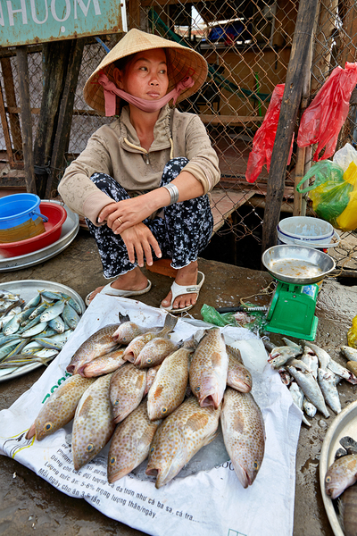 A woman sells fish at a market in Phu Quoc Vietnam. She is sitting on the ground and looking around while surrounded by fish.