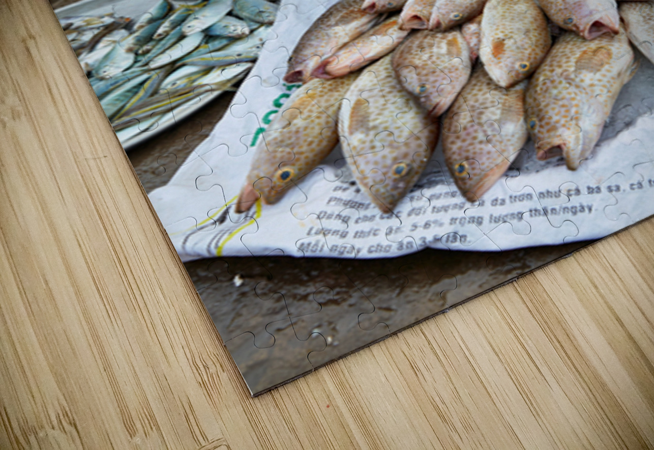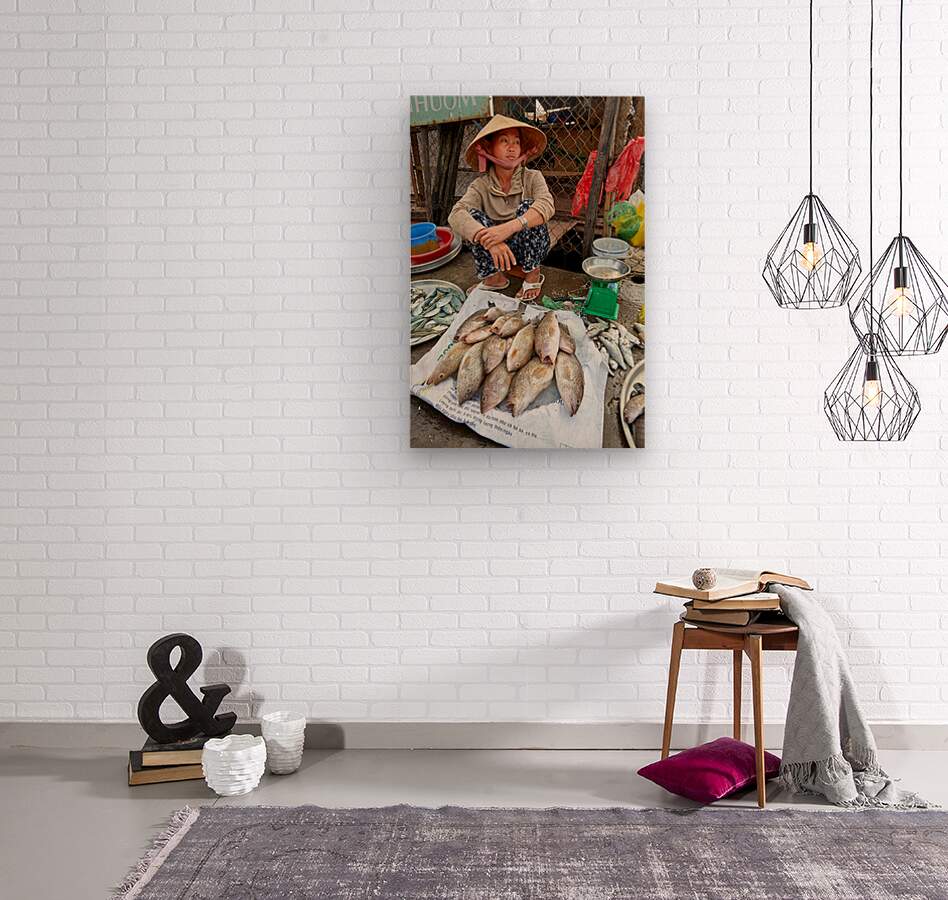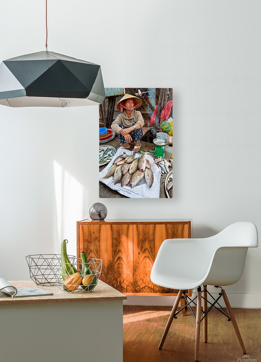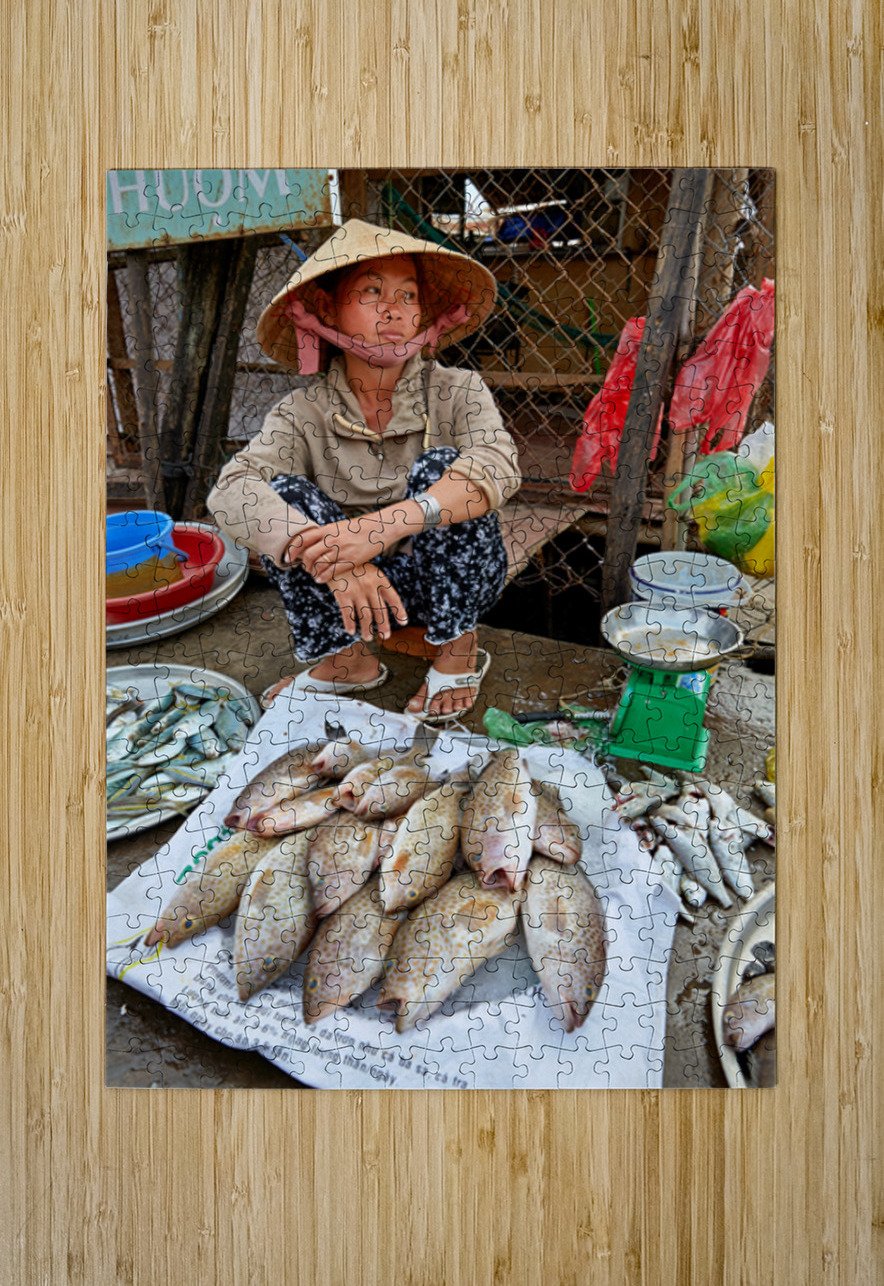 A woman sells fish at a market in Phu Quoc Vietnam. She is sitting on the ground and looking around while surrounded by fish.