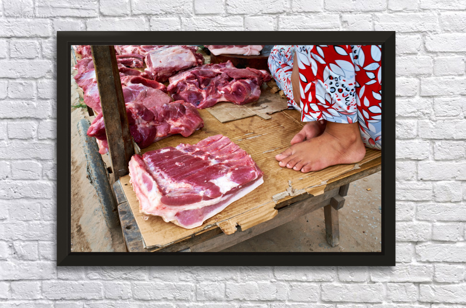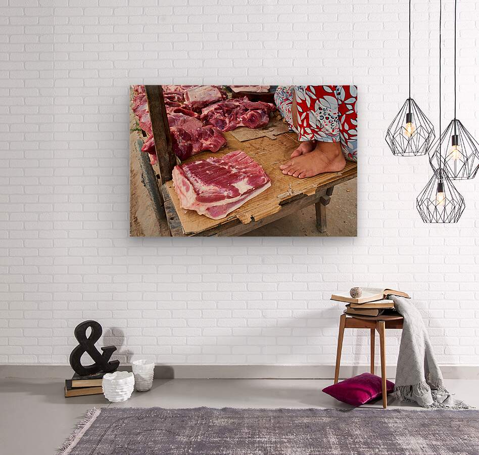 A vendor sits by fresh pork cuts at a market in Phu Quoc Vietnam. The stall is busy with local shoppers looking for meat.