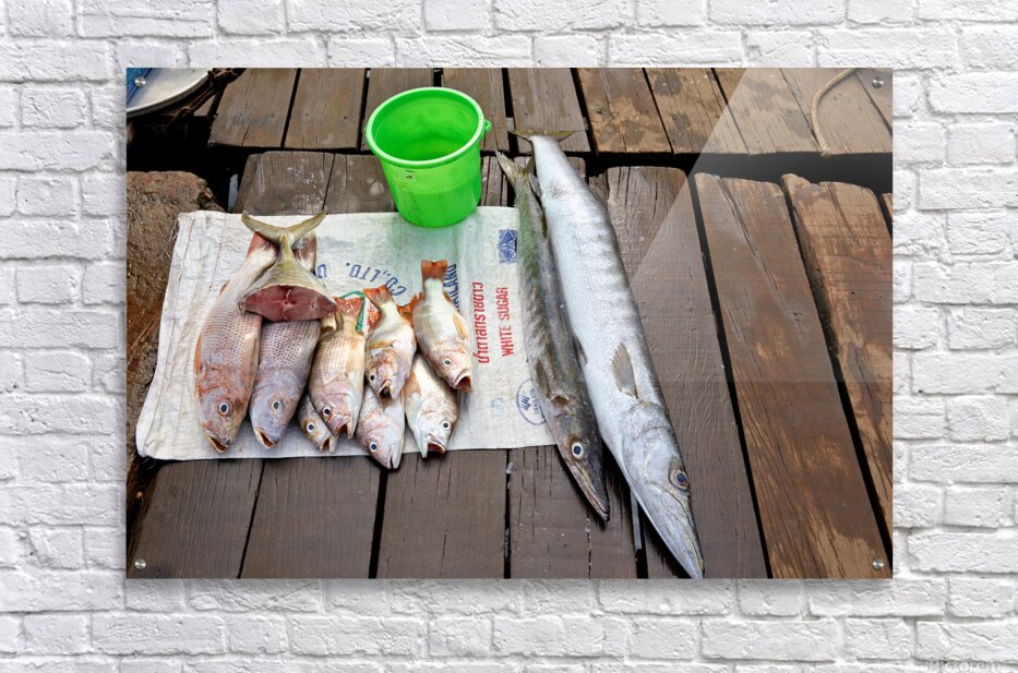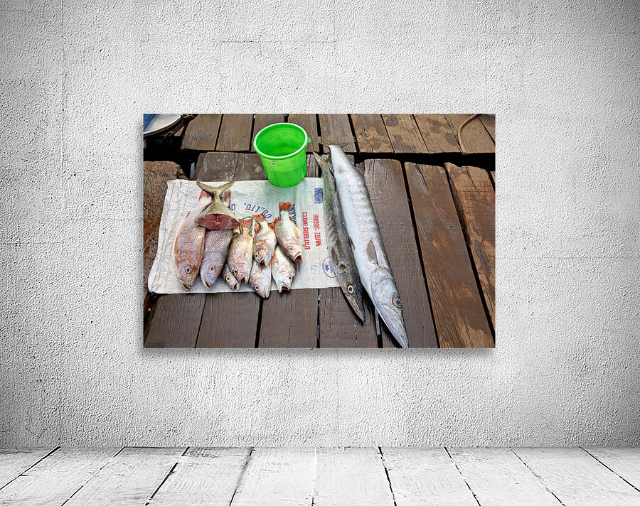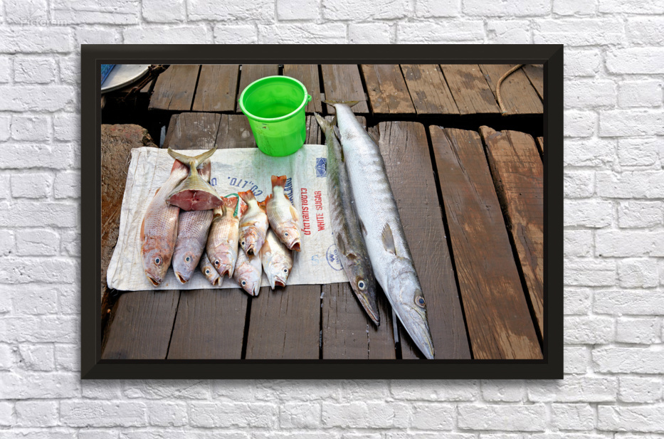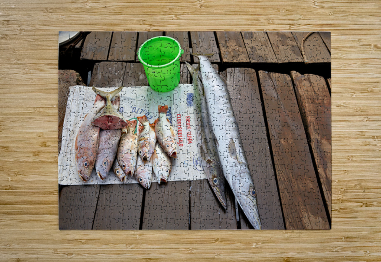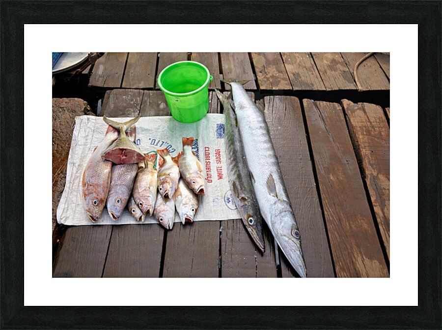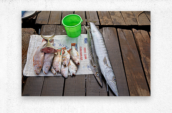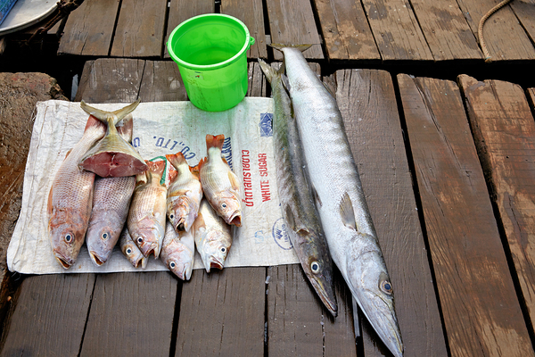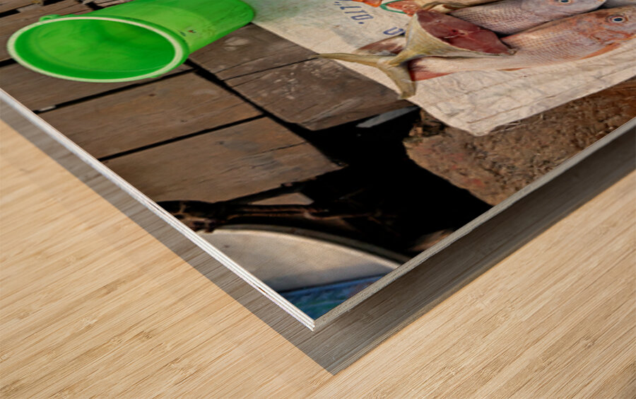 Fishermen display fresh fish on wooden planks in Phu Quoc. They prepare for cooking and selling. A green bucket is nearby.