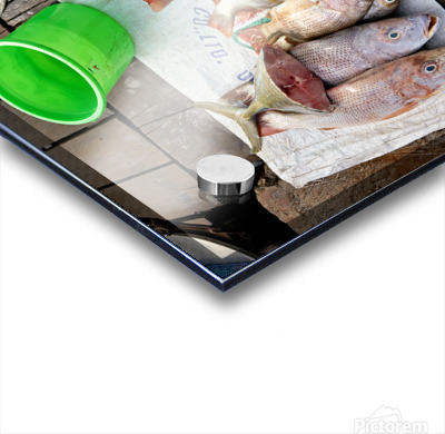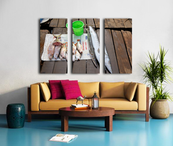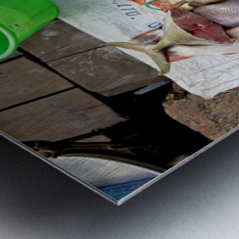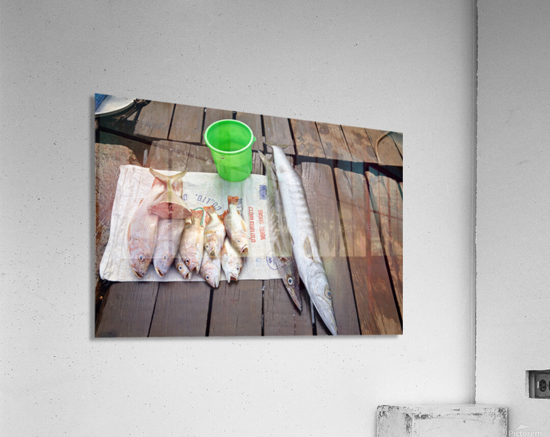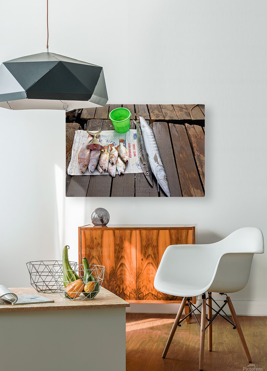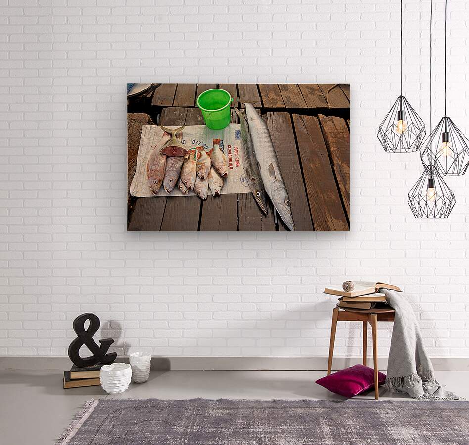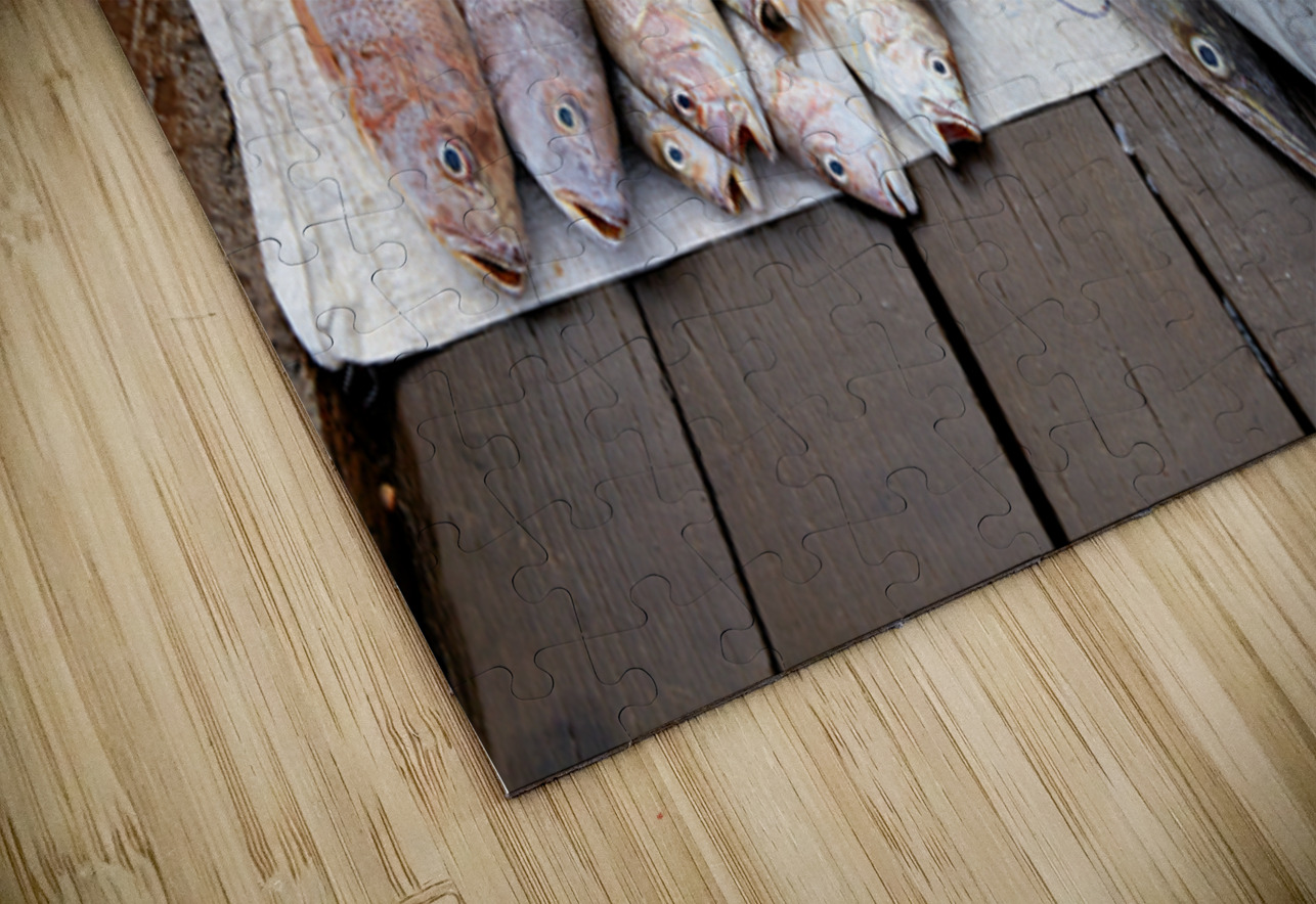Fishermen display fresh fish on wooden planks in Phu Quoc. They prepare for cooking and selling. A green bucket is nearby.