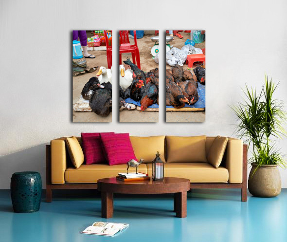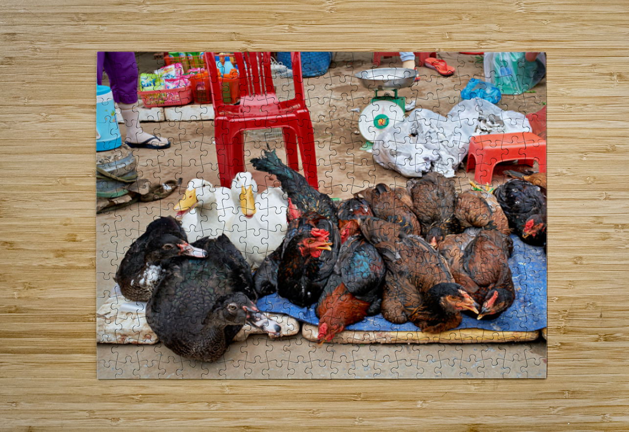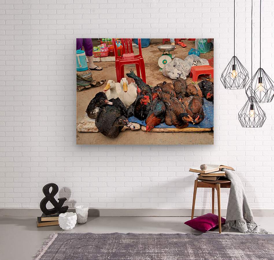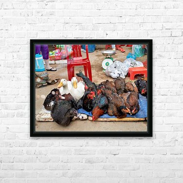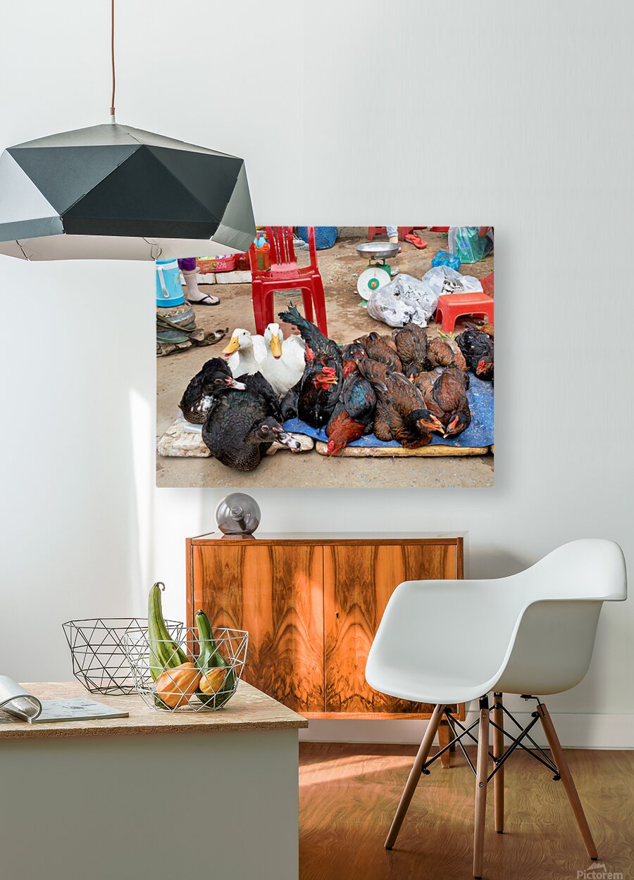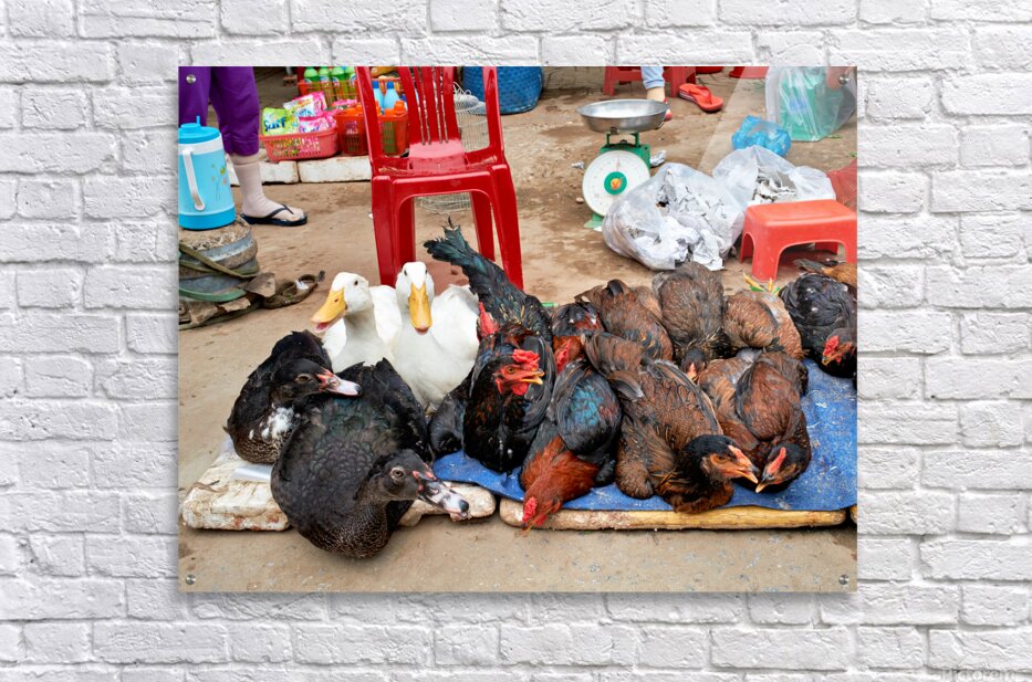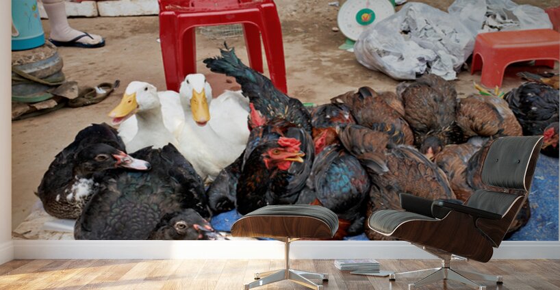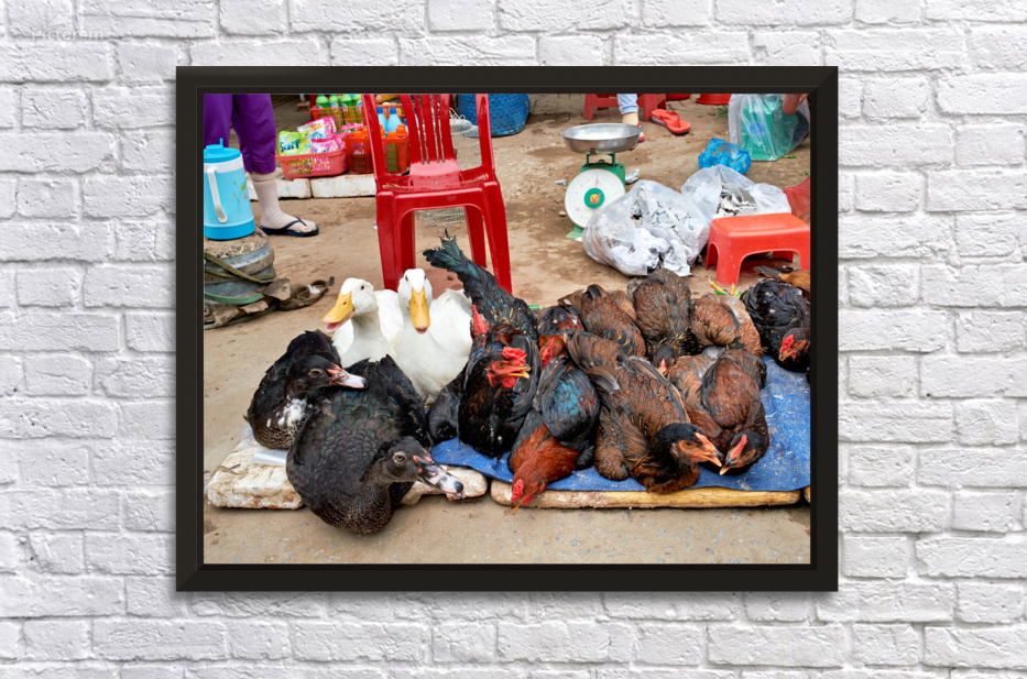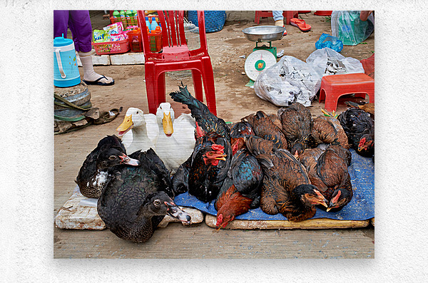 Ducks and chickens are displayed for sale in a market in Phu Quoc Vietnam. People walk around and shop for fresh food.