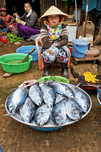 A woman sits at a market in Phu Quoc Vietnam holding fresh fish. Other people are nearby engaging in activities related to the market.