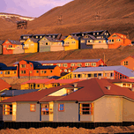 Buildings in Longyearbyen glow under the sunset. The arrangement shows various colors and shapes of the houses in this Arctic town.