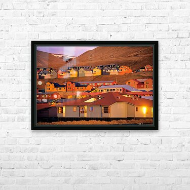 Colorful buildings in Longyearbyen Svalbard at sunset Frame print